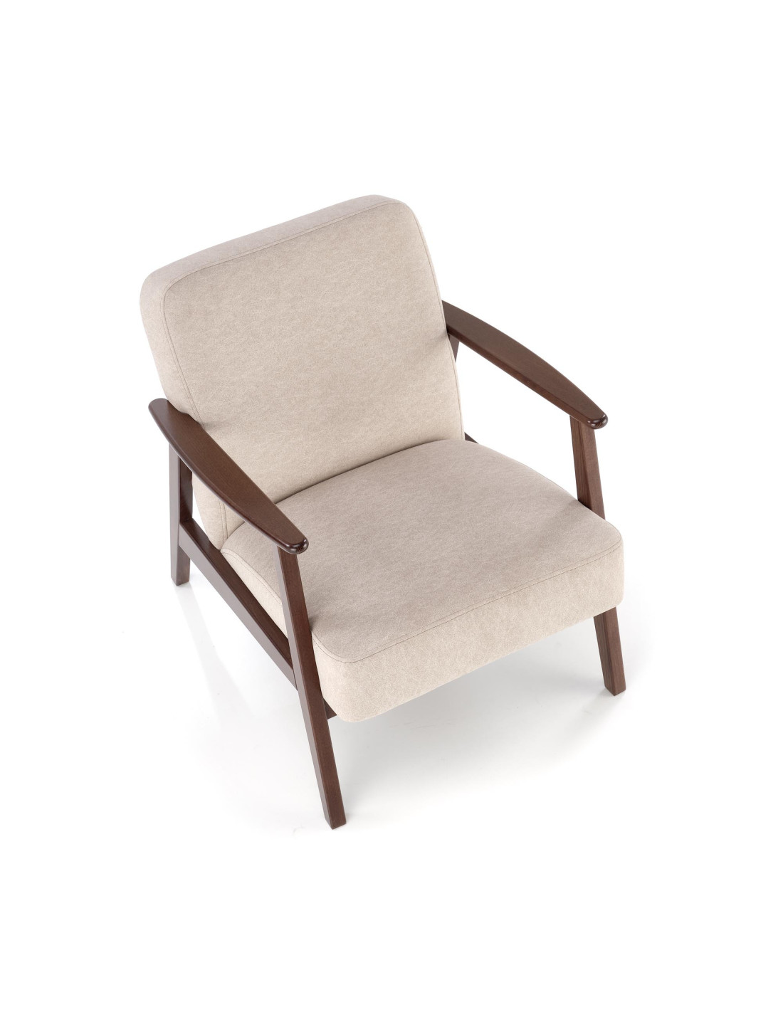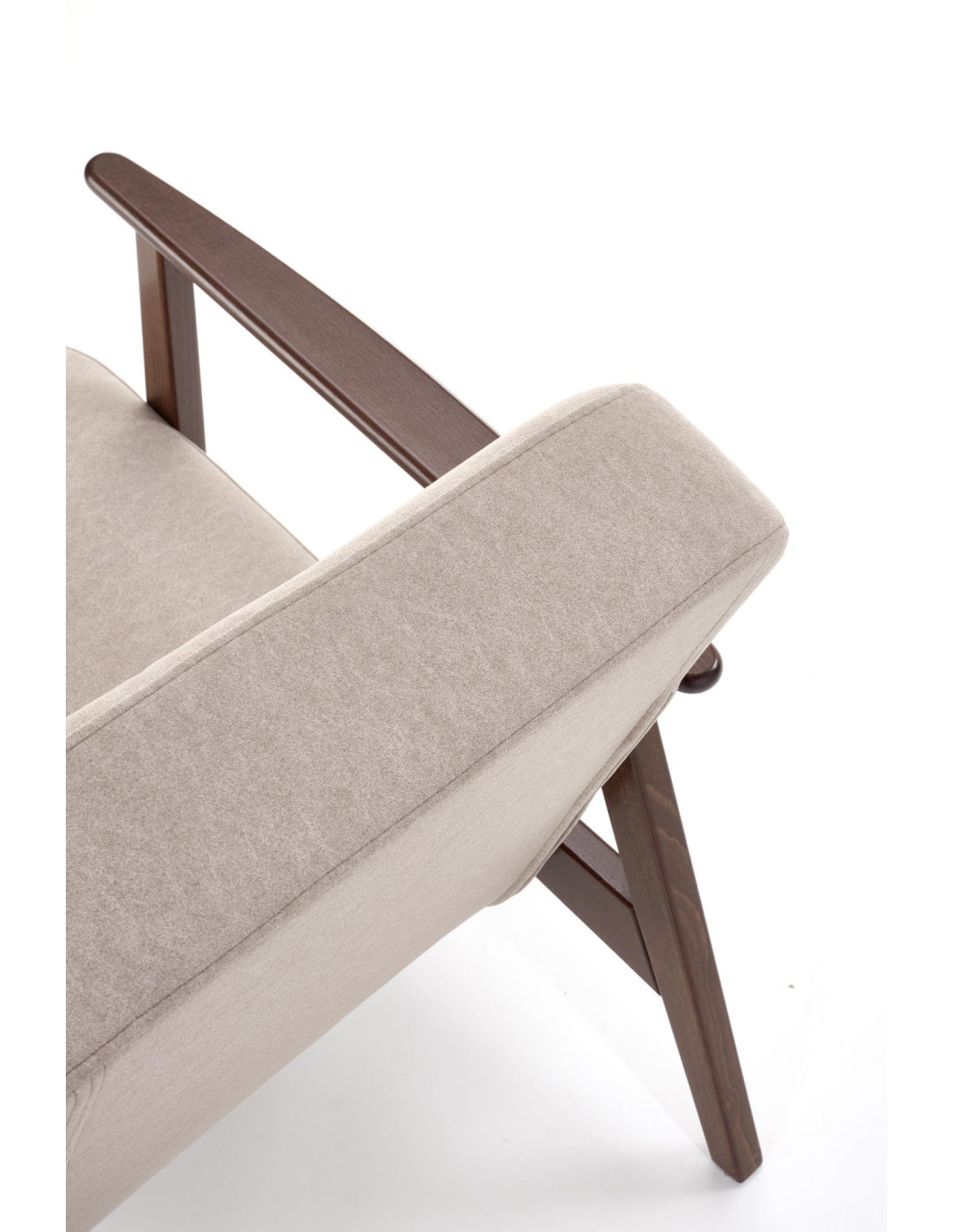 Fotel MILANO 1S wykonany jest z beżowej tkaniny CASTEL oraz drewna bukowego w kolorze ciemnego orzecha.