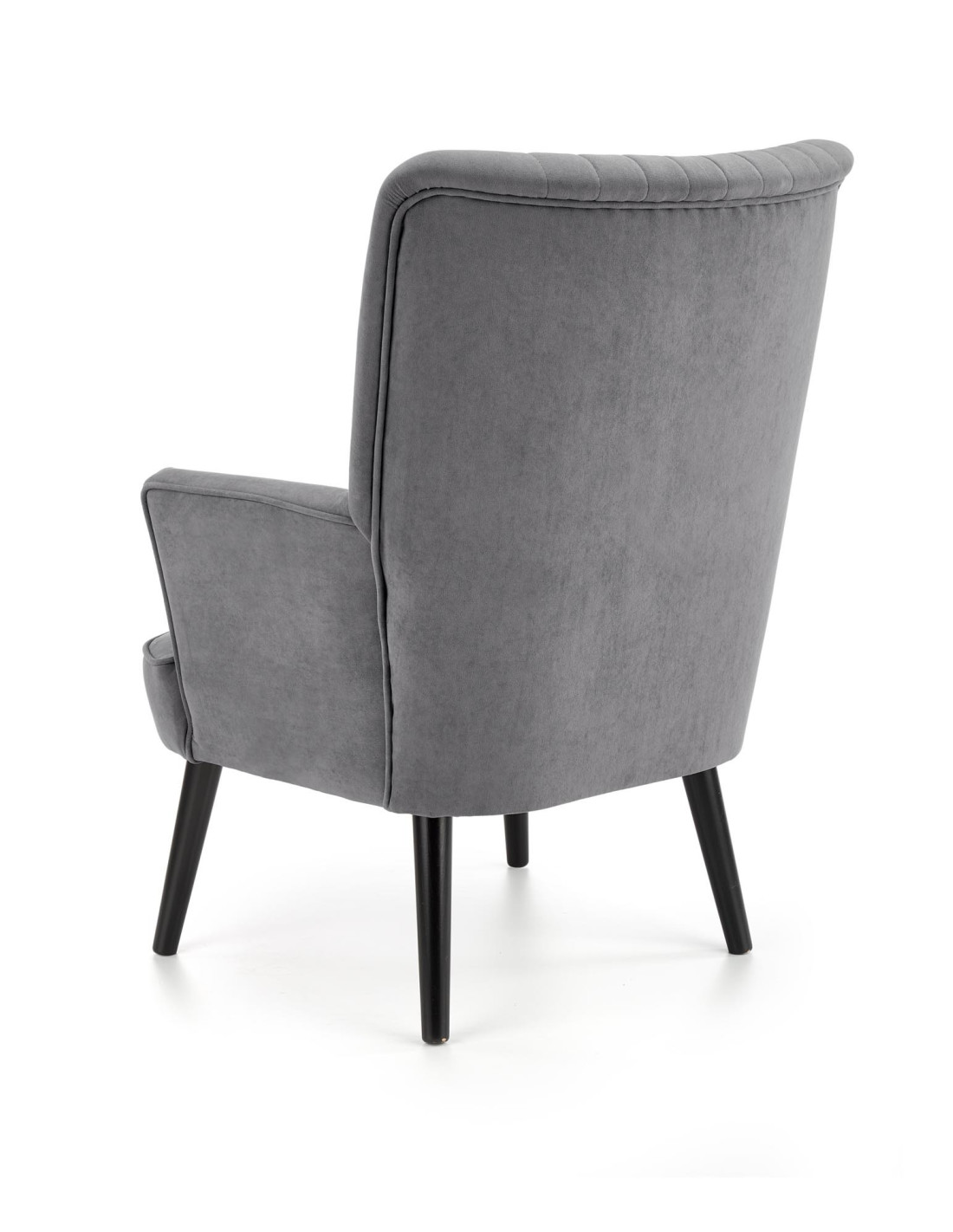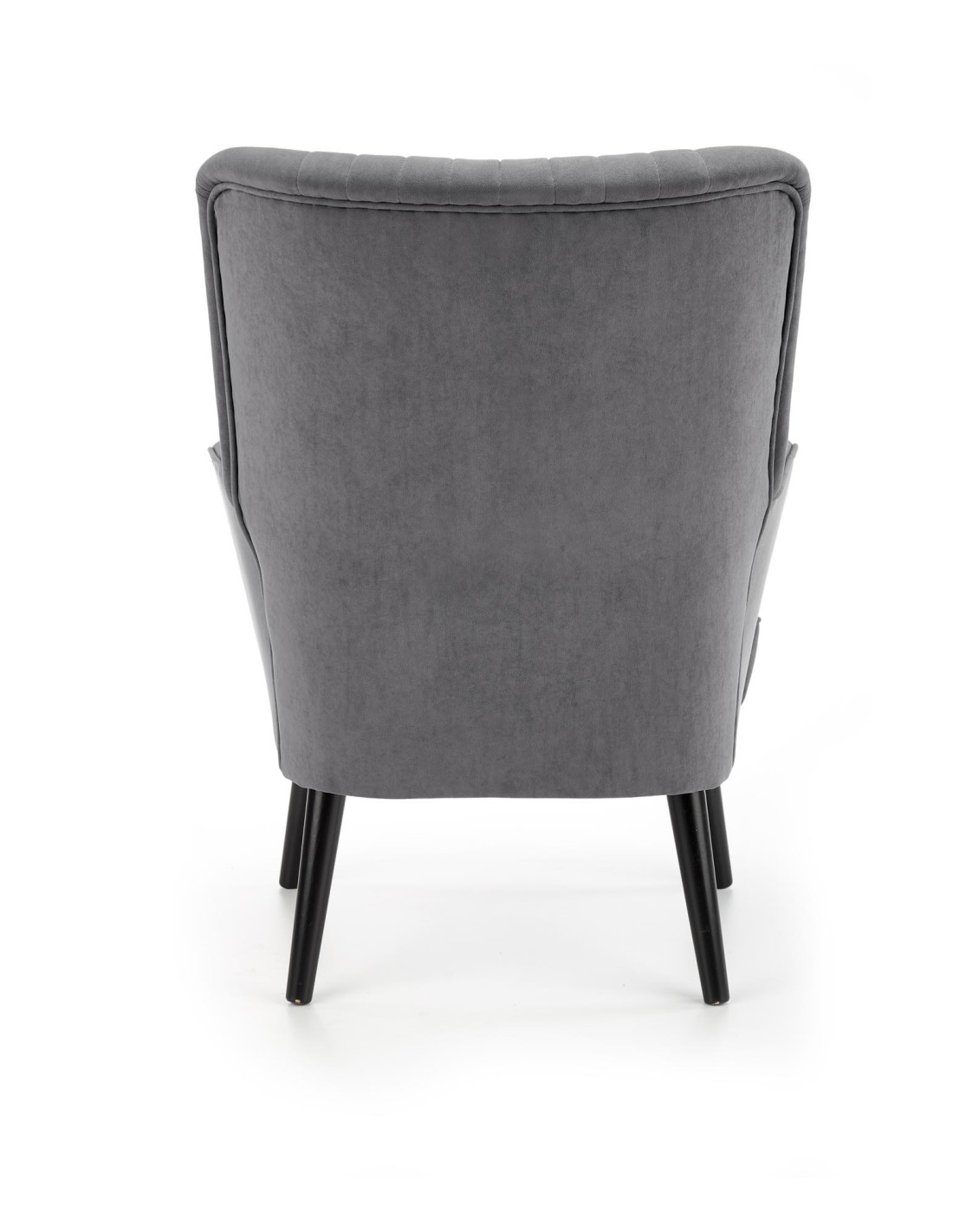 Fotel DELGADO wyróżnia się pionowymi przeszyciami, miękką tapicerką z weluru oraz stabilną konstrukcją na czarnych nogach z drewna litego.