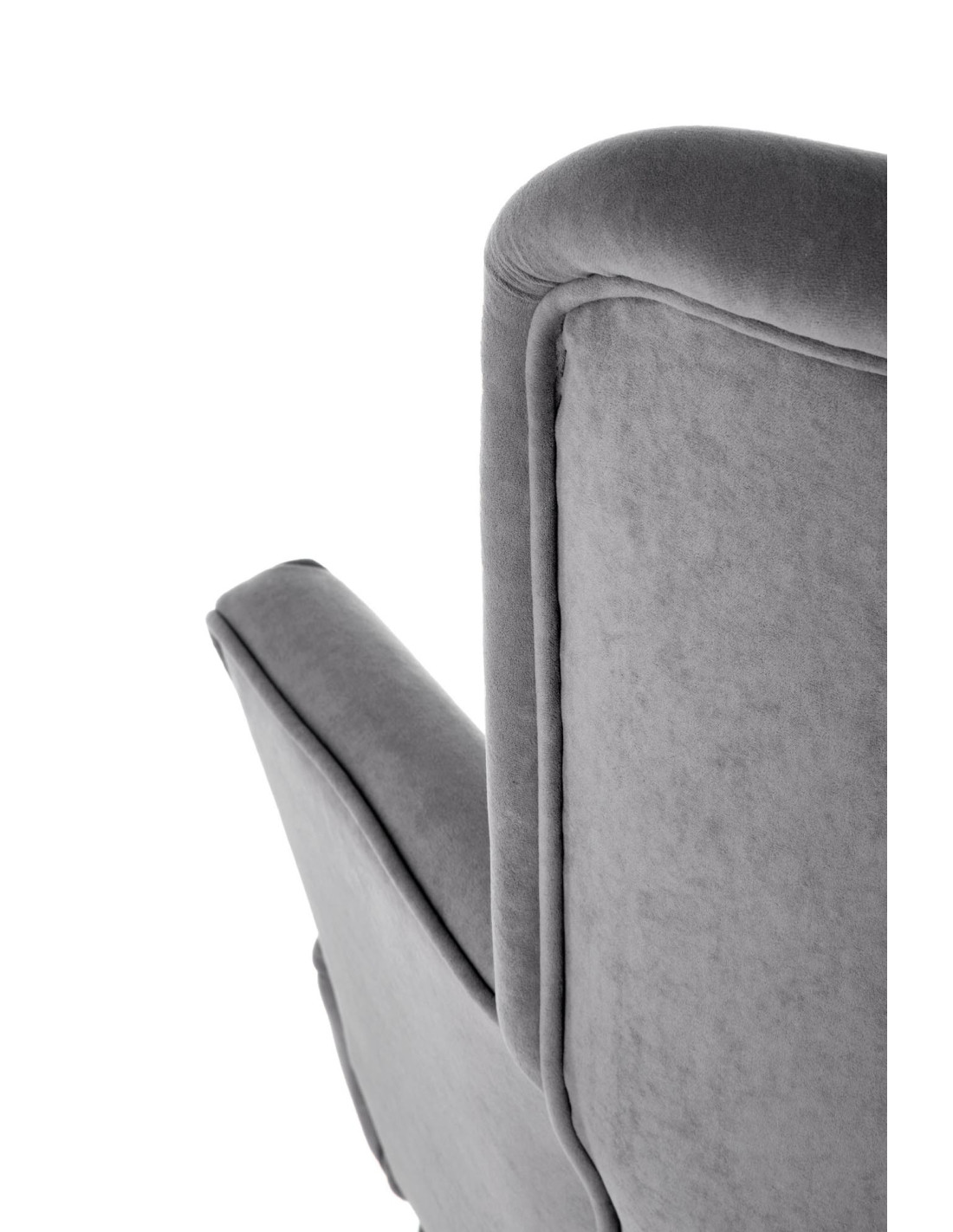 Fotel wykonany jest z tkaniny velvet oraz drewna litego, co zapewnia elegancki wygląd i trwałość.