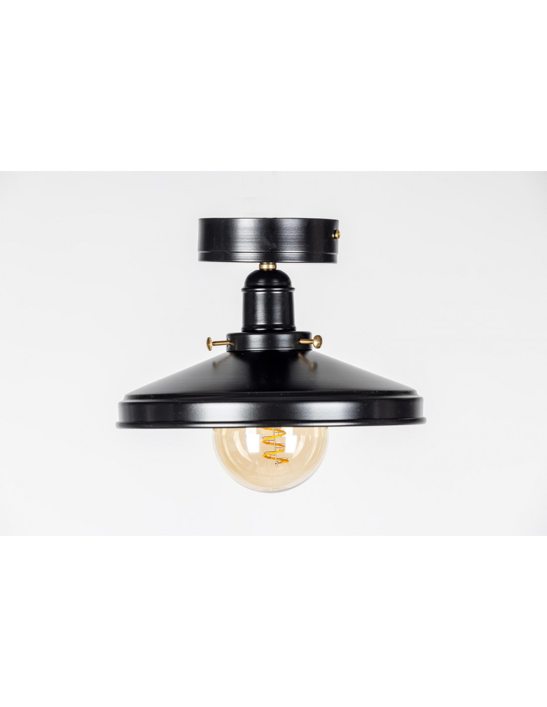 Plafon industrialno-loftowa TB/SPS/TPD wykonany jest w całości ze stali.By uzyskać efekt taki jak widzimy,blacha została poddana ręcznemu wyoblaniu.Całość lampy została pomalowana w kolorze półmatu czarnego i uzupełniona elementami z mosiądzu. W lampach tych świetnie sprawdzą się żarówki vintage,które będą dopełnieniem designu lampy.