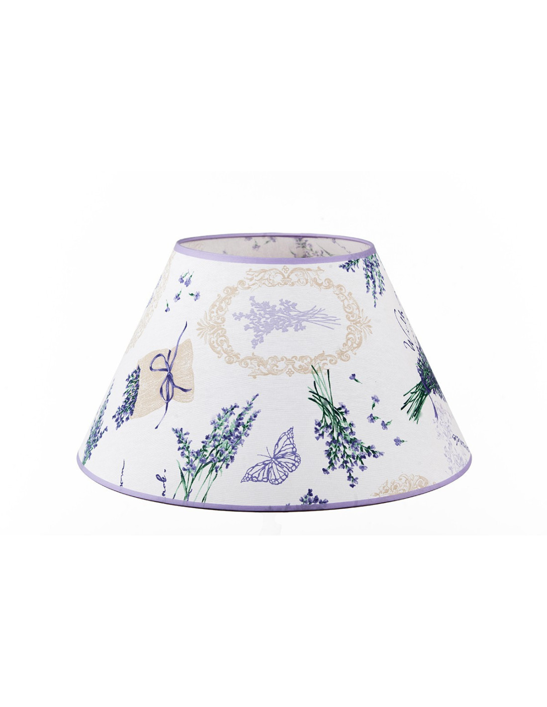 Abażur materiałowy z motywem kwiatów lawendy z rodziny stożków, podklejony białą folią pcw zszyty ręcznie. Zastosowanie:większe lampy ceramiczne lub lampy stojące. Z tego samego materiału produkujemy jeszcze abażury stożkowe do żyrandoli i duże abażury owalne.