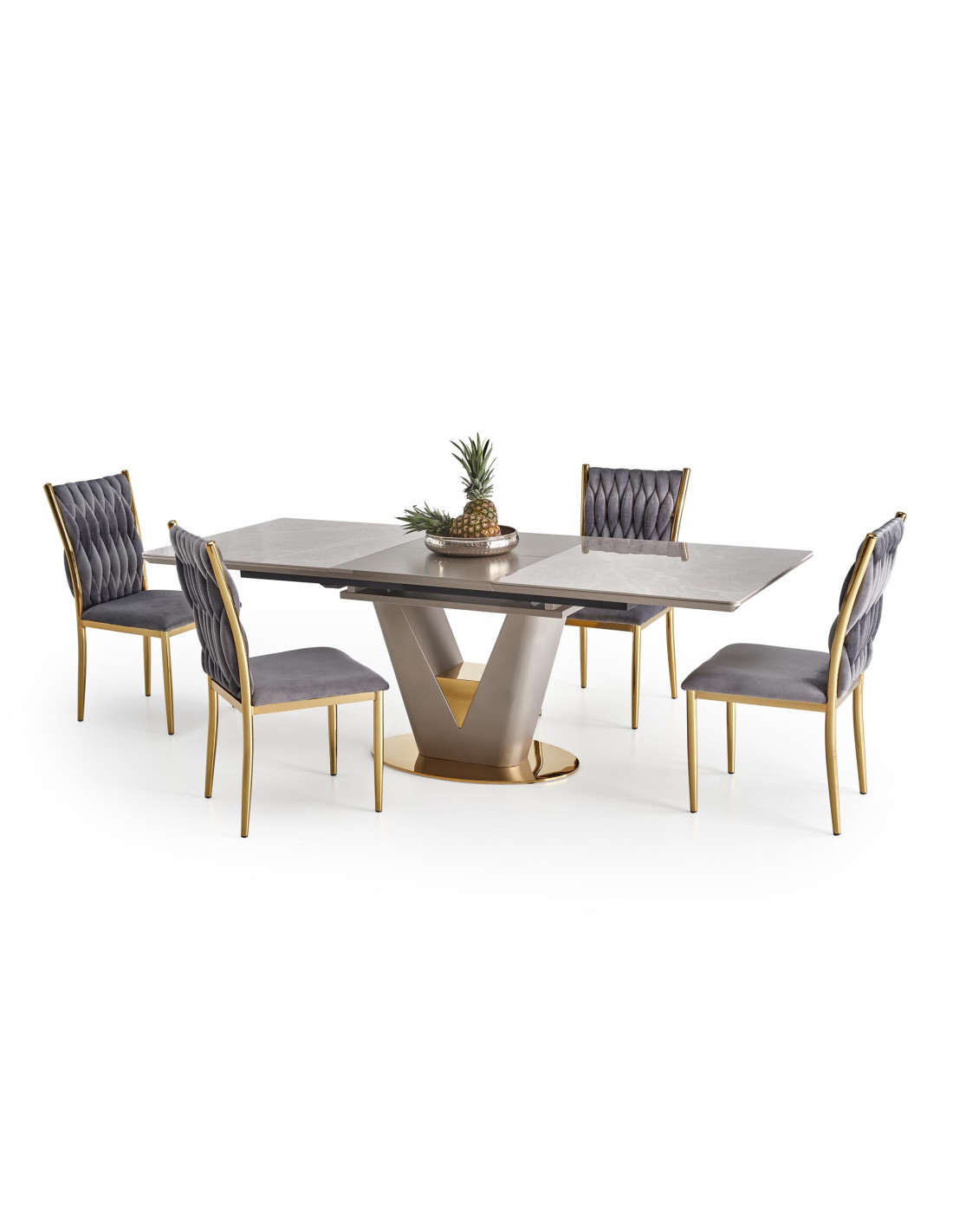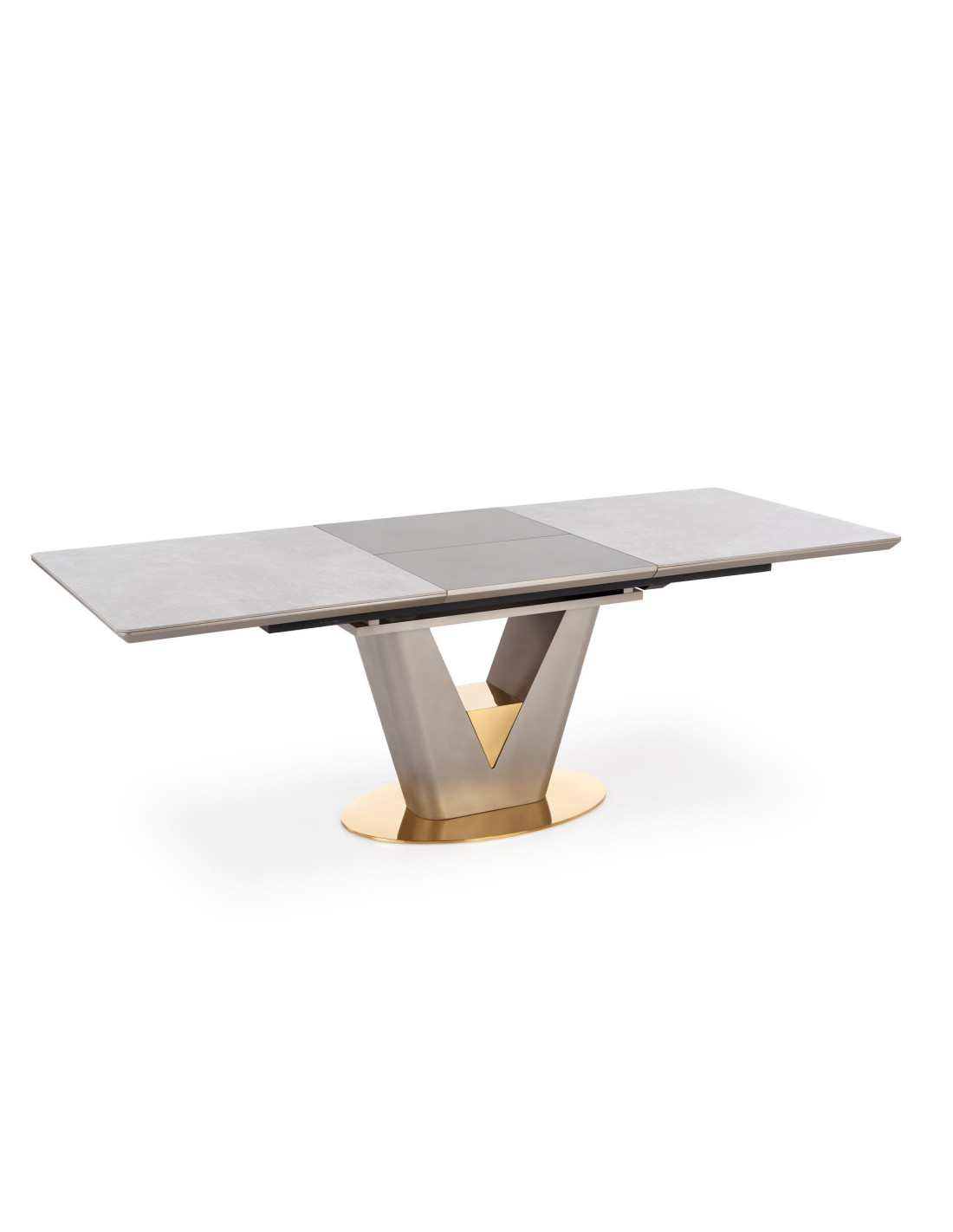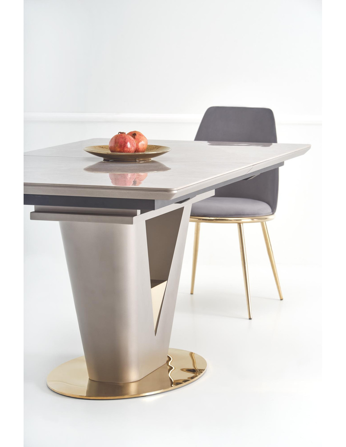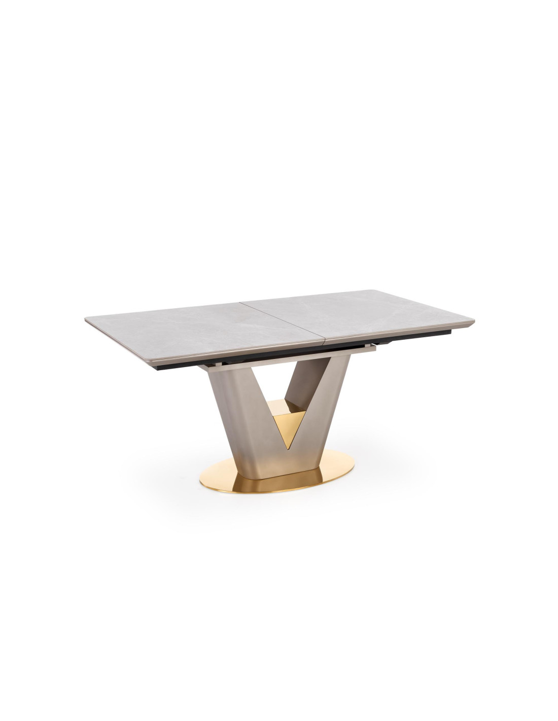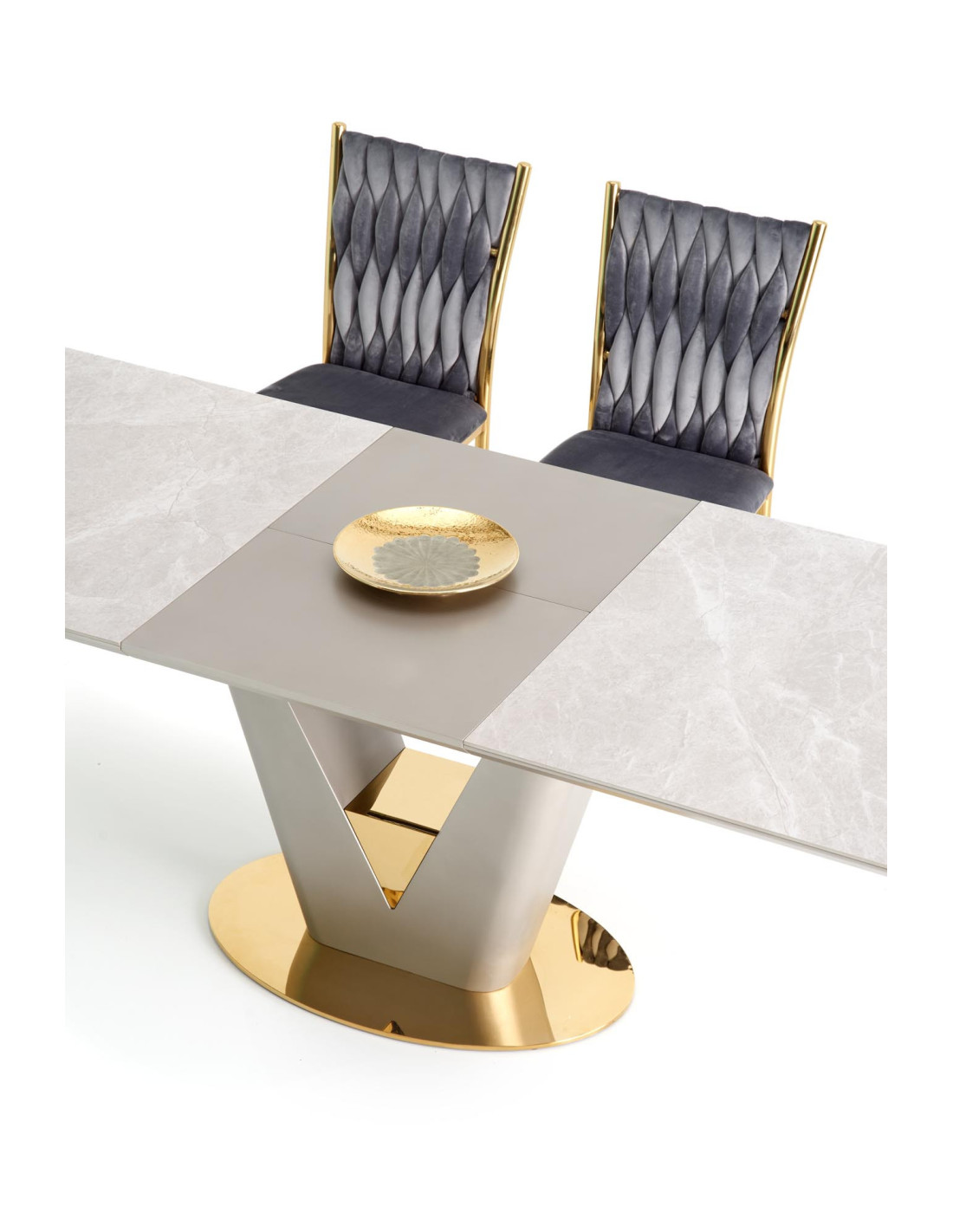 Zainspiruj się rozszerzanym stołem VALENTINO, który łączy w sobie elegancję i nowoczesność! Blat stołu, wykonany z ceramiki w kolorze popielatego marmuru, na pewno przyciągnie wzrok i doda wyjątkowego charakteru każdemu wnętrzu. Noga w kształcie litery "V", stworzona z MDF lakierowanego w odcieniach jasnego popielu i złota, wprowadza luksusowy akcent, idealnie komponując się z nowoczesnym stylem.