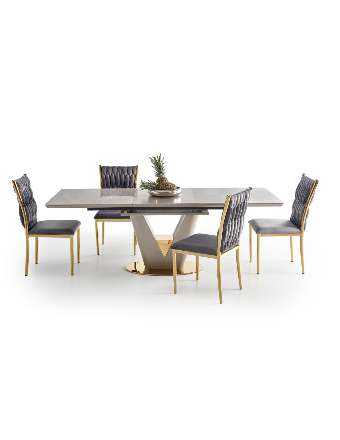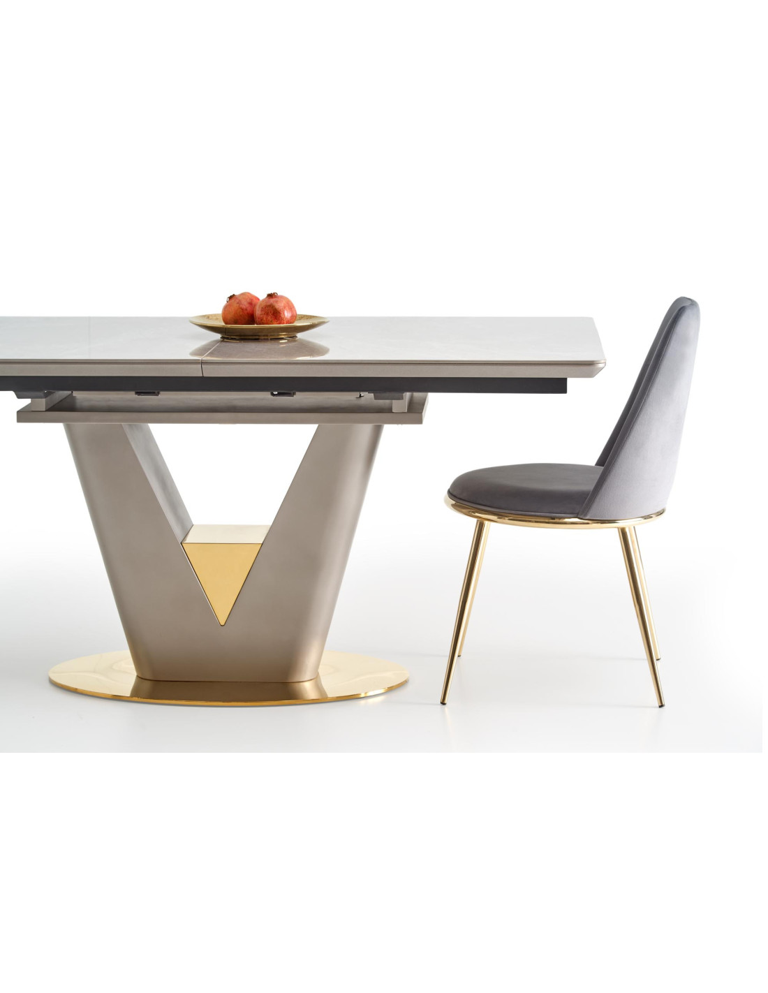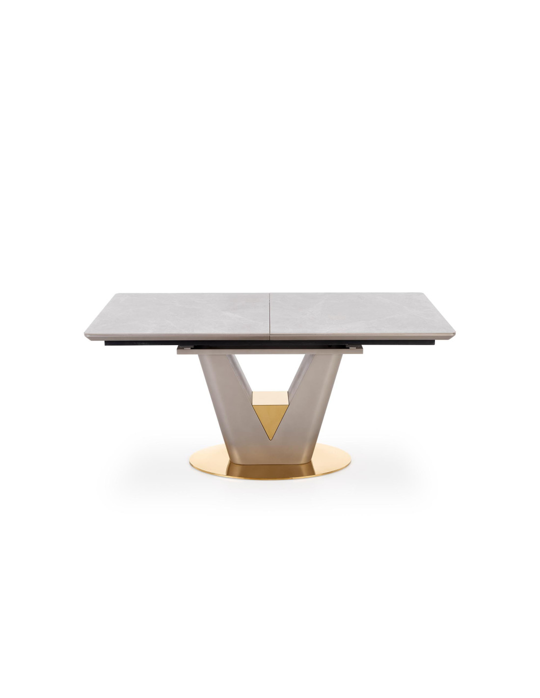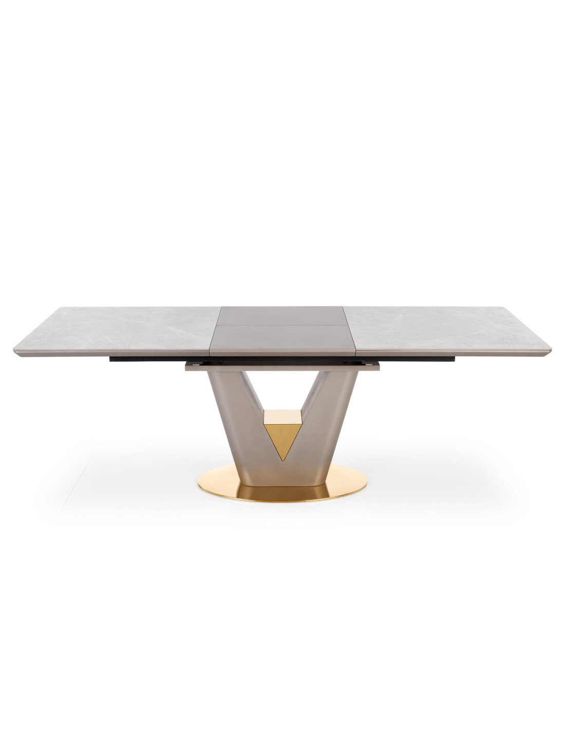 Zainspiruj się rozszerzanym stołem VALENTINO, który łączy w sobie elegancję i nowoczesność! Blat stołu, wykonany z ceramiki w kolorze popielatego marmuru, na pewno przyciągnie wzrok i doda wyjątkowego charakteru każdemu wnętrzu. Noga w kształcie litery "V", stworzona z MDF lakierowanego w odcieniach jasnego popielu i złota, wprowadza luksusowy akcent, idealnie komponując się z nowoczesnym stylem.