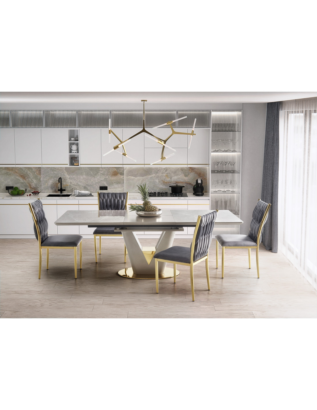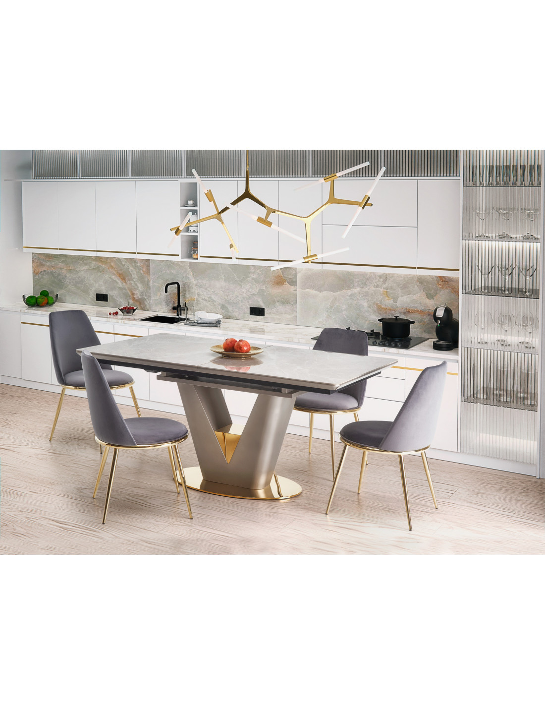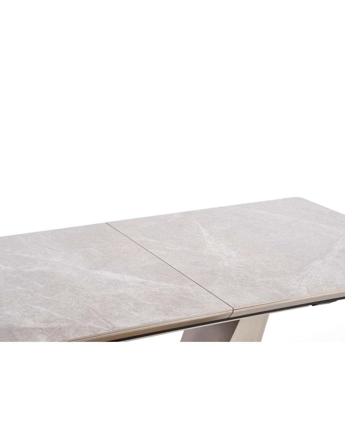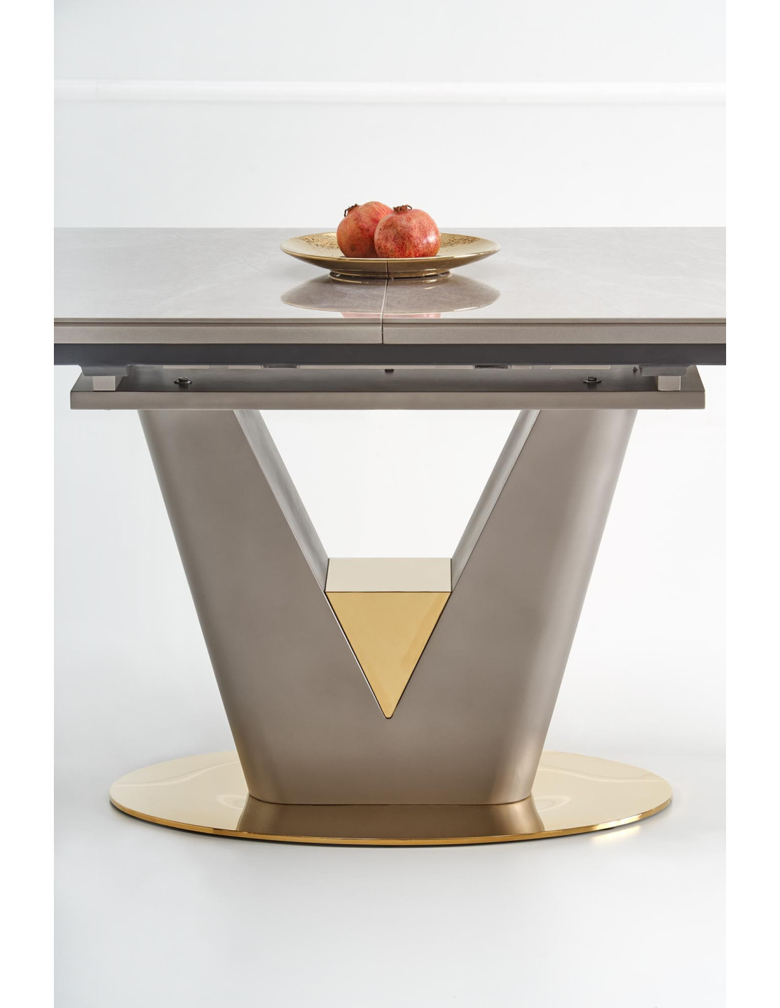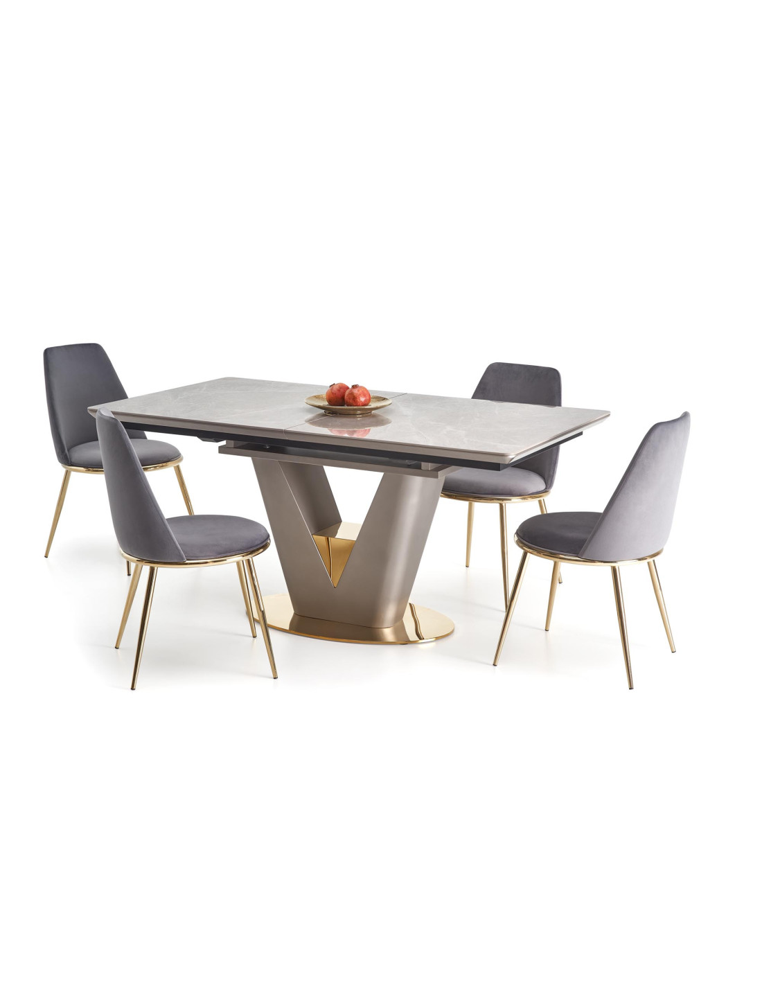 Zainspiruj się rozszerzanym stołem VALENTINO, który łączy w sobie elegancję i nowoczesność! Blat stołu, wykonany z ceramiki w kolorze popielatego marmuru, na pewno przyciągnie wzrok i doda wyjątkowego charakteru każdemu wnętrzu. Noga w kształcie litery "V", stworzona z MDF lakierowanego w odcieniach jasnego popielu i złota, wprowadza luksusowy akcent, idealnie komponując się z nowoczesnym stylem.