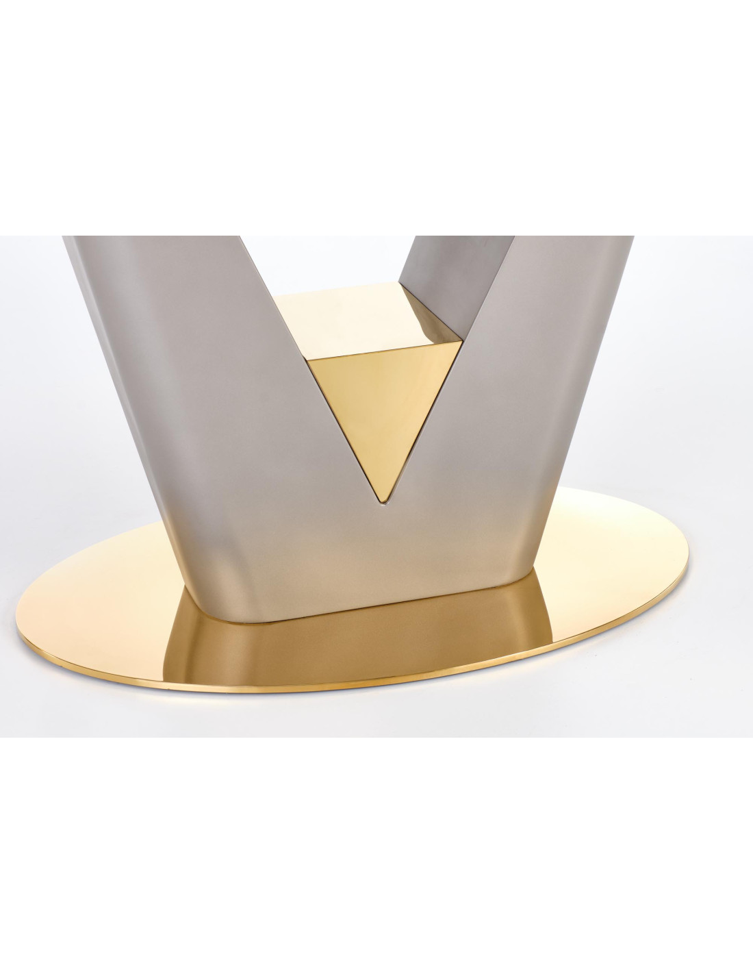 - ✅ Noga w kształcie litery "V": Wykonana z MDF lakierowanego, dostępna w dwóch eleganckich kolorach - jasnym popielu i złocie, co dodaje nowoczesnego akcentu.