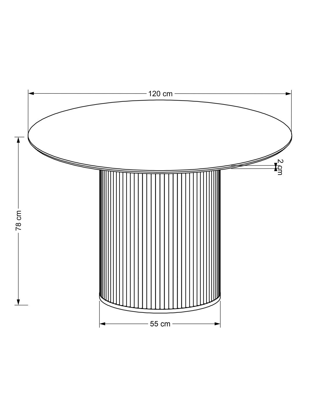 Stół ma średnicę 120 cm i wysokość 78 cm.