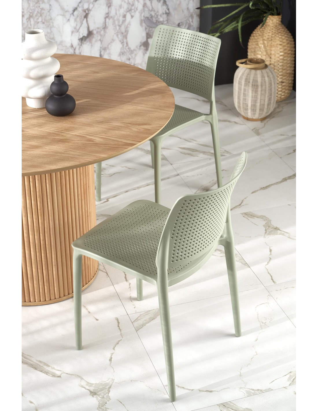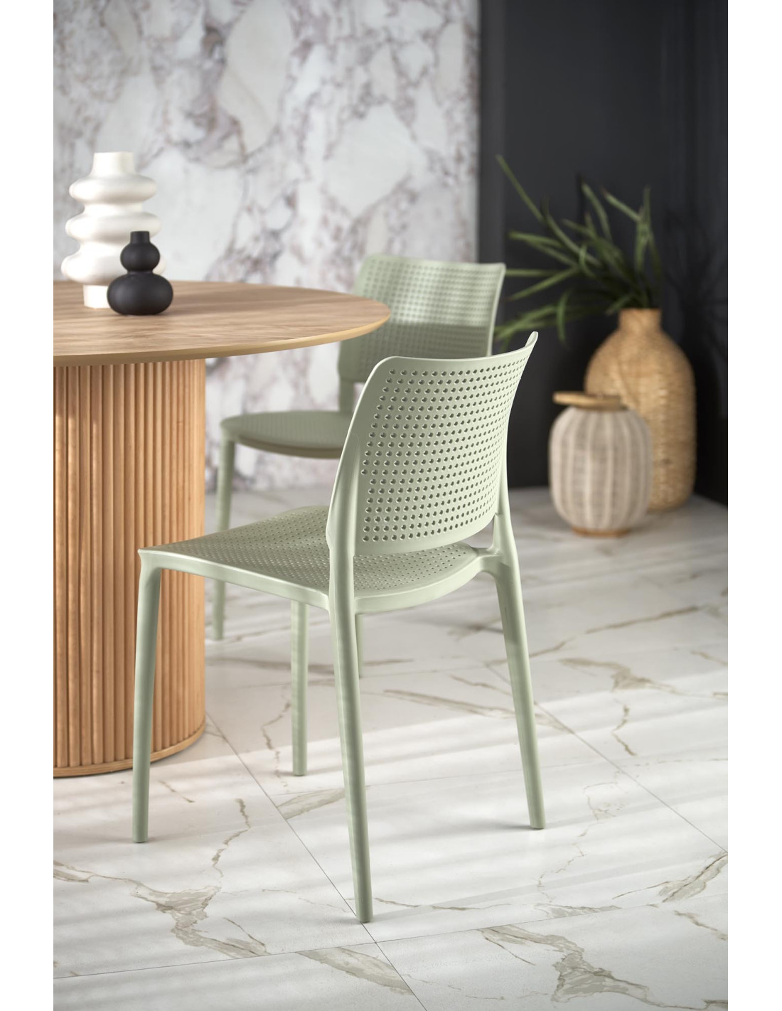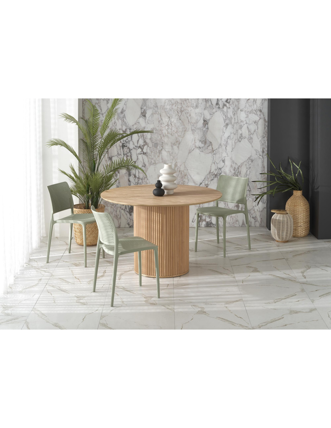 Szukasz mebla, który spełni Twoje oczekiwania? Przedstawiamy Ci stół okrągły LOPEZ, który łączy nowoczesny design z praktycznością. Okrągły blat o średnicy 120 cm wykonany z MDF w okleinie naturalnej zachwyca gładką powierzchnią z wyraźnym wzorem słojów drewna, co nadaje mu unikalny charakter. Cylindryczna podstawa z pionowymi rowkami dodaje tekstury oraz stabilności, a całość doskonale wpisuje się w skandynawski minimalizm.