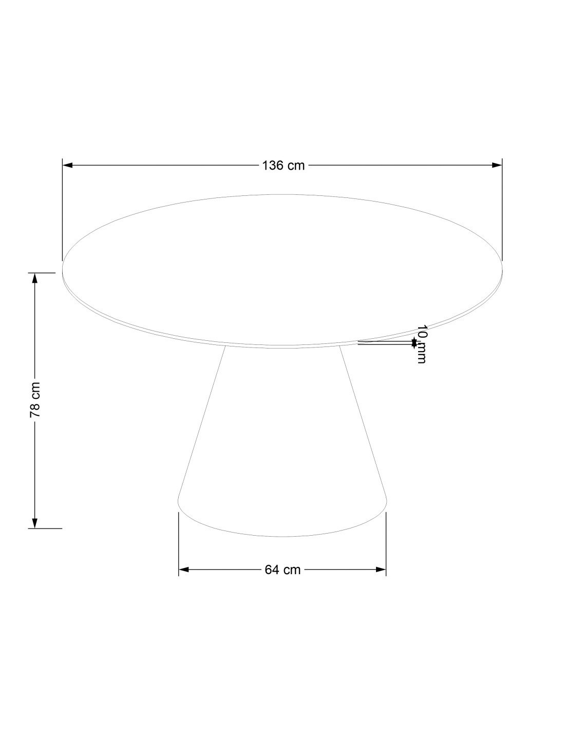 Stół ma zaokrąglony blat oraz stożkową podstawę, co nadaje mu nowoczesny i elegancki wygląd.