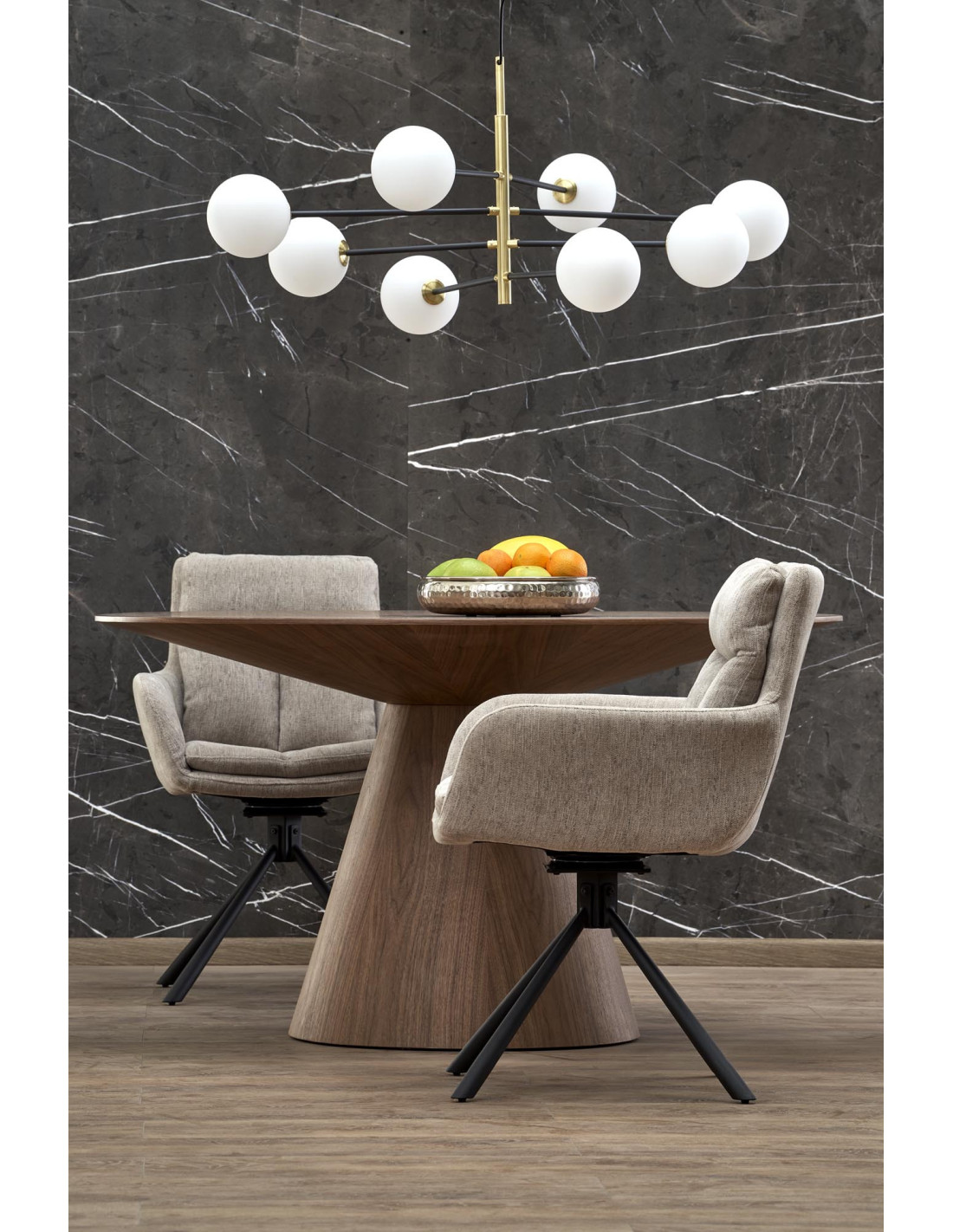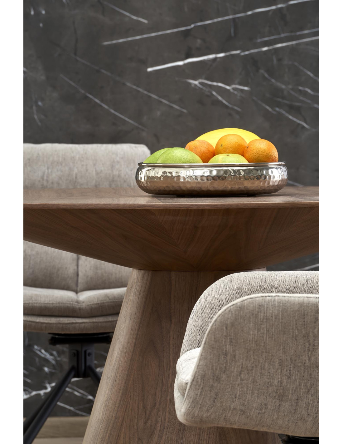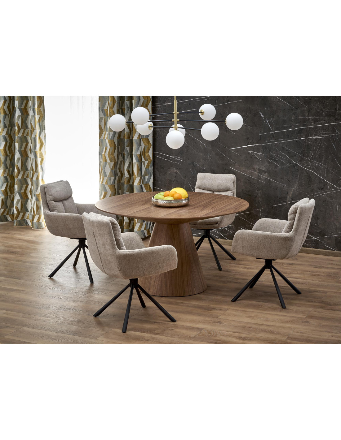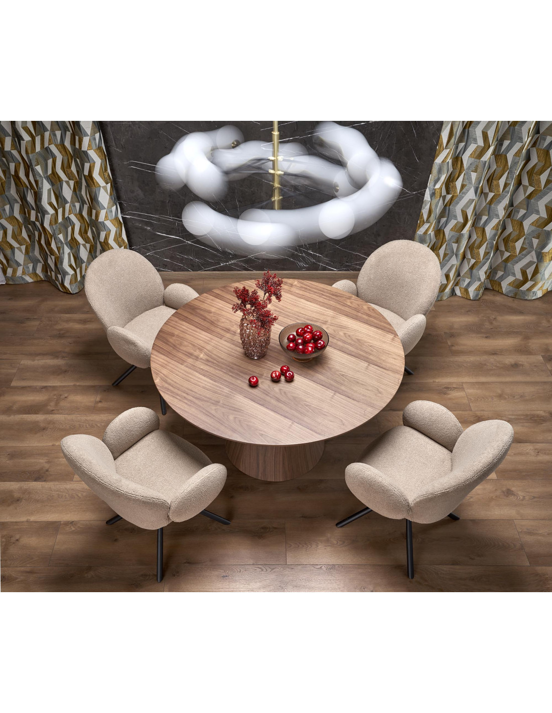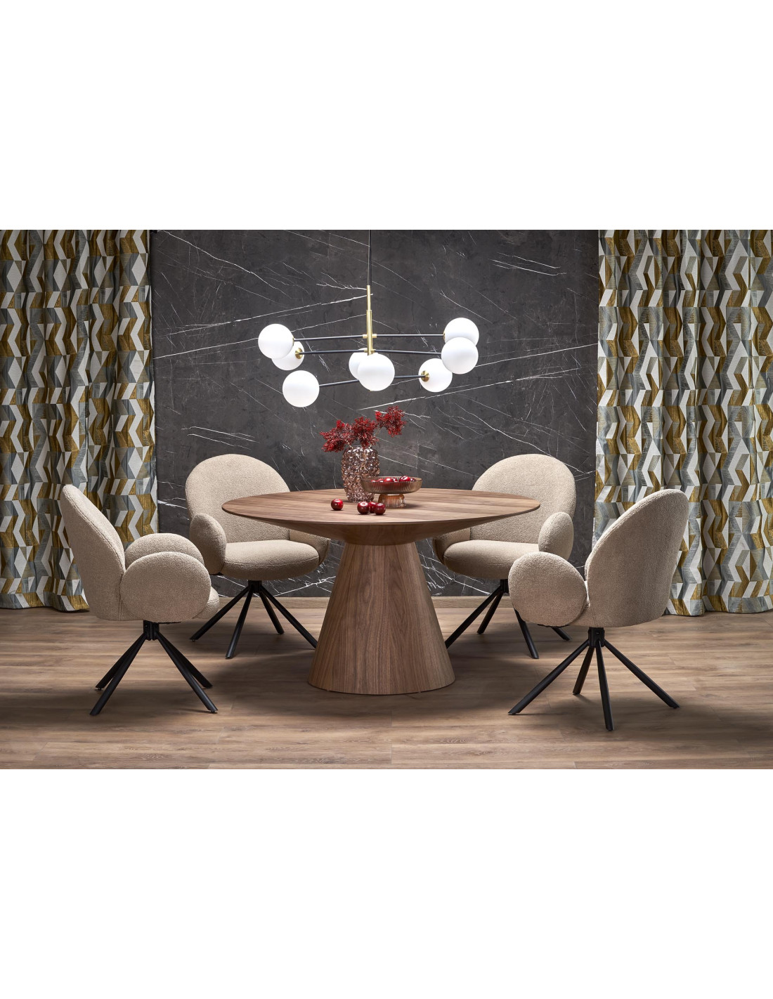 Szukasz mebla, który spełni Twoje oczekiwania? Przedstawiamy okrągły stół o średnicy 136 cm, który łączy w sobie nowoczesny design z klasyczną elegancją. Wykonany z wysokiej jakości MDF w okleinie naturalnej w kolorze orzechowym, stół zachwyca gładkim, zaokrąglonym blatem oraz stożkową podstawą, co nadaje mu wyjątkowego charakteru. Z pewnością stanie się centralnym punktem każdej jadalni czy salonu.