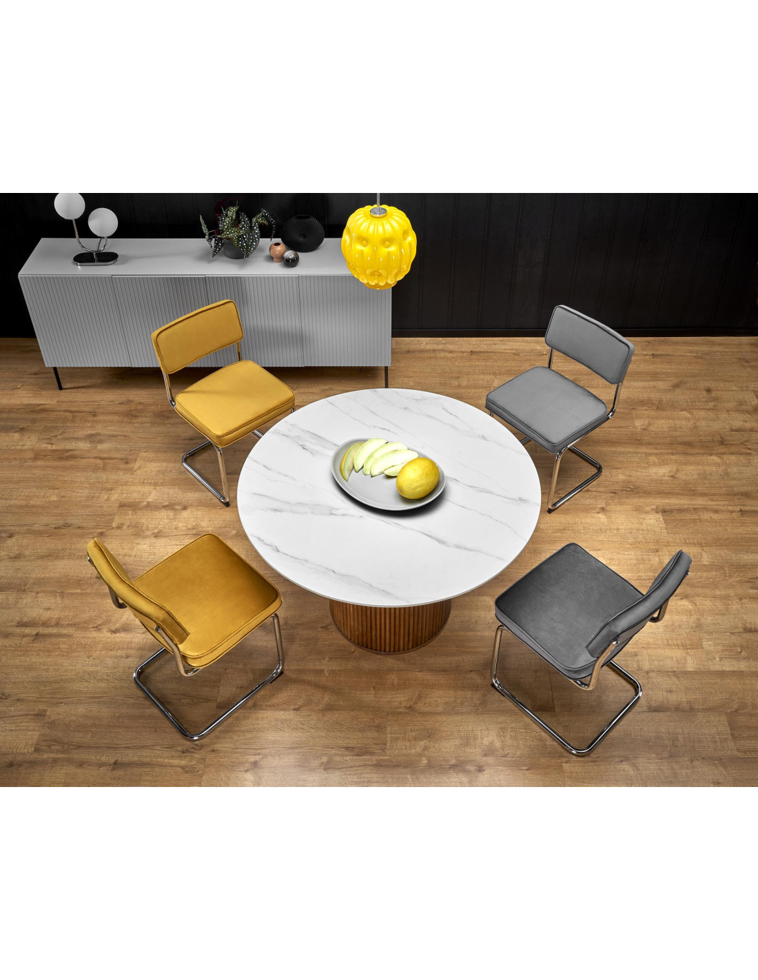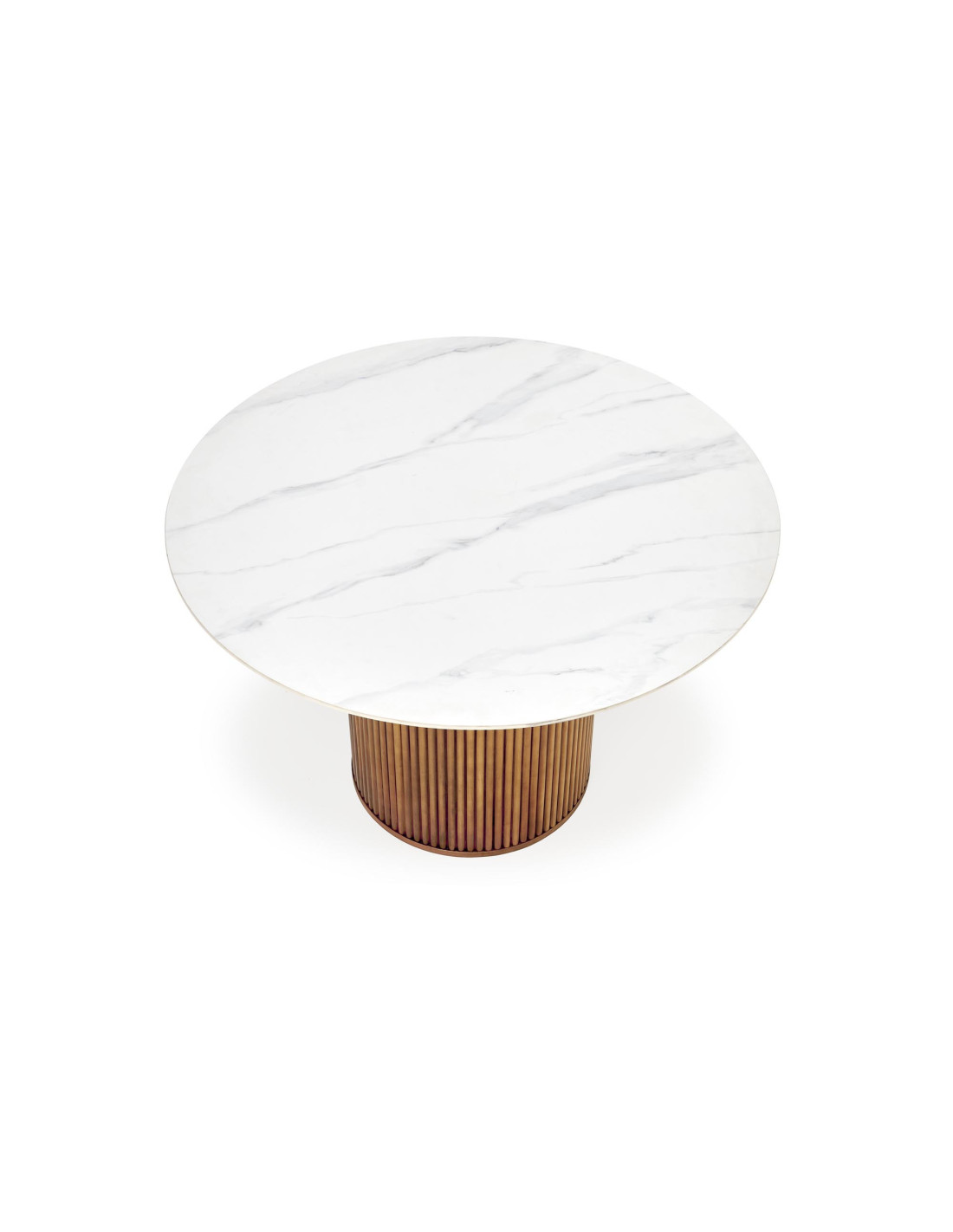 Dodaj odrobinę luksusu do swojego wnętrza z okrągłym stołem BRUNO, który zachwyca połączeniem eleganckiego designu i praktyczności. Jego okrągły blat o średnicy 120 cm, wykonany z ceramiki imitującej marmur, wprowadza do każdego pomieszczenia nutę klasyki. Podstawa stołu, stworzona z drewna w kolorze orzechowym, z pionowymi żłobieniami, dodaje mu wyjątkowego charakteru.