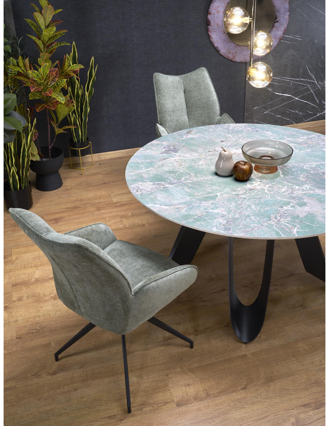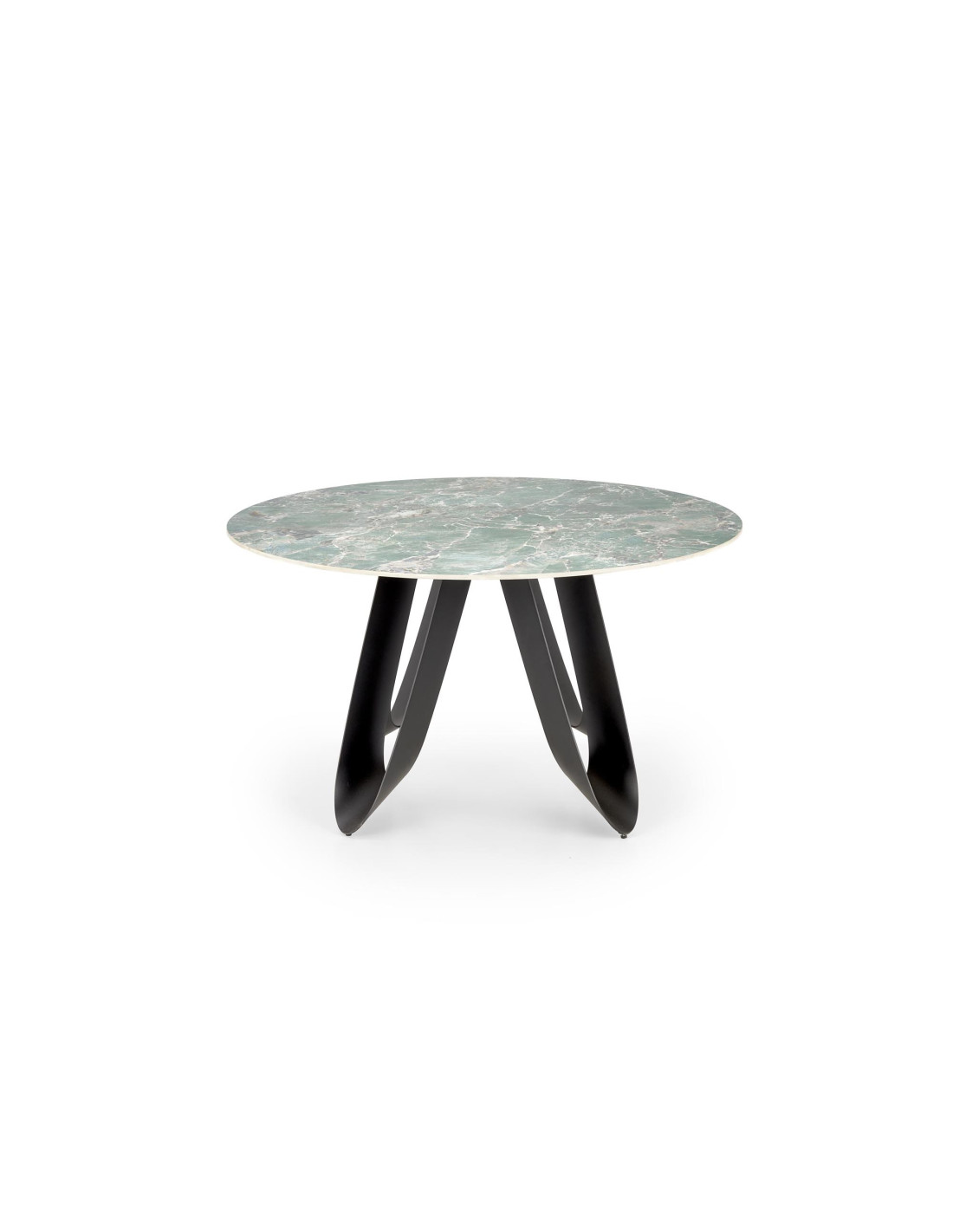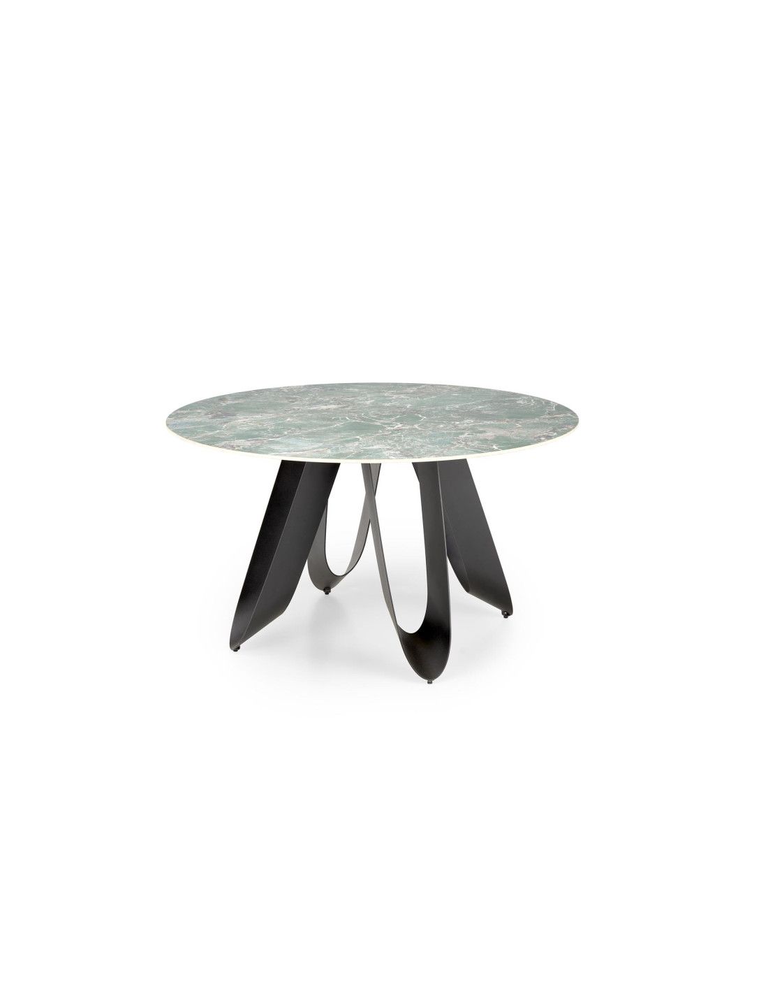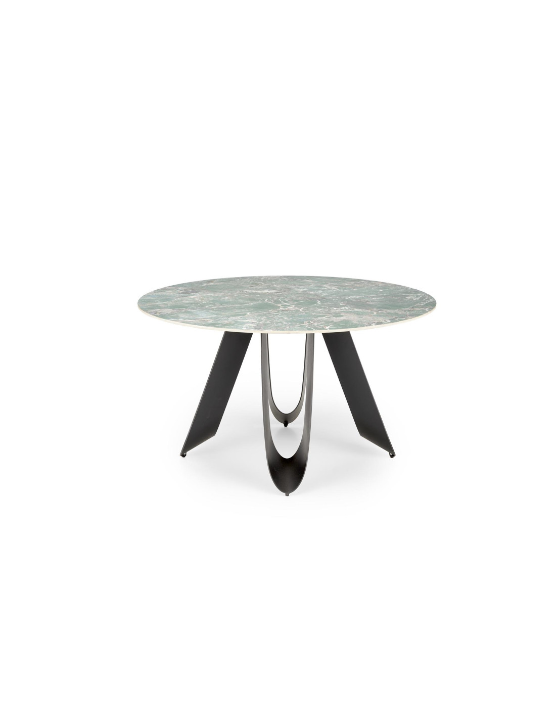 Podkreśl elegancję swojego wnętrza z okragłym stołem GIOVANI, który łączy nowoczesny design z luksusowym akcentem. Okrągły blat o średnicy 135 cm wykonany jest z wysokiej jakości spieku w kolorze zielonego marmuru, co nadaje mu wyjątkowego charakteru. Stalowe nogi w czarnym kolorze, o lekko zakrzywionym kształcie, dodają całości nowoczesności i stabilności.