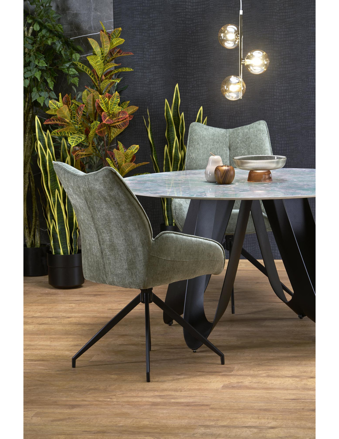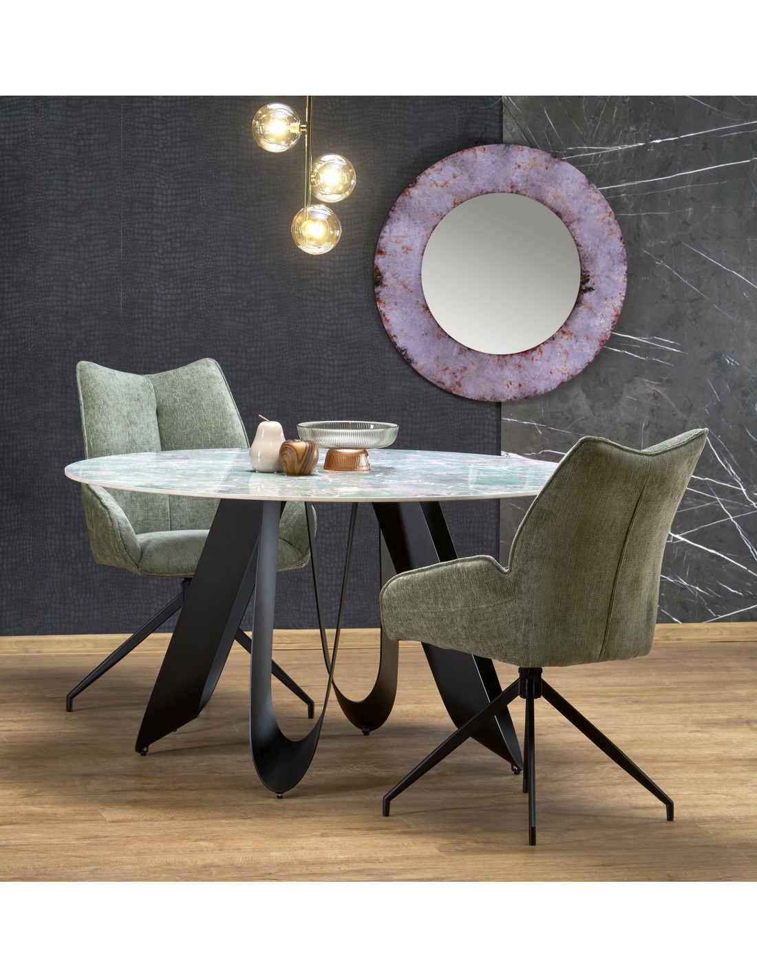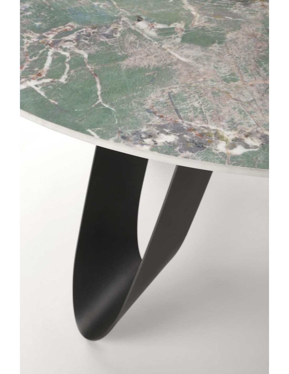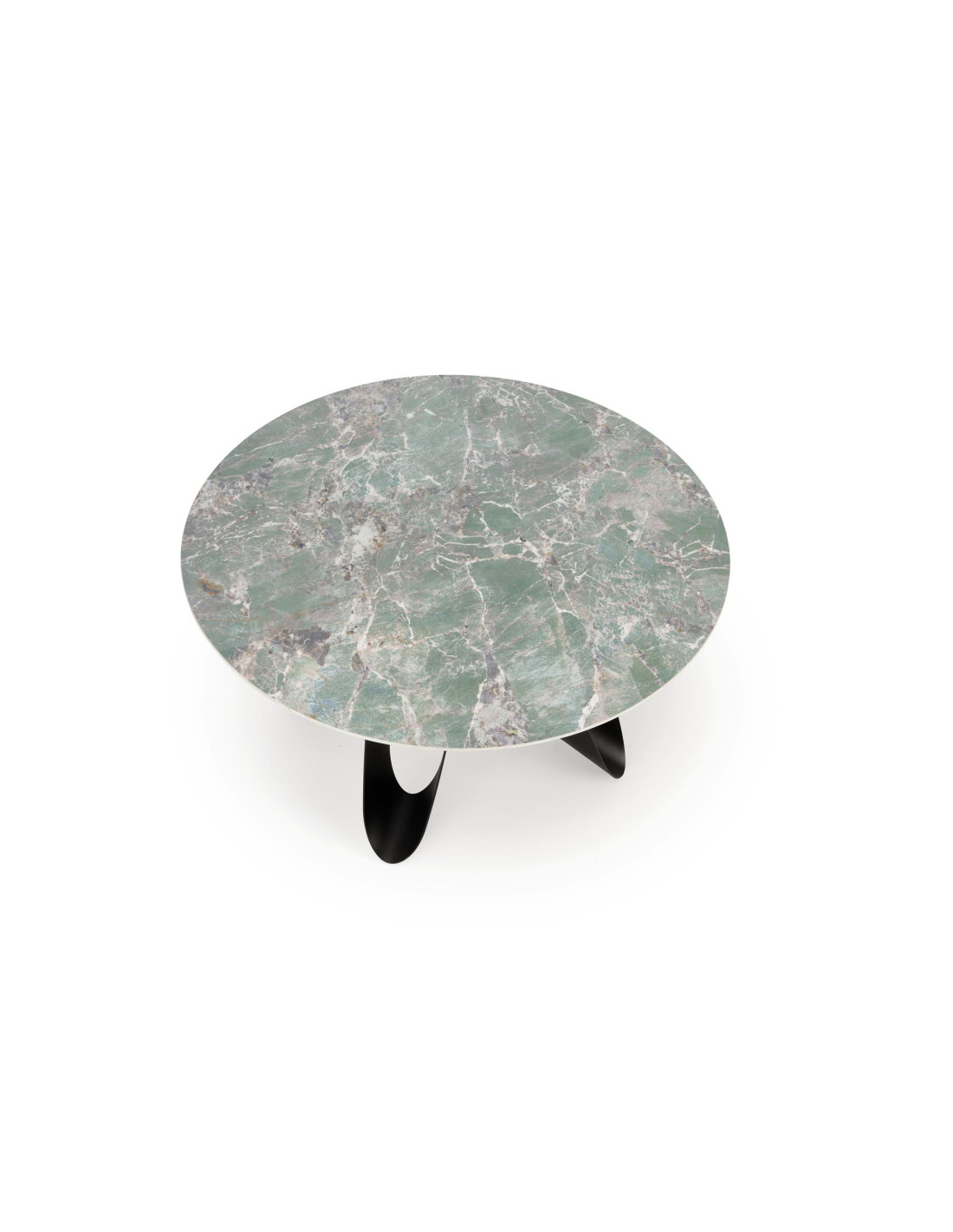 Podkreśl elegancję swojego wnętrza z okragłym stołem GIOVANI, który łączy nowoczesny design z luksusowym akcentem. Okrągły blat o średnicy 135 cm wykonany jest z wysokiej jakości spieku w kolorze zielonego marmuru, co nadaje mu wyjątkowego charakteru. Stalowe nogi w czarnym kolorze, o lekko zakrzywionym kształcie, dodają całości nowoczesności i stabilności.