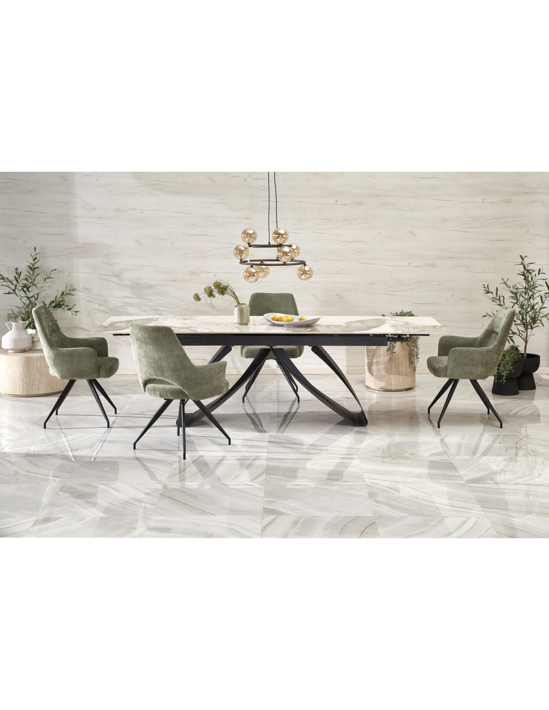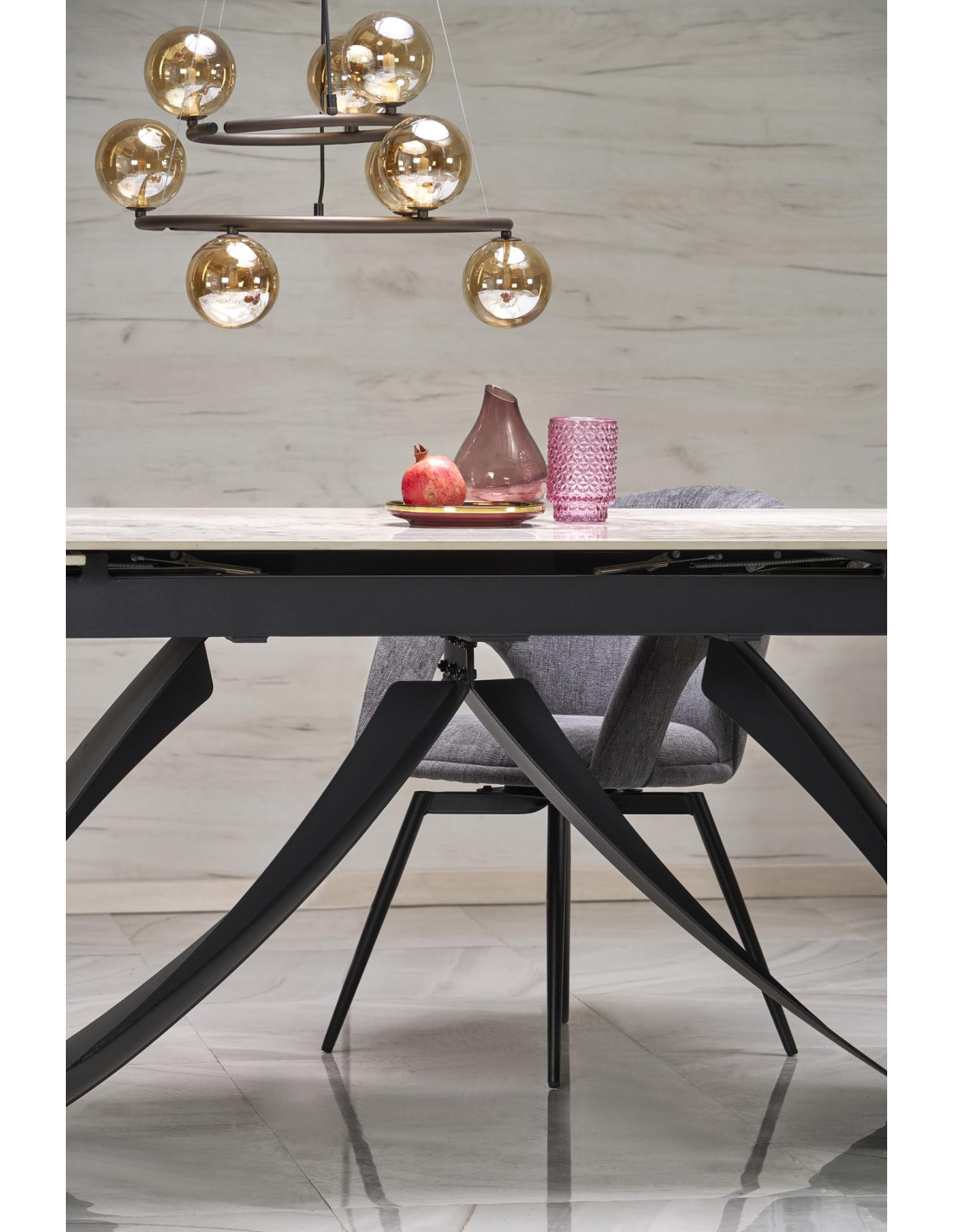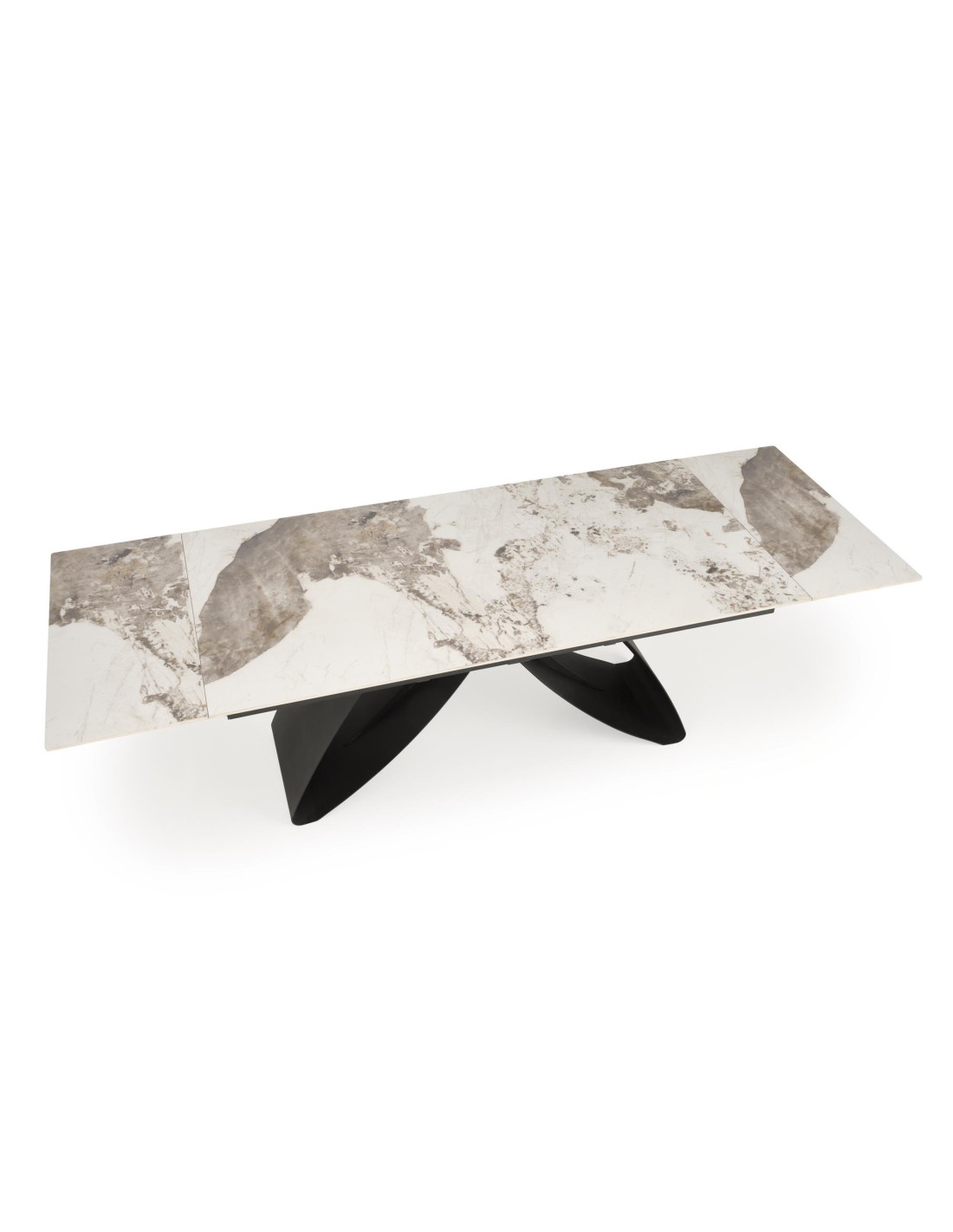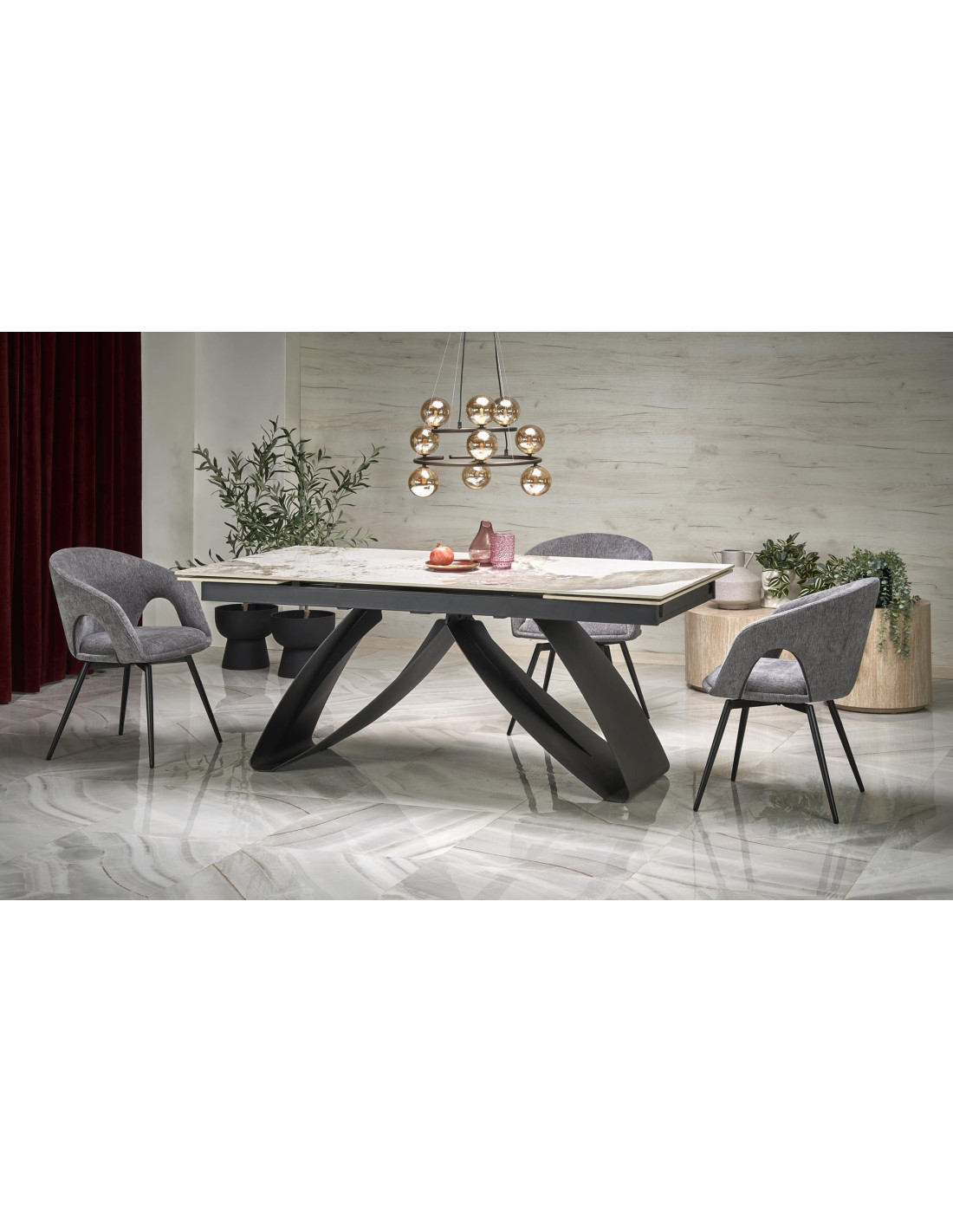 Ciesz się wyjątkowym designem rozszerzanego stołu HILARIO, który łączy w sobie nowoczesność i funkcjonalność! Blat stołu wykonany ze spieku w kolorze białego marmuru, z charakterystycznymi szarymi żyłkami, sprawia, że stół staje się nie tylko praktycznym elementem, ale i piękną dekoracją Twojego wnętrza. Czarne, stalowe nogi dodają mu elegancji, a prostokątny kształt idealnie wpisuje się w minimalistyczny styl.