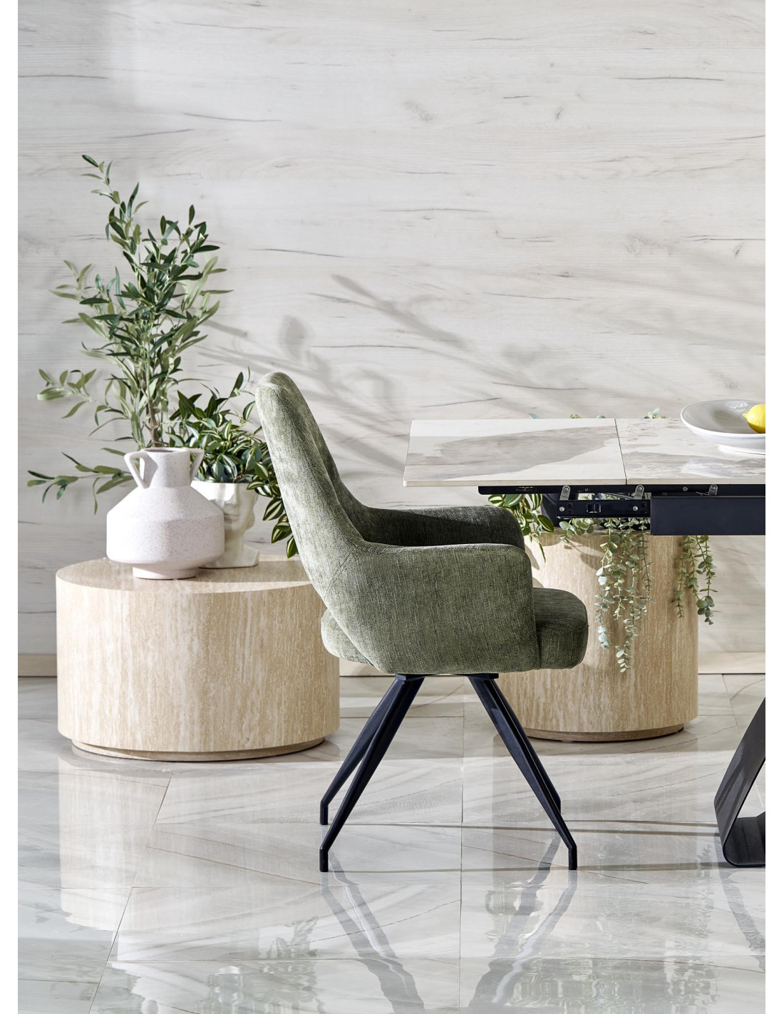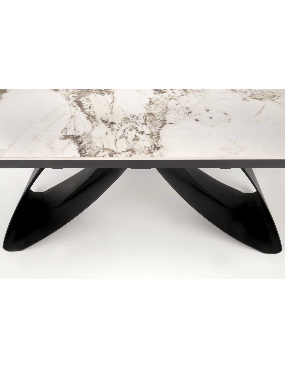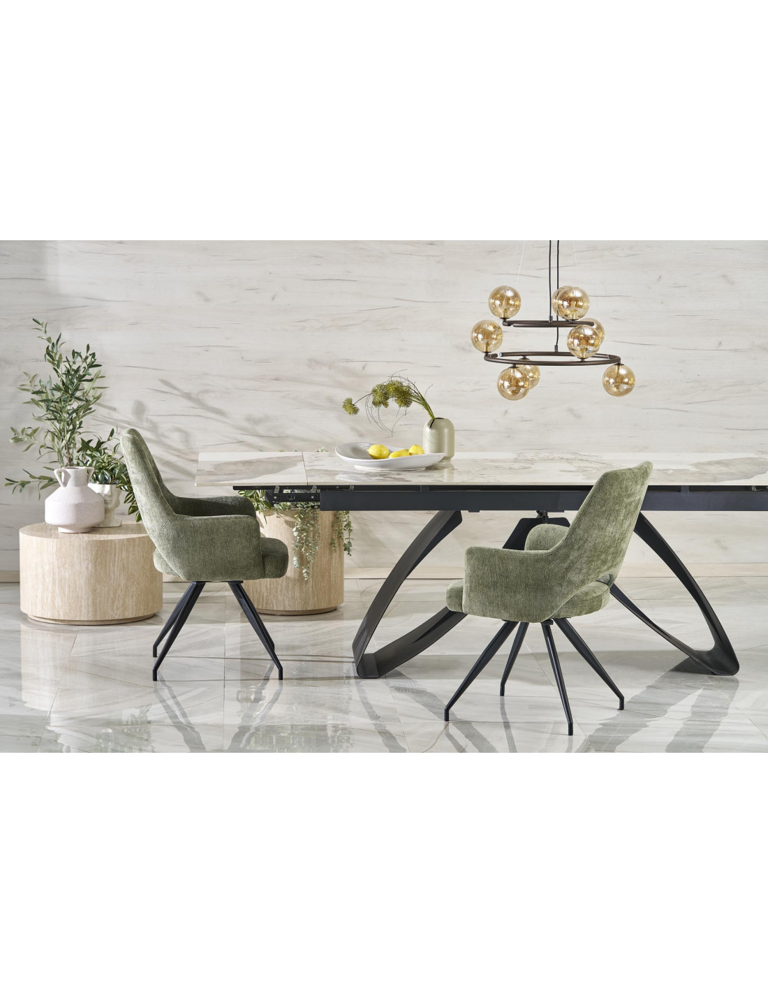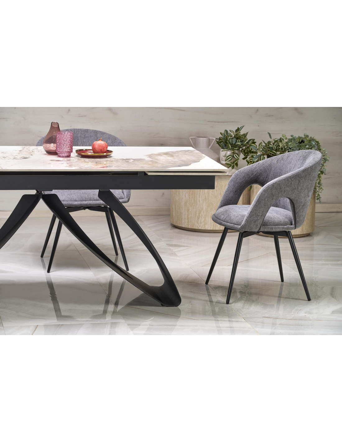 Ciesz się wyjątkowym designem rozszerzanego stołu HILARIO, który łączy w sobie nowoczesność i funkcjonalność! Blat stołu wykonany ze spieku w kolorze białego marmuru, z charakterystycznymi szarymi żyłkami, sprawia, że stół staje się nie tylko praktycznym elementem, ale i piękną dekoracją Twojego wnętrza. Czarne, stalowe nogi dodają mu elegancji, a prostokątny kształt idealnie wpisuje się w minimalistyczny styl.