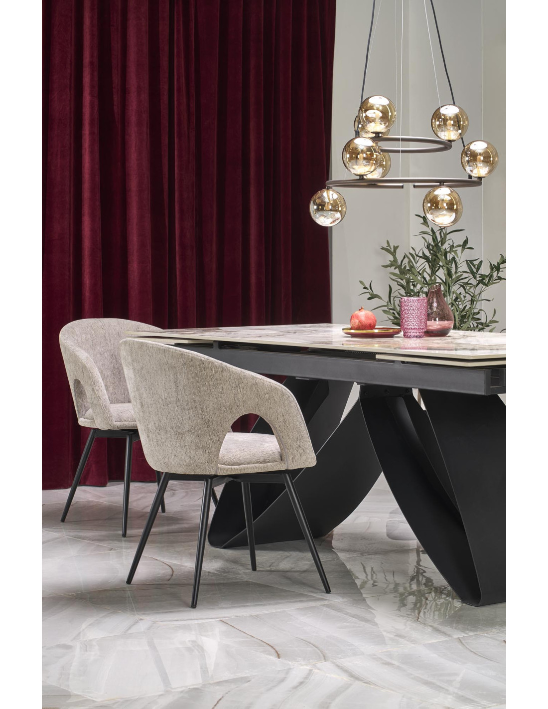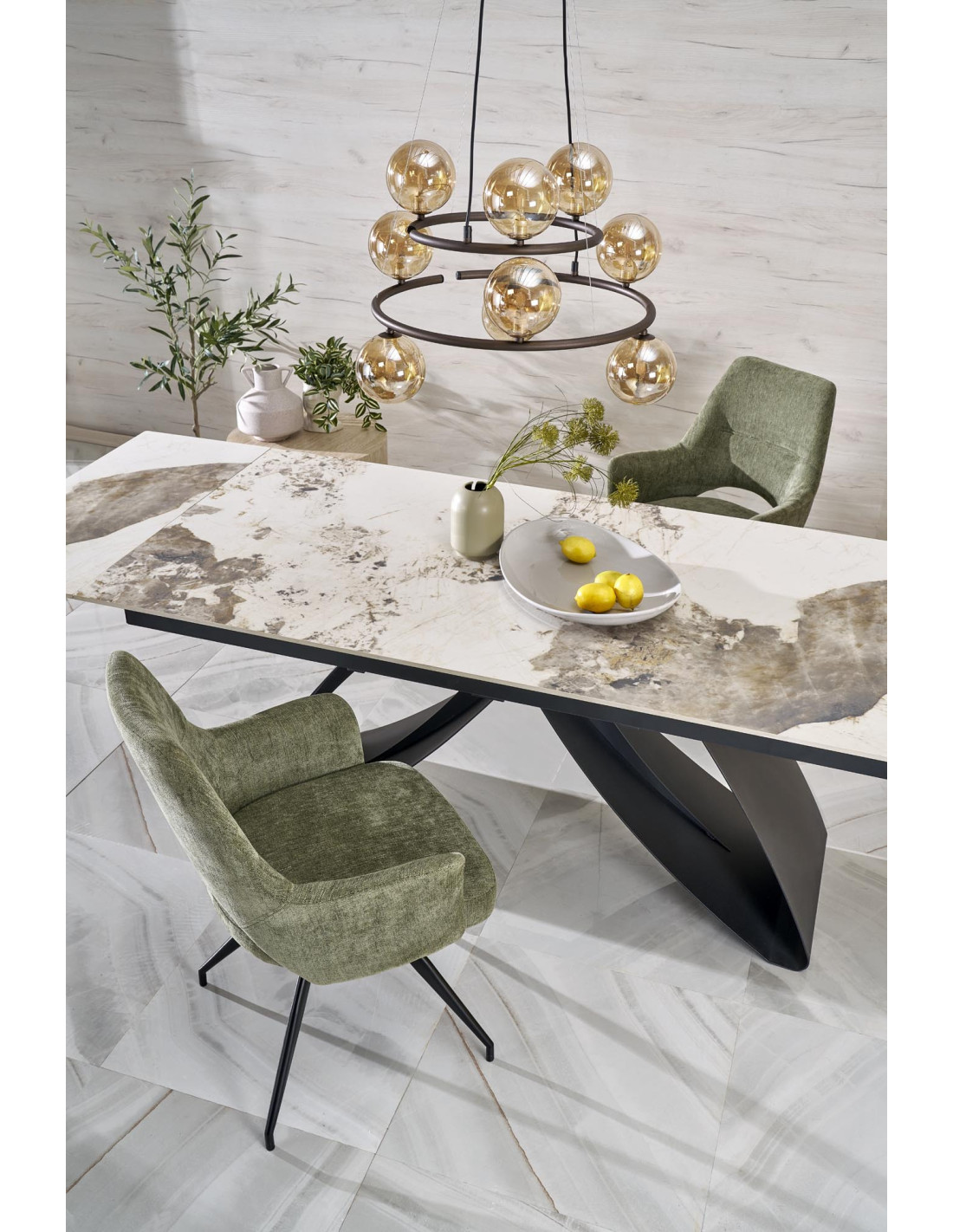 Stół HILARIO wykonany jest z blatu ze spieku oraz stalowych nóg malowanych proszkowo.