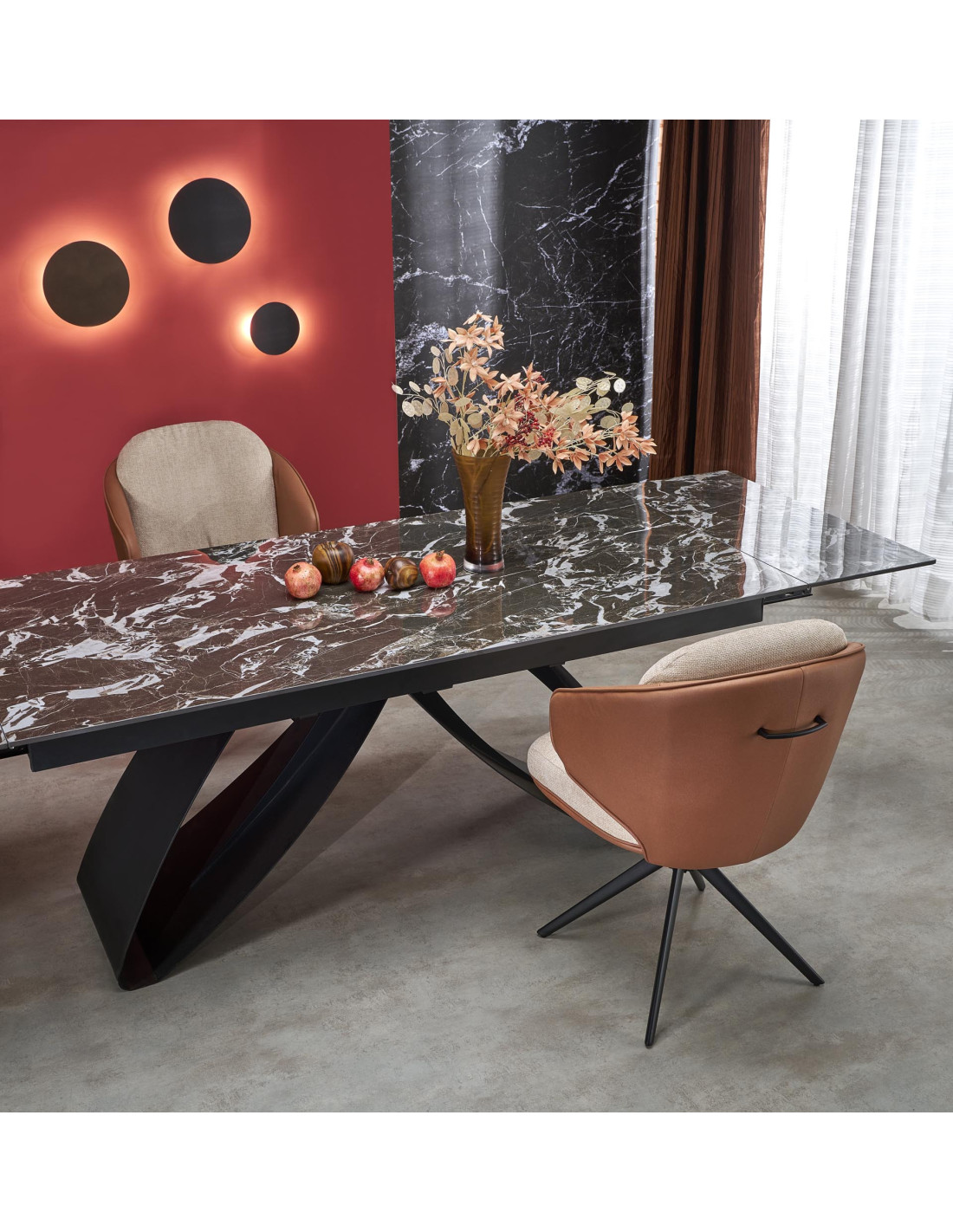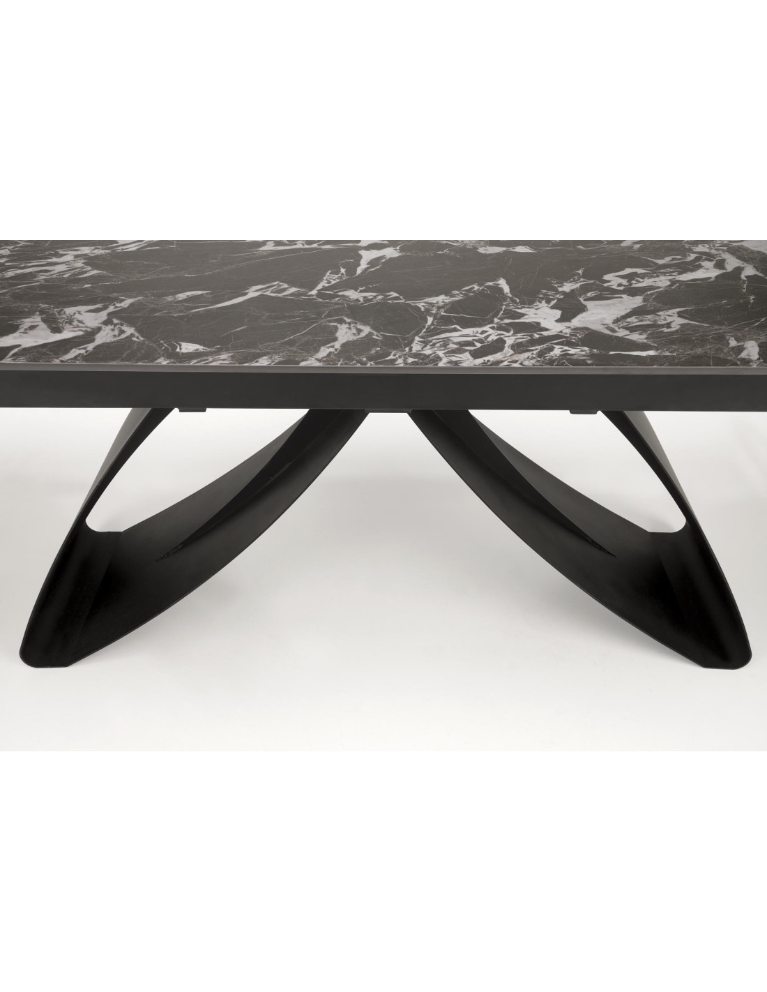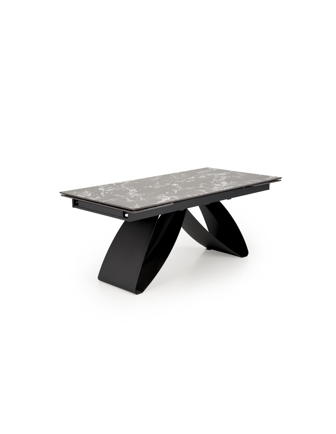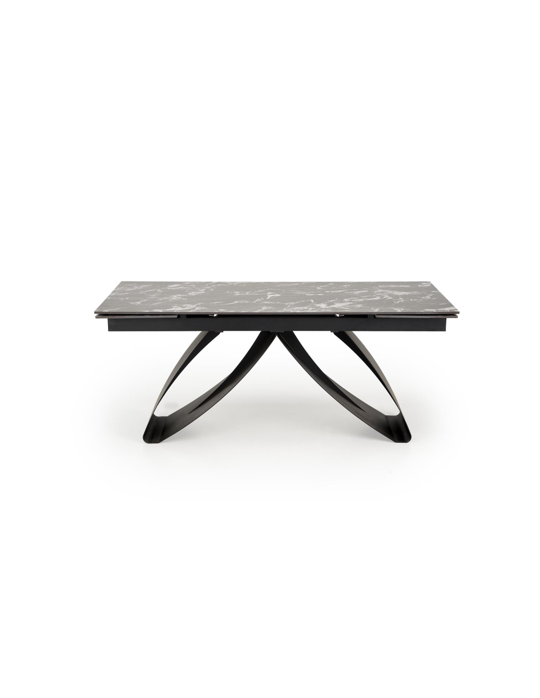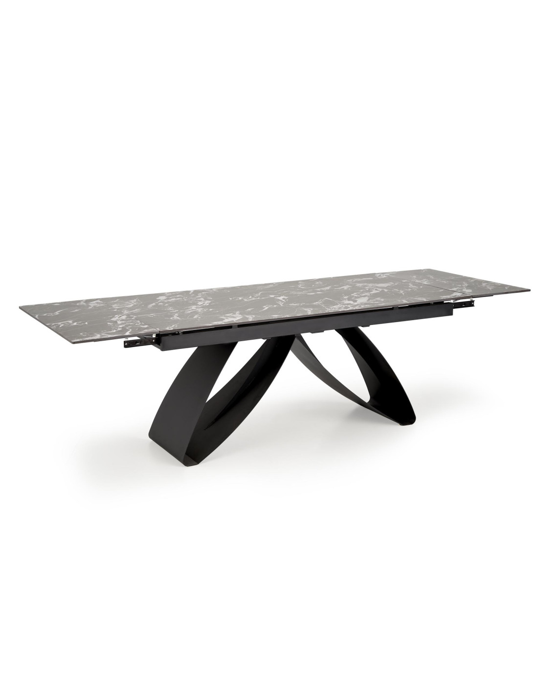 Ciesz się wyjątkowym designem rozszerzanego stołu HILARIO, który wprowadza do Twojego wnętrza nowoczesny styl oraz funkcjonalność! Blat wykonany z eleganckiego spieku w kolorze czarnego marmuru, z widocznymi jasnymi żyłkami, przyciąga wzrok i nadaje każdemu pomieszczeniu wyrafinowanego charakteru. Solidne, czarne nogi o geometrycznym kształcie tworzą stabilną konstrukcję, idealnie wpasowując się w minimalistyczne aranżacje.