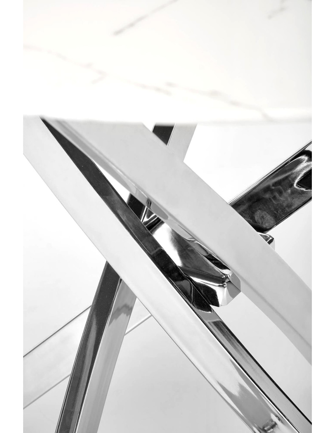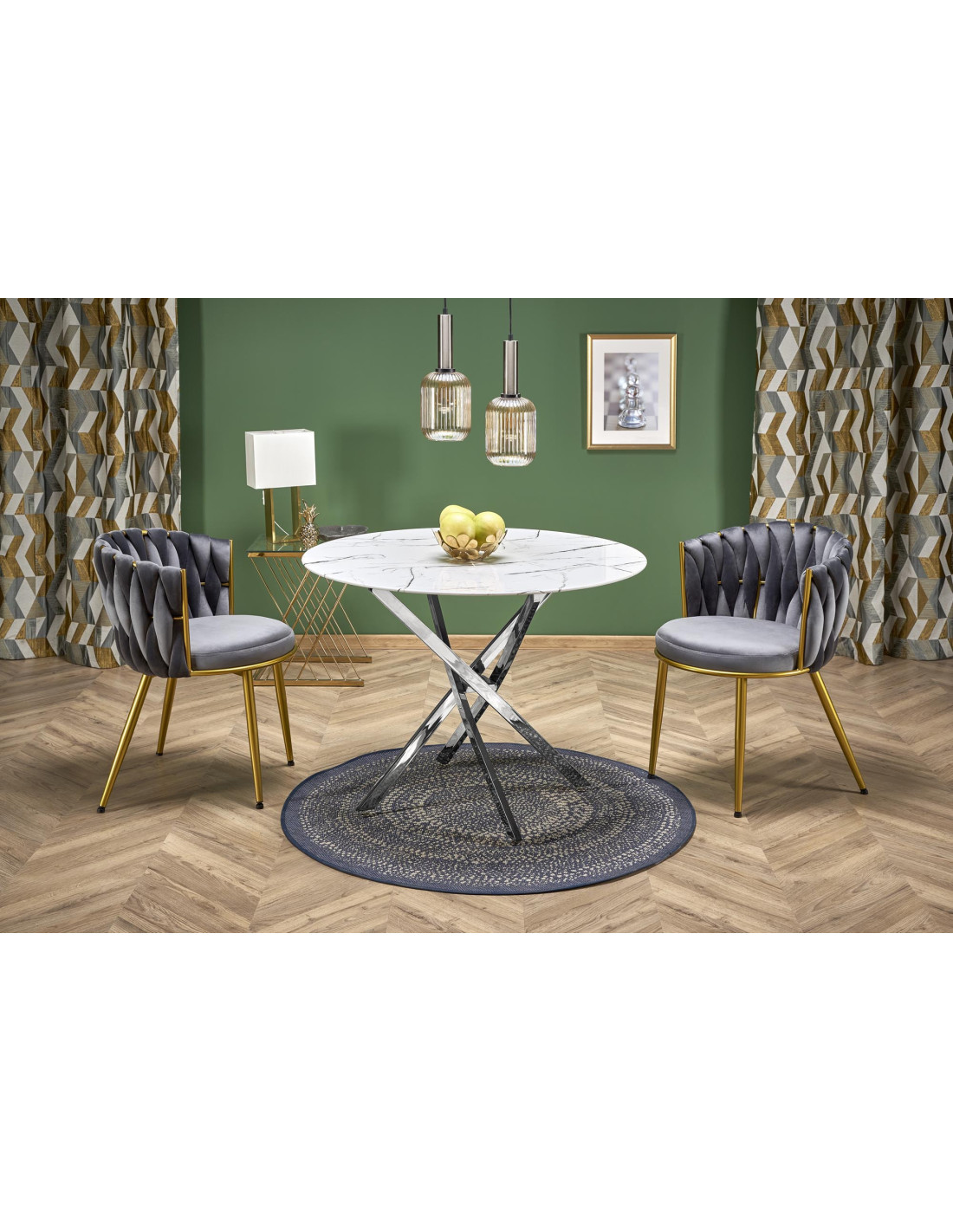 Ciesz się wyjątkowym designem stołu okrągłego RAYMOND, który doskonale łączy styl nowoczesny z elegancją glamour. Jego okrągły kształt oraz szklany blat w kolorze białego marmuru sprawiają, że stół przyciąga wzrok i staje się centralnym punktem każdego wnętrza. Delikatne szare żyłki w marmurowym wzorze dodają mu subtelności, a chromowane nogi w krzyżującym się wzorze podkreślają jego luksusowy charakter.