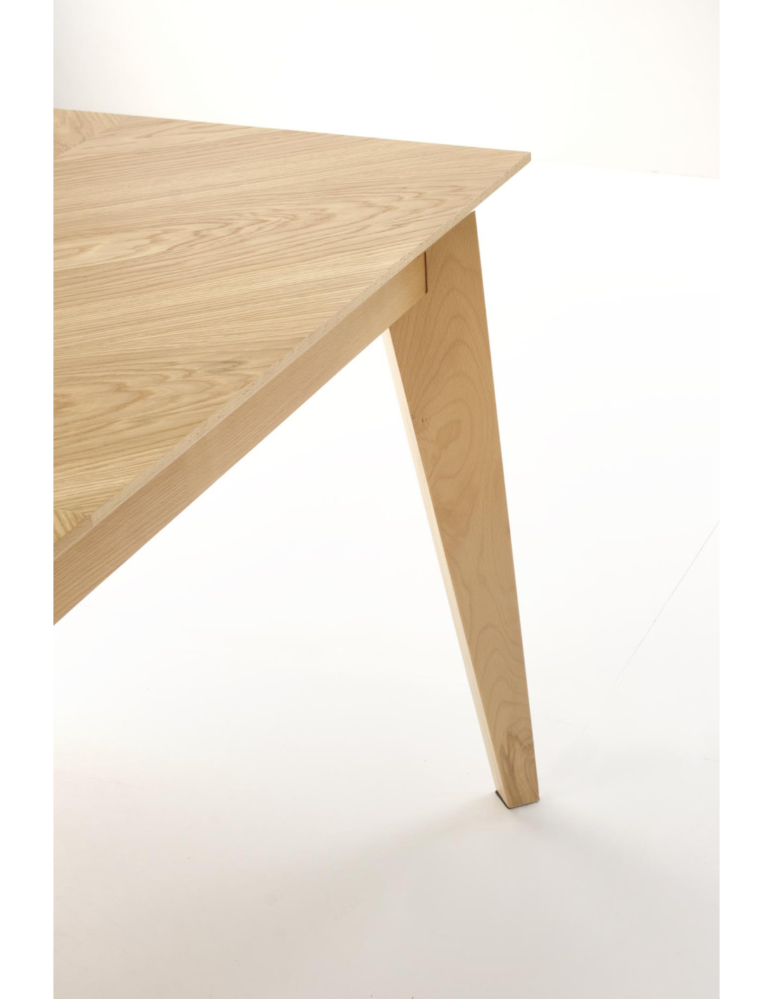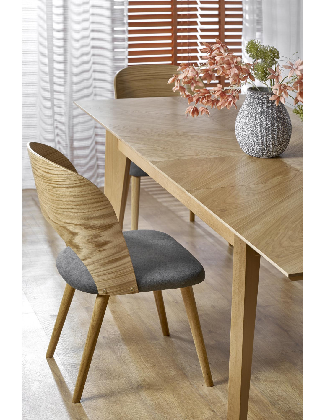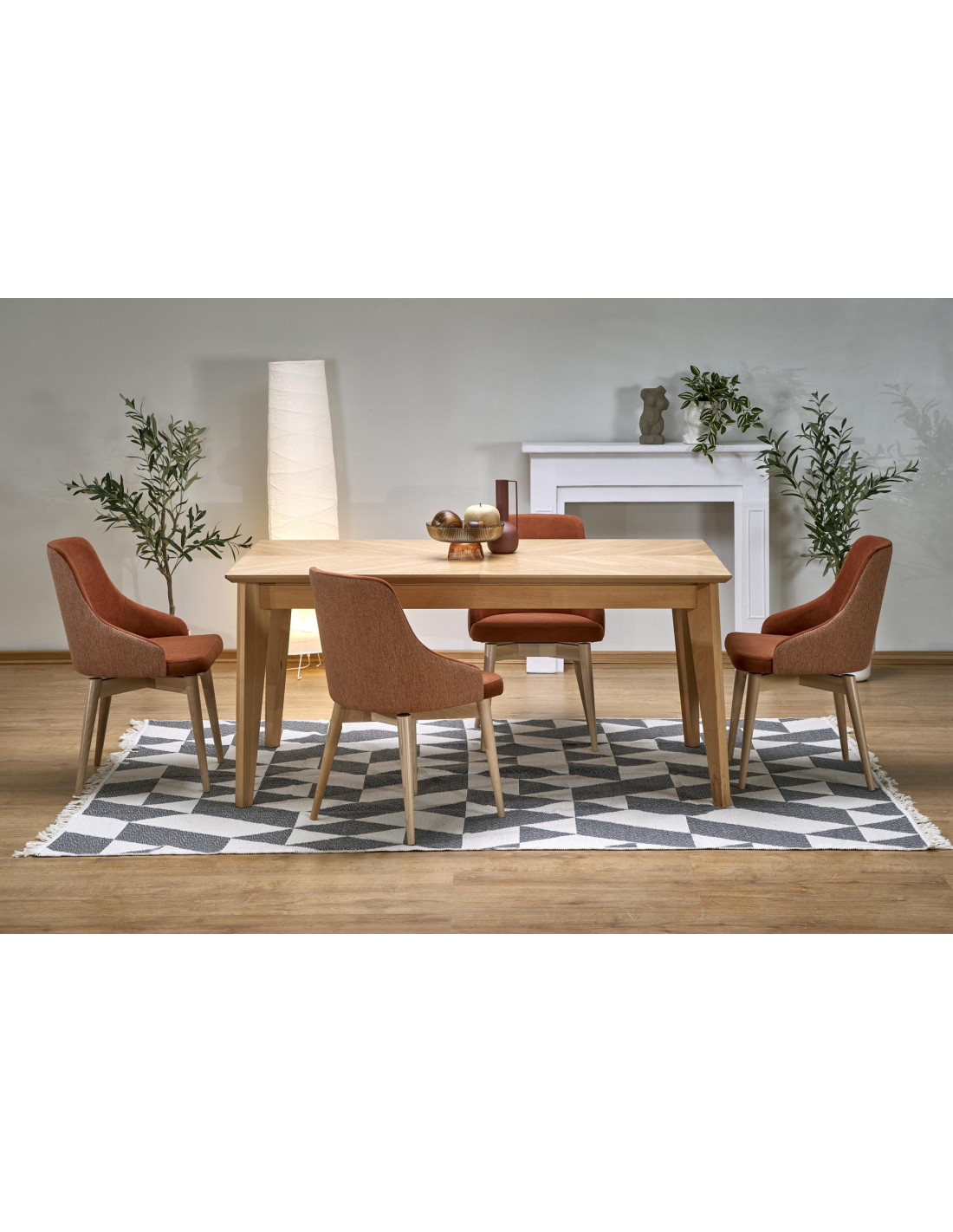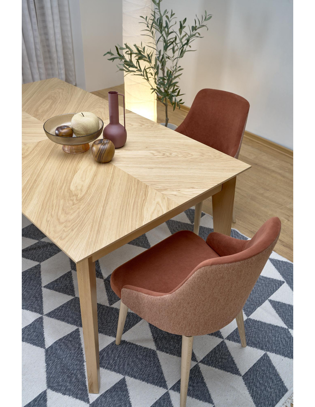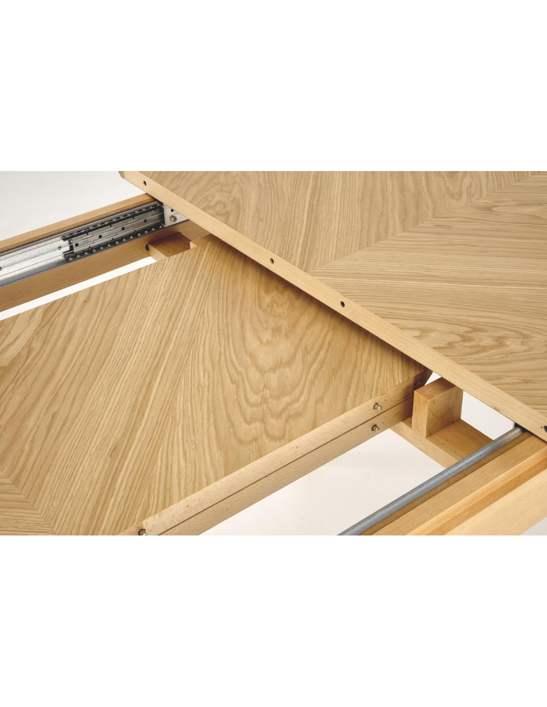 Blat stołu EDMONDO ma naturalne wykończenie z okleiną dębową, co podkreśla jego estetykę i unikalny charakter.