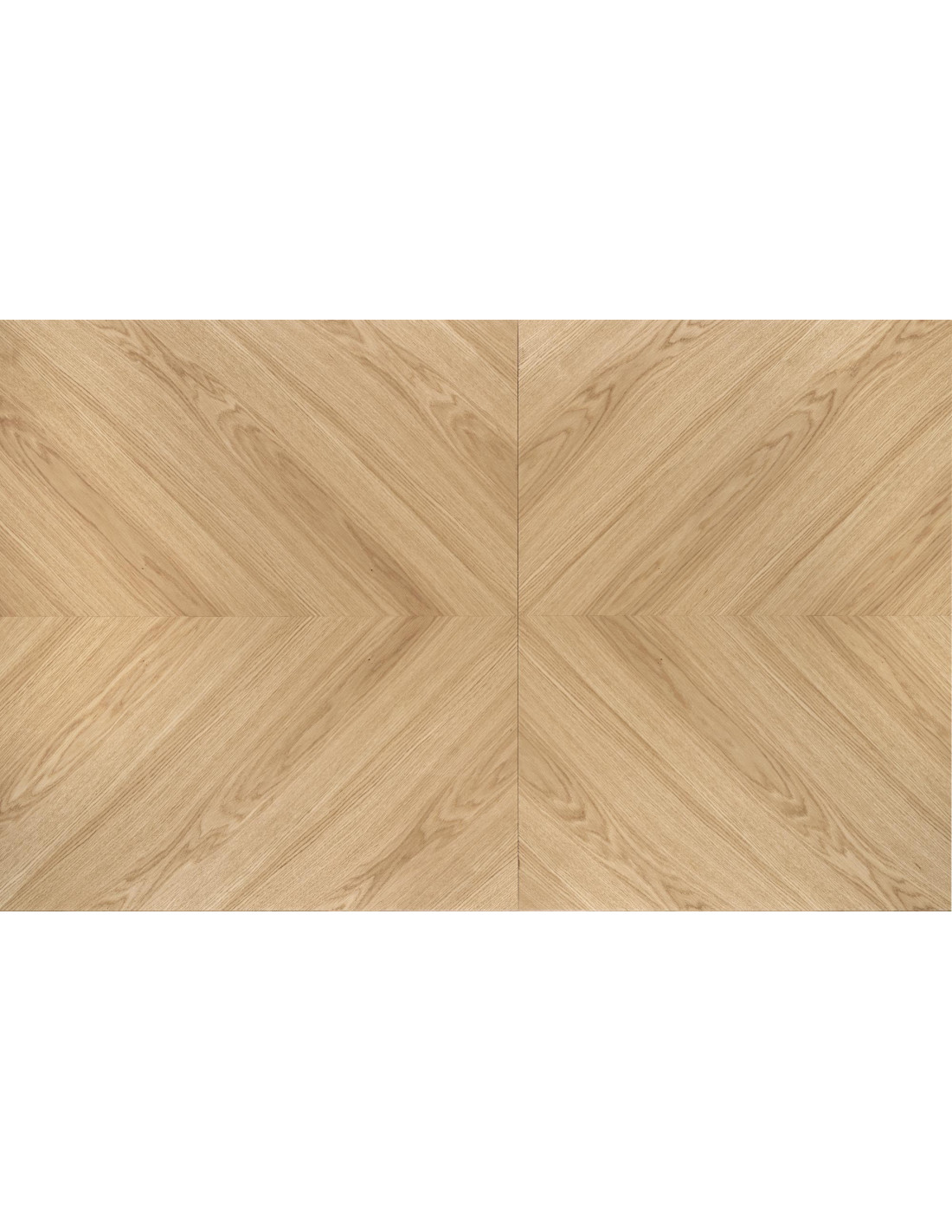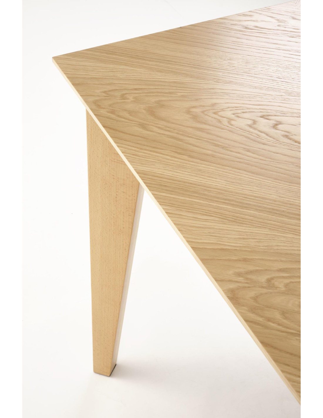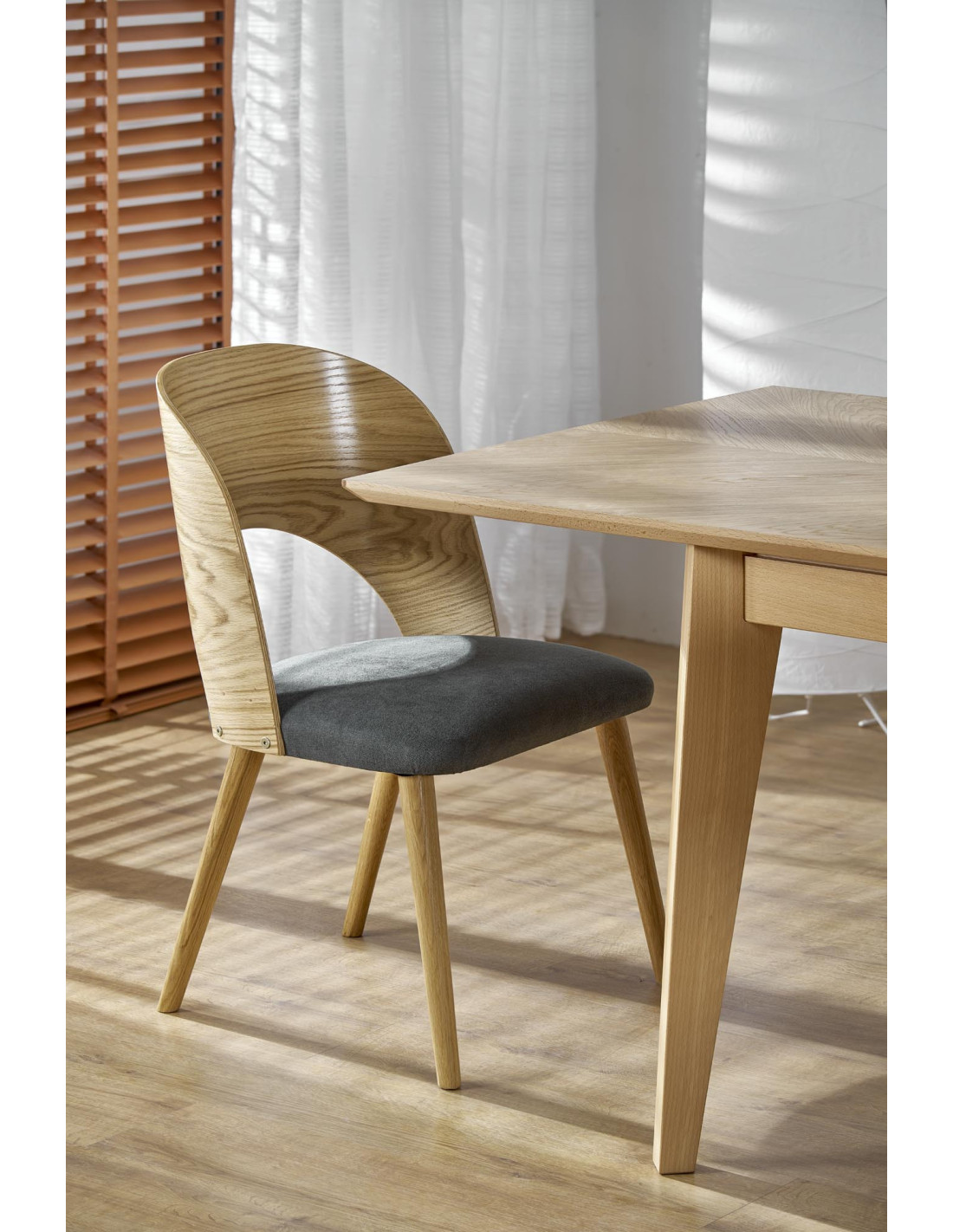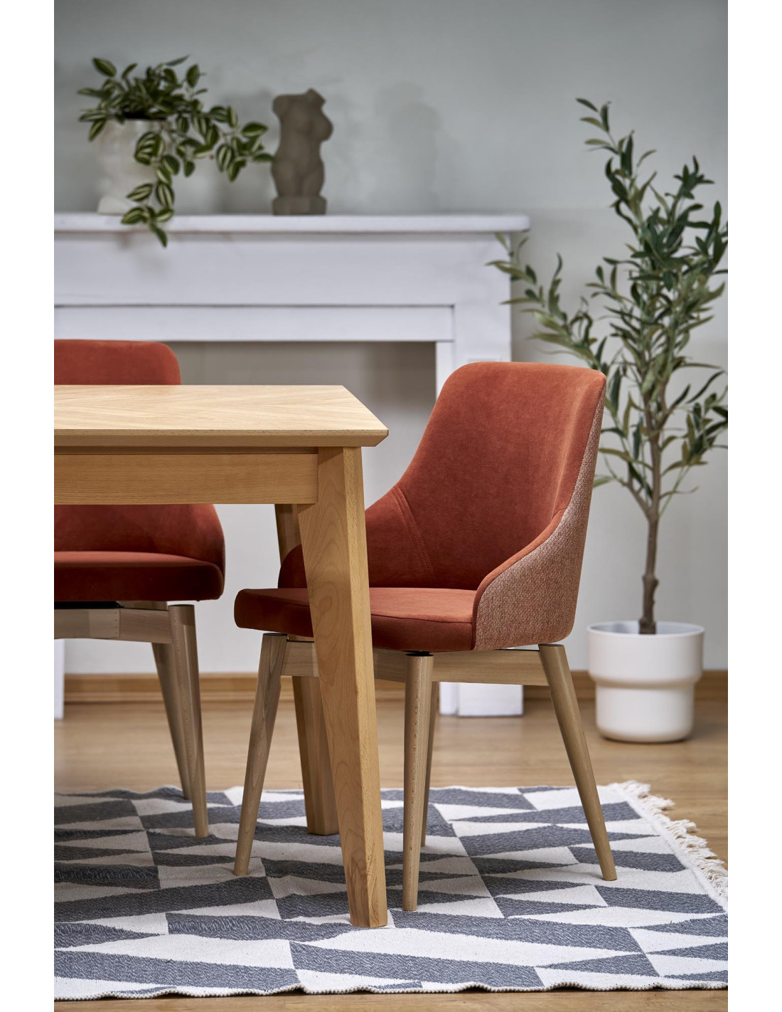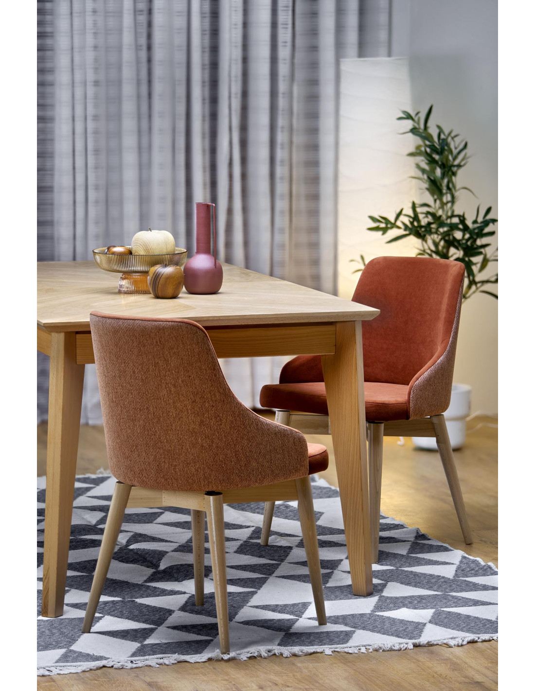 Blat stołu EDMONDO ma naturalne wykończenie z okleiną dębową, co podkreśla jego estetykę i unikalny charakter.