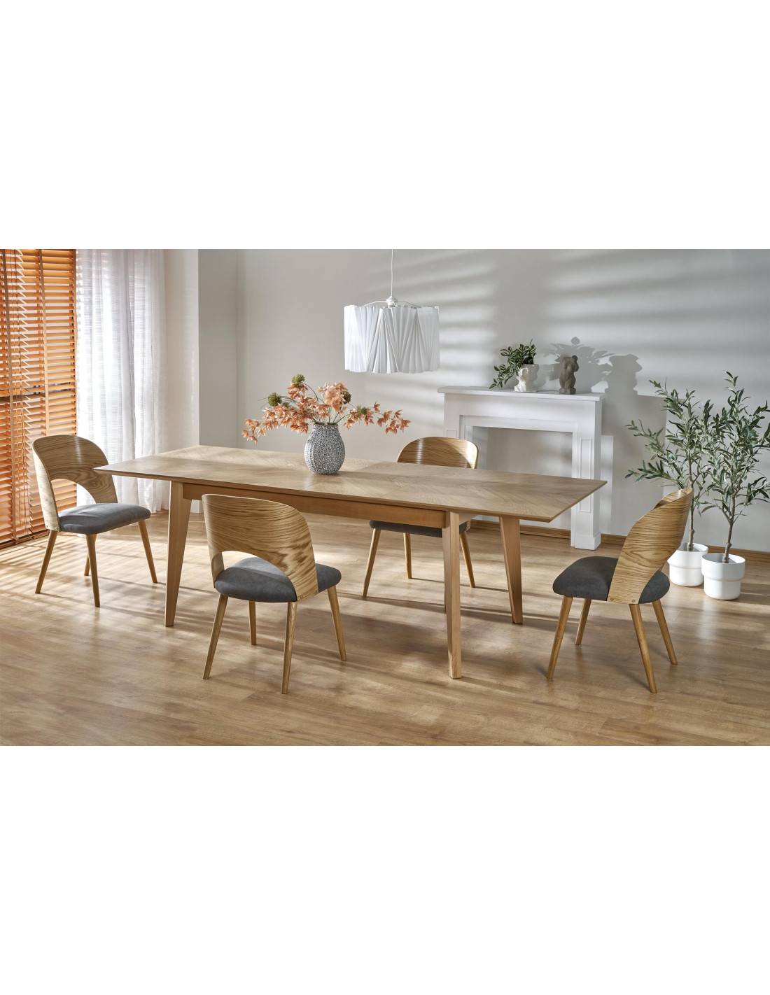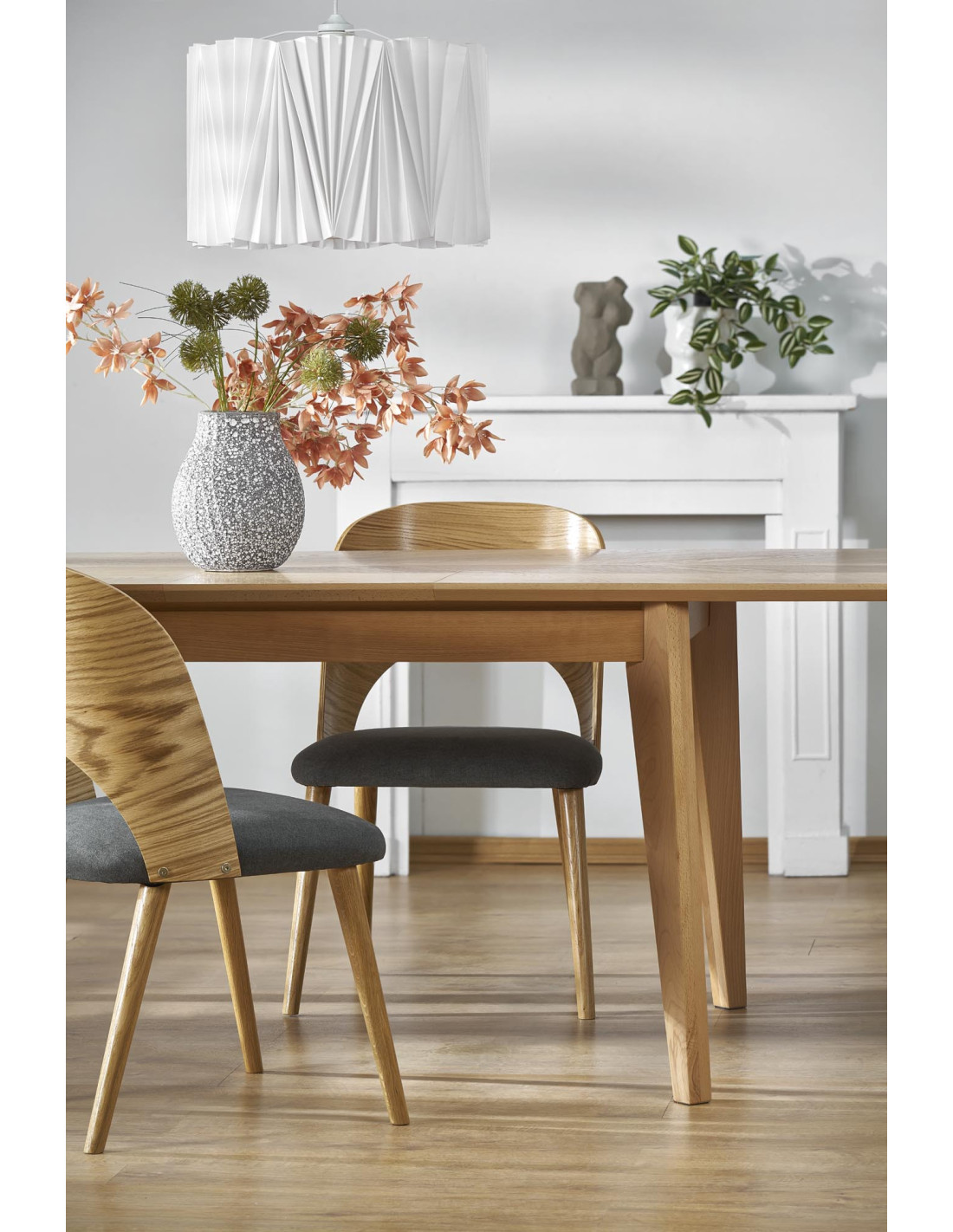 Stół EDMONDO to mebel rozkładany, co oznacza, że z łatwością dostosujesz jego długość od 160 cm do 240 cm, co czyni go sprawdzonym rozwiązaniem zarówno na codzienne posiłki, jak i na większe spotkania z rodziną i przyjaciółmi. Dwie wkładki chowane wewnątrz stołu zapewniają dodatkową przestrzeń w razie potrzeby, a nogi lekko zwężane ku dołowi dodają mu nowoczesności i elegancji.