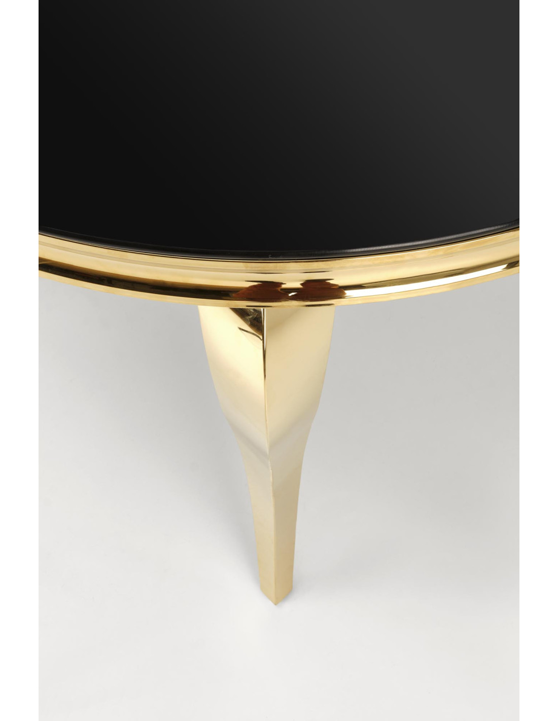 Stół GORINO2 wykonany jest z czarnego szkła oraz stali nierdzewnej w kolorze złotym.