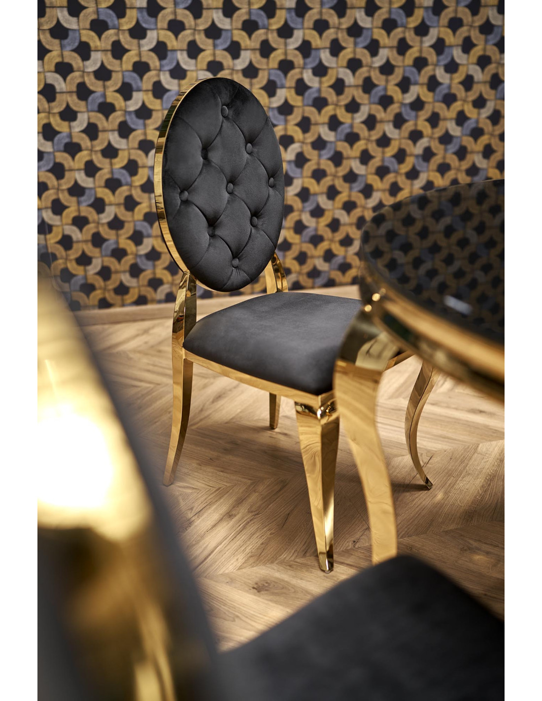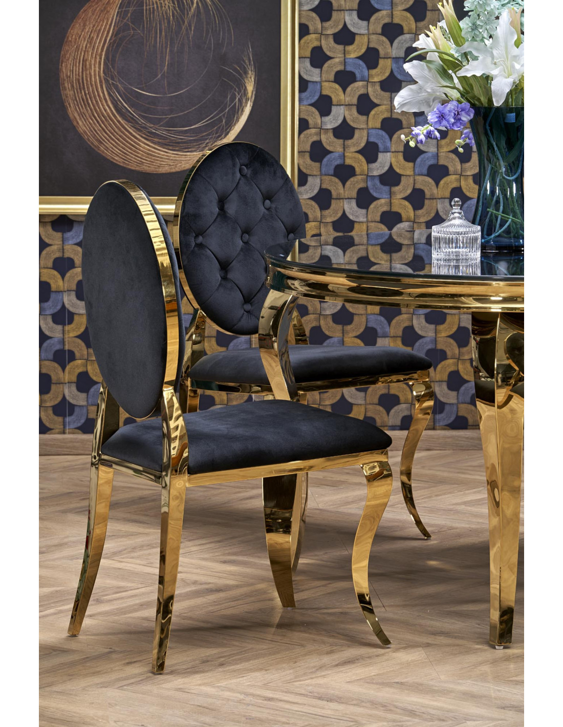 Stwórz doskonałe wnętrze z okrągłym stołem GORINO2, który łączy luksusowy design z funkcjonalnością. Jego czarny, szklany blat o średnicy 120 cm oraz wysokości 76 cm to idealna powierzchnia do spotkań i rodzinnych obiadów. Złote, faliste nogi dodają mu niepowtarzalnego charakteru, a styl glamour sprawia, że stół stanie się centralnym punktem każdego pomieszczenia.