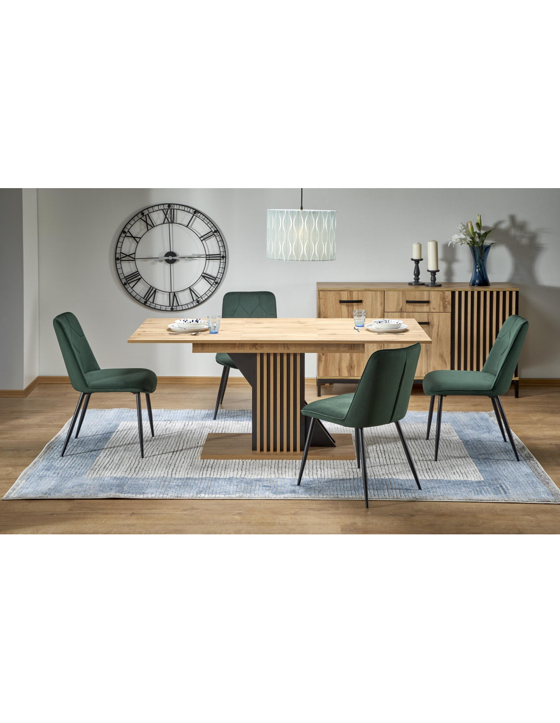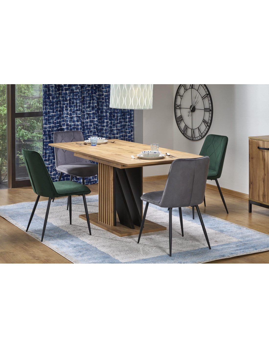 Szukasz rozwiązania? Oto ono! Rozkładany stół FABIANO to idealna synonim elegancji i funkcjonalności! Wykonany w kolorach dąb wotan i czarnym, stół o prostokątnym blacie z płyty meblowej laminowanej w jasnym odcieniu drewna, doskonale wpisuje się w nowoczesne oraz skandynawskie aranżacje. Jego masywna podstawa z pionowymi, skośnymi listewkami nie tylko przyciąga wzrok, ale również zapewnia stabilność, co czyni go idealnym wyborem do każdej jadalni.