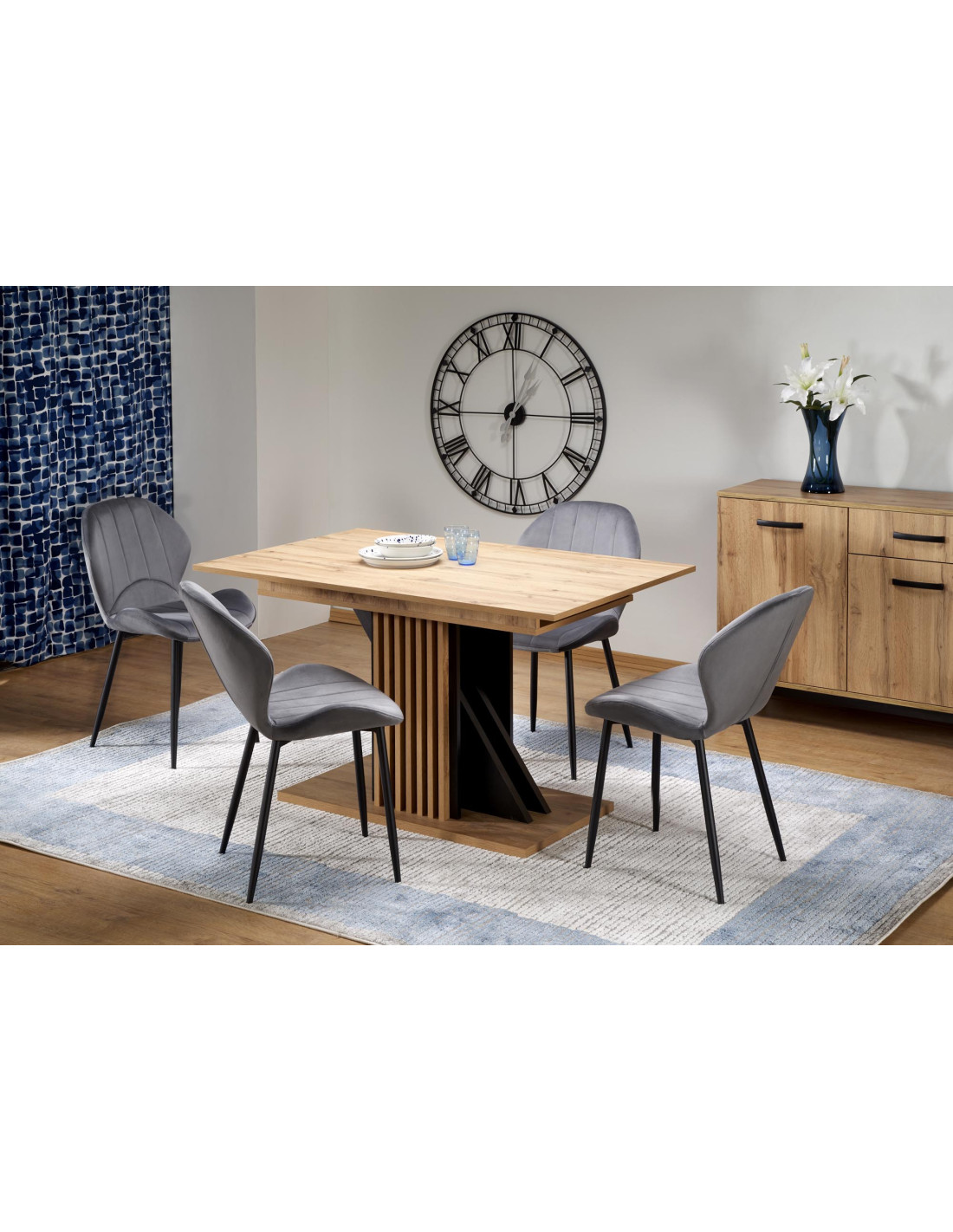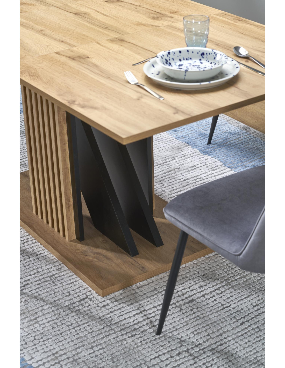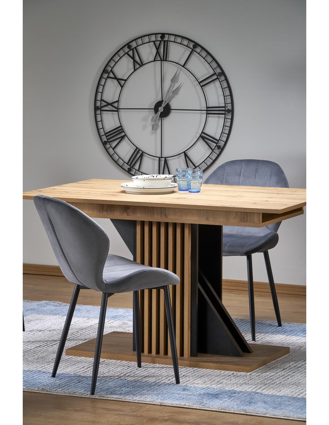 Charakterystyczny design z masywną podstawą oraz elegancki blat w kolorze dąb wotan sprawiają, że stół FABIANO jest wyjątkowy i funkcjonalny.