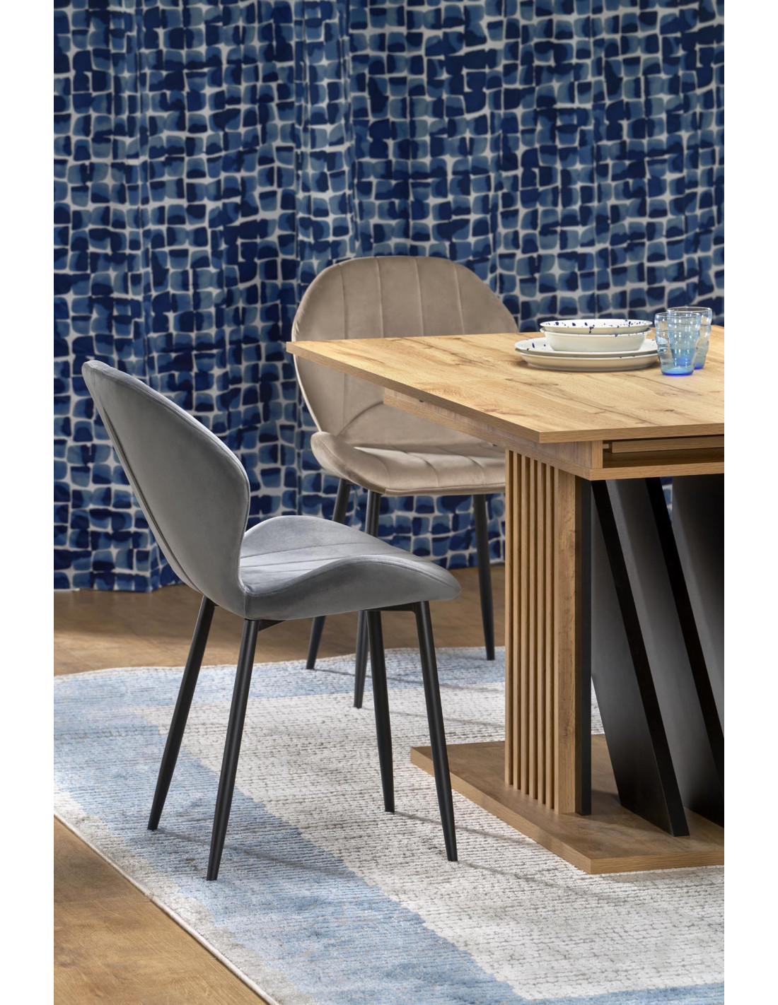 Stół FABIANO wykonany jest z płyty meblowej laminowanej oraz z dębu wotan i czarnego drewna.
