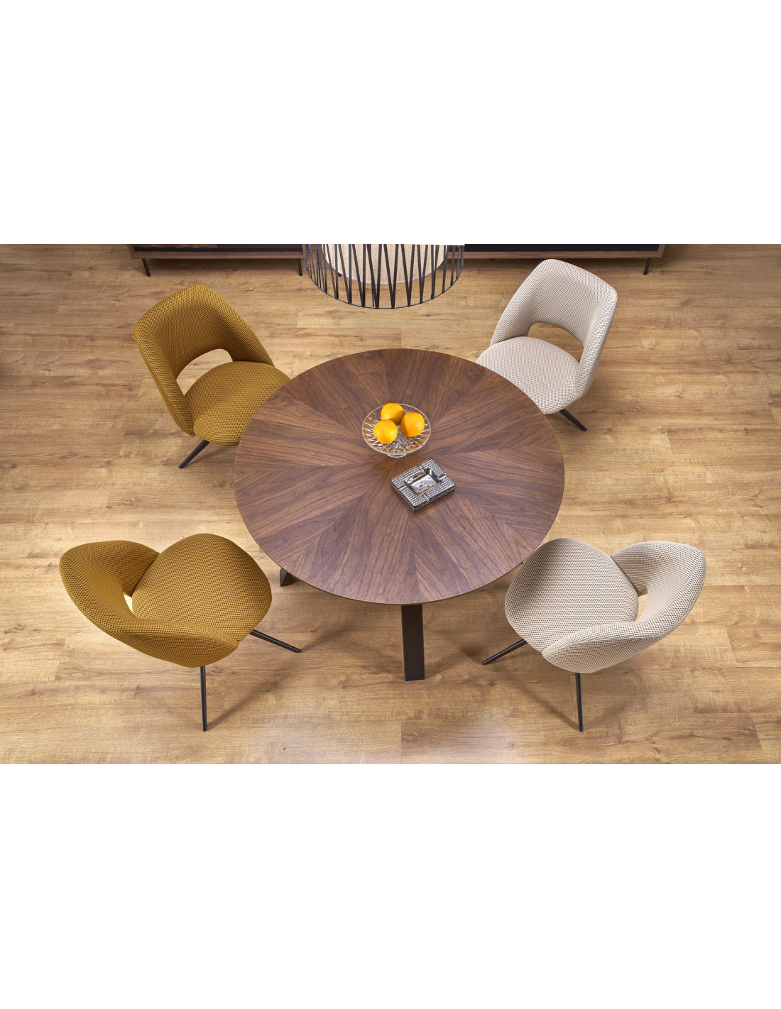 - ✅ Stylowy design: Okrągły kształt i orzechowy blat nadają elegancji każdemu wnętrzu.