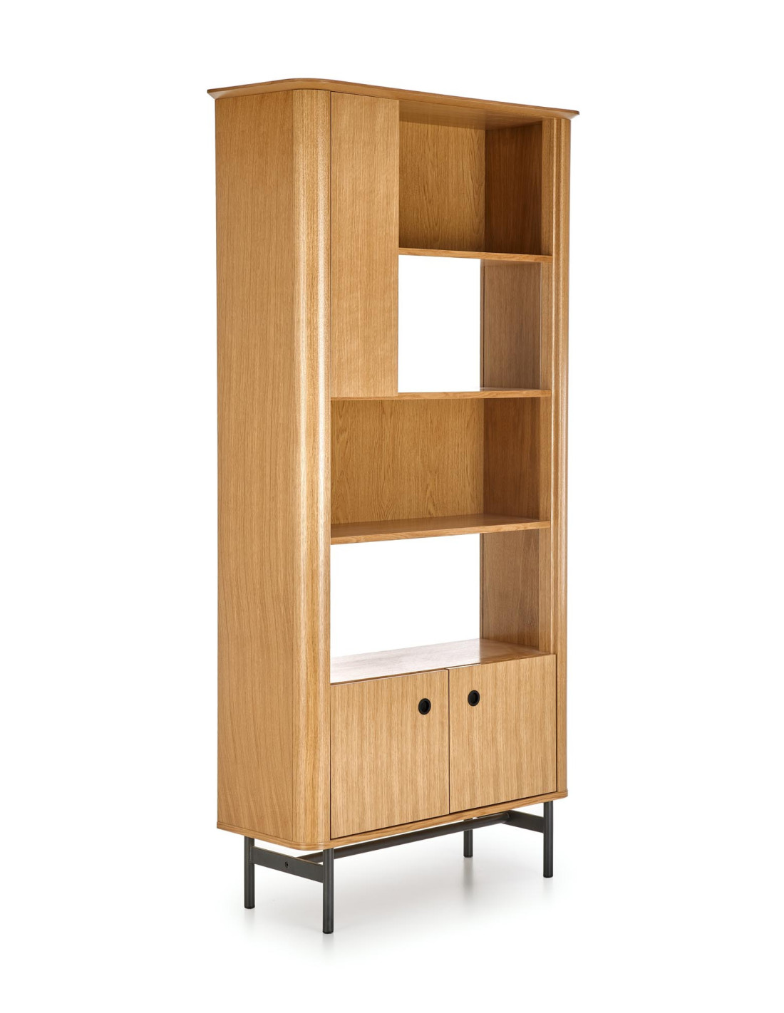 Regał wyposażony jest w kilka półek oraz dolną szafkę z dwoma drzwiami, co zapewnia mnóstwo miejsca na książki, dekoracje, a także inne niezbędne przedmioty. Czarne metalowe nogi nie tylko podkreślają jego nowoczesny wygląd, ale również gwarantują stabilność i trwałość.