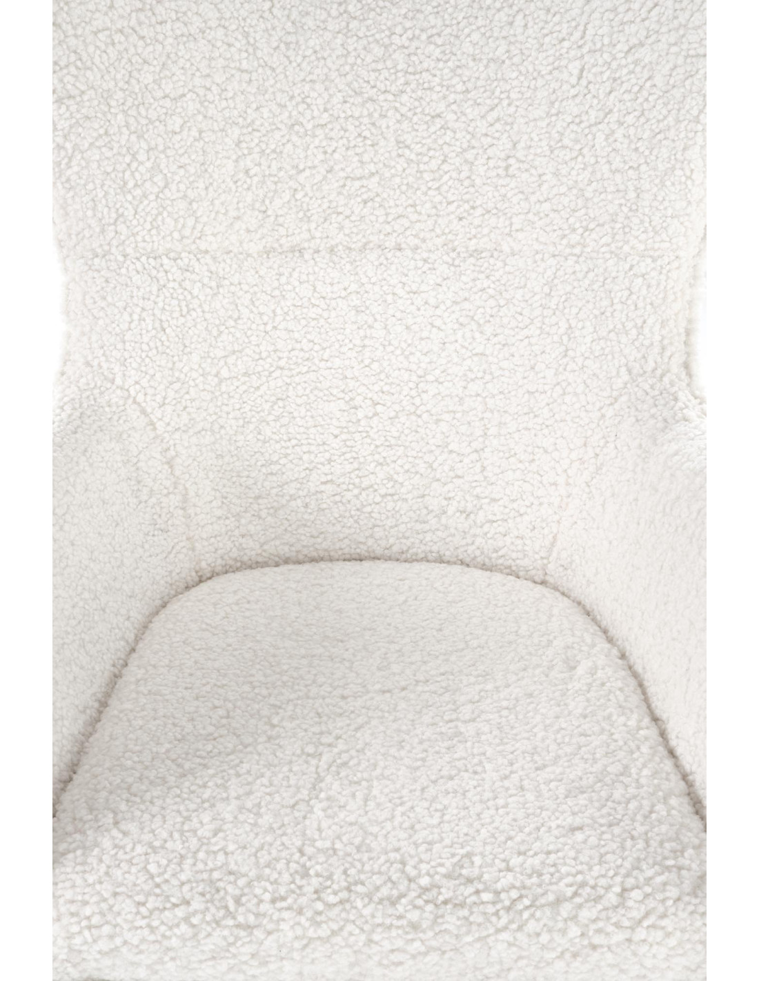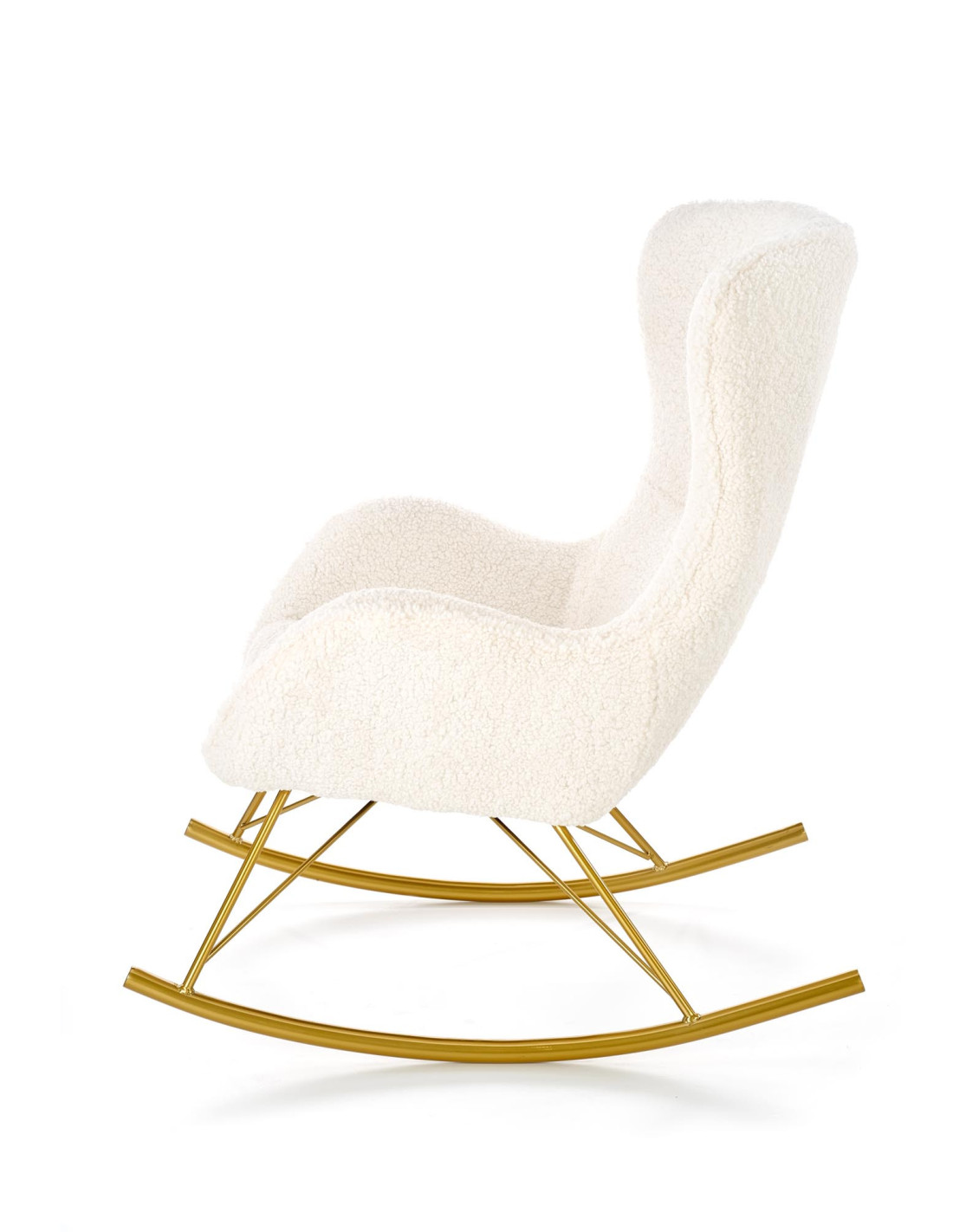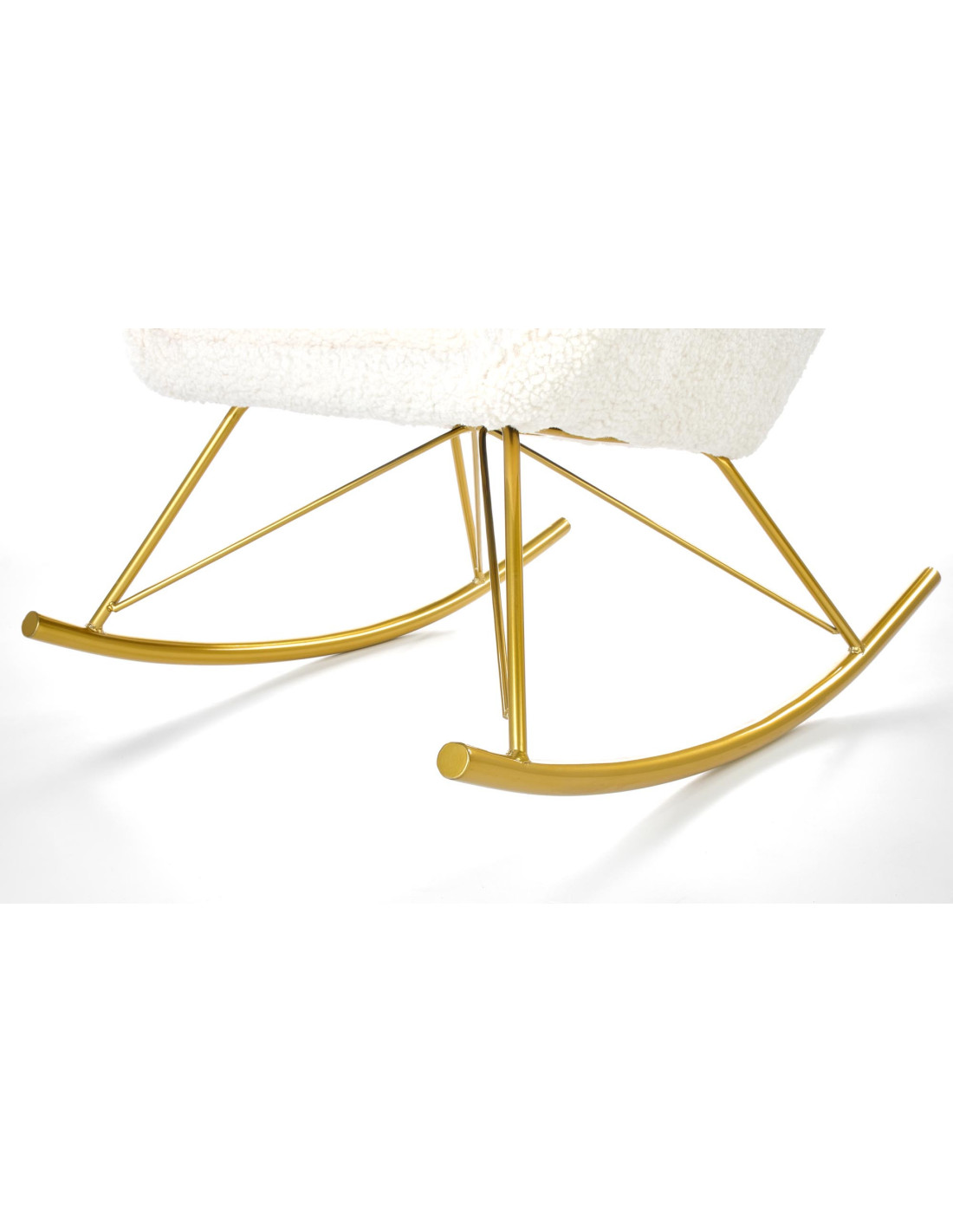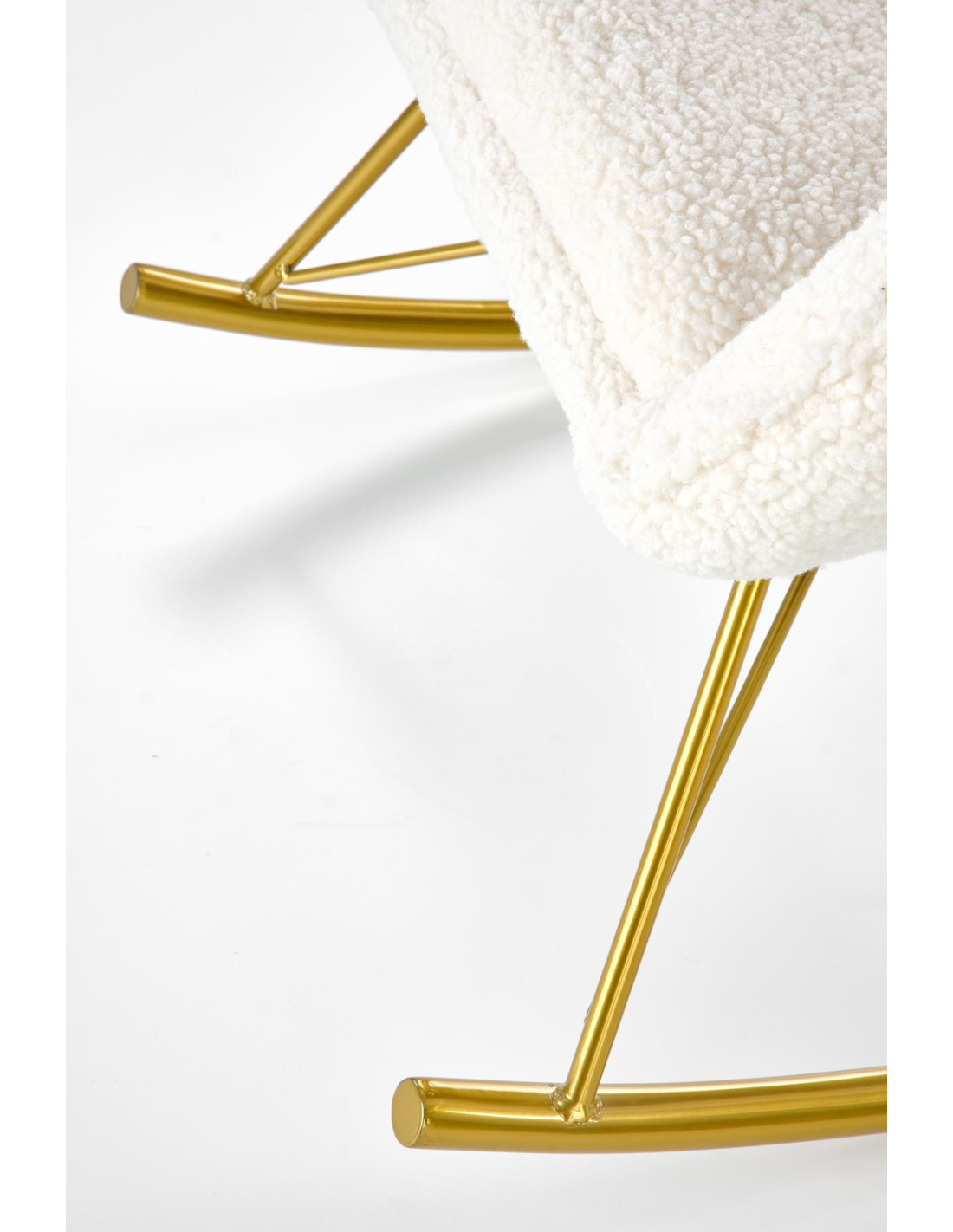 Stwórz doskonałe wnętrze z fotelem bujanym LIBERTO, który łączy w sobie luksusowy styl z niepowtarzalnym komfortem. Kremowy materiał w strukturze boucle, połączony z eleganckimi, złotymi nogami w formie płóz, sprawia, że ten fotel jest nie tylko meblem, ale również prawdziwym dziełem sztuki, które ożywi każdą przestrzeń.
