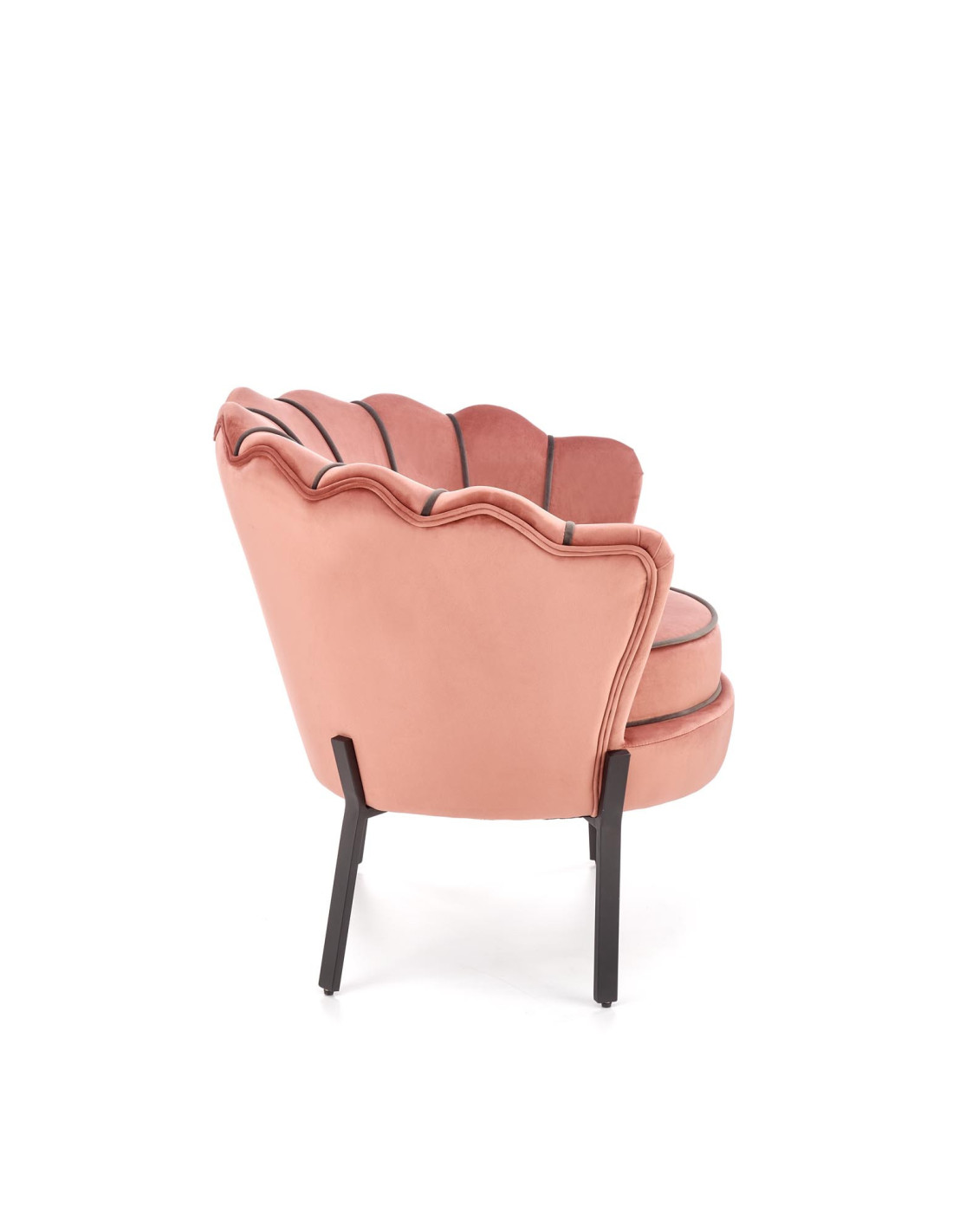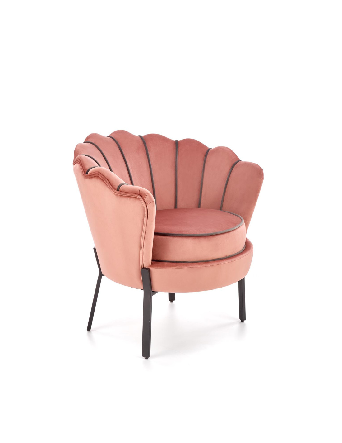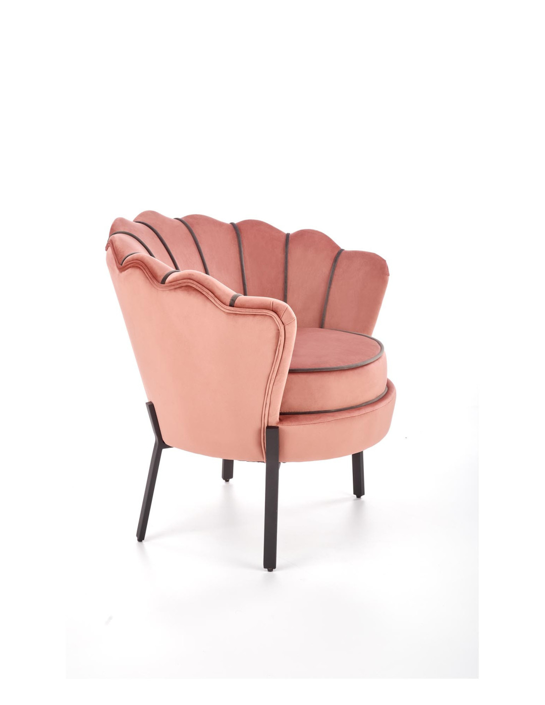 Wybierz fotel ANGELO, który przenosi komfort na zupełnie nowy poziom. Ten różowy fotel tapicerowany aksamitem (Bluvel 52) zachwyca zaokrąglonym kształtem z oparciem przypominającym muszlę, które jest pikowane i zdobione kontrastującymi, ciemniejszymi lamówkami. Dzięki cienkim, metalowym nogom w kolorze czarnym, fotel nie tylko przyciąga wzrok, ale również wprowadza elegancję do każdego wnętrza.
