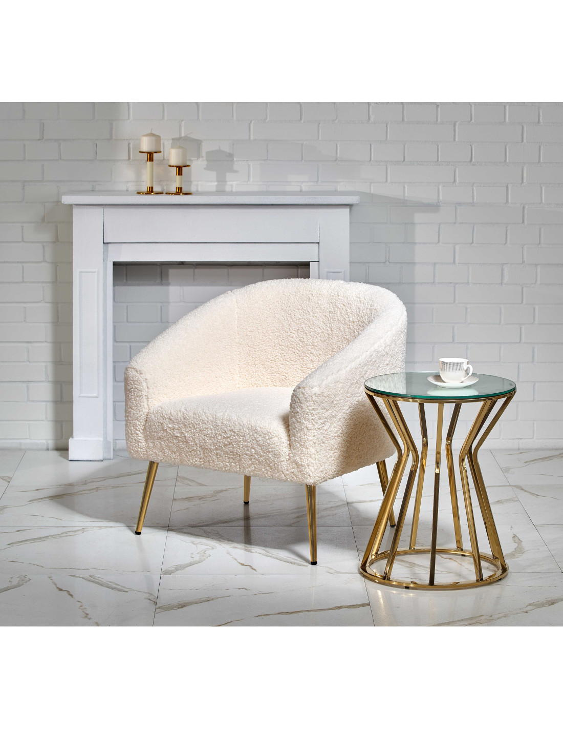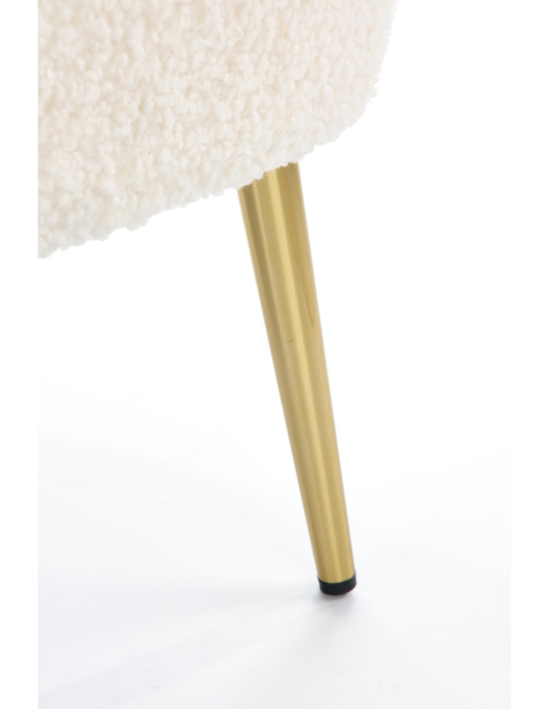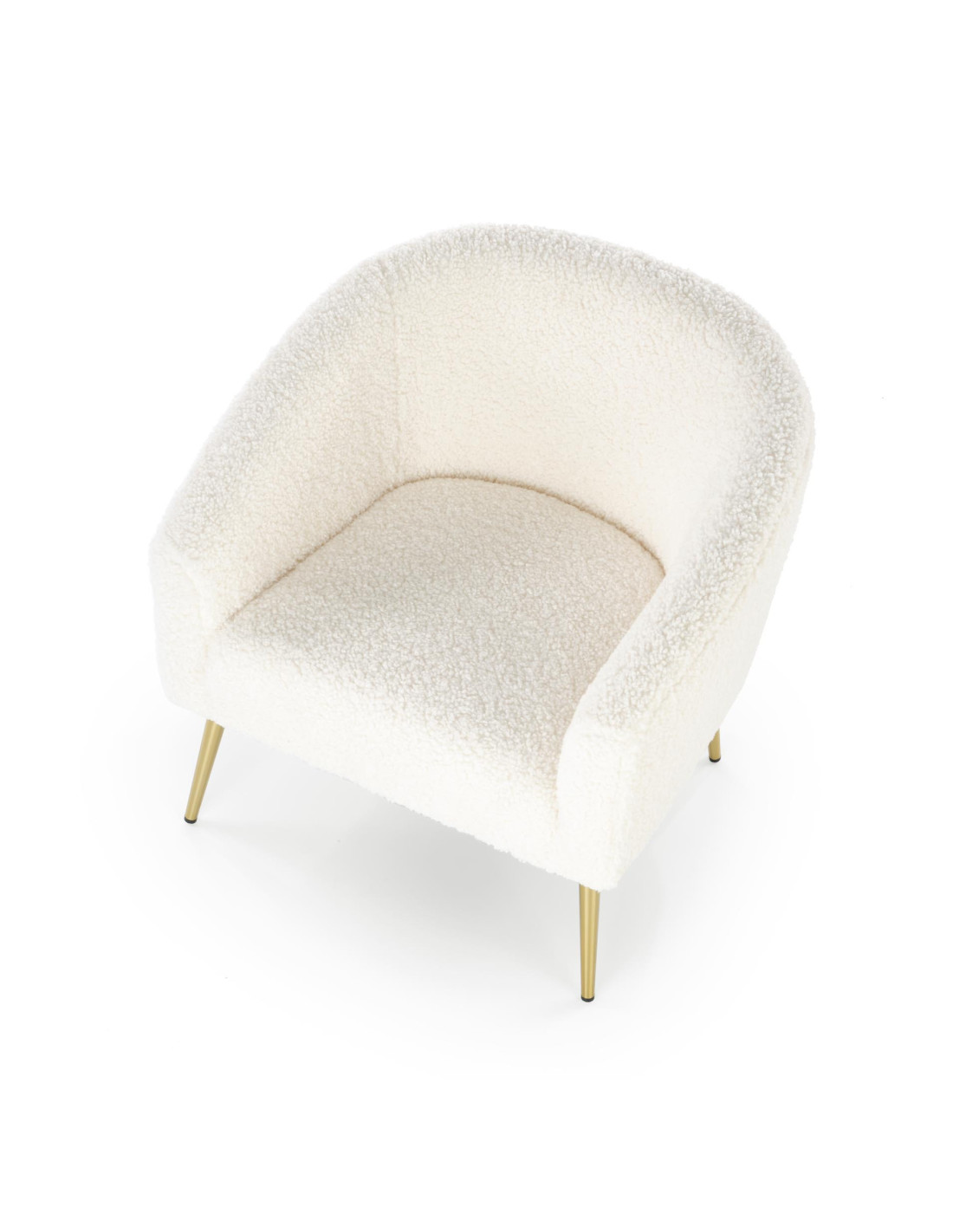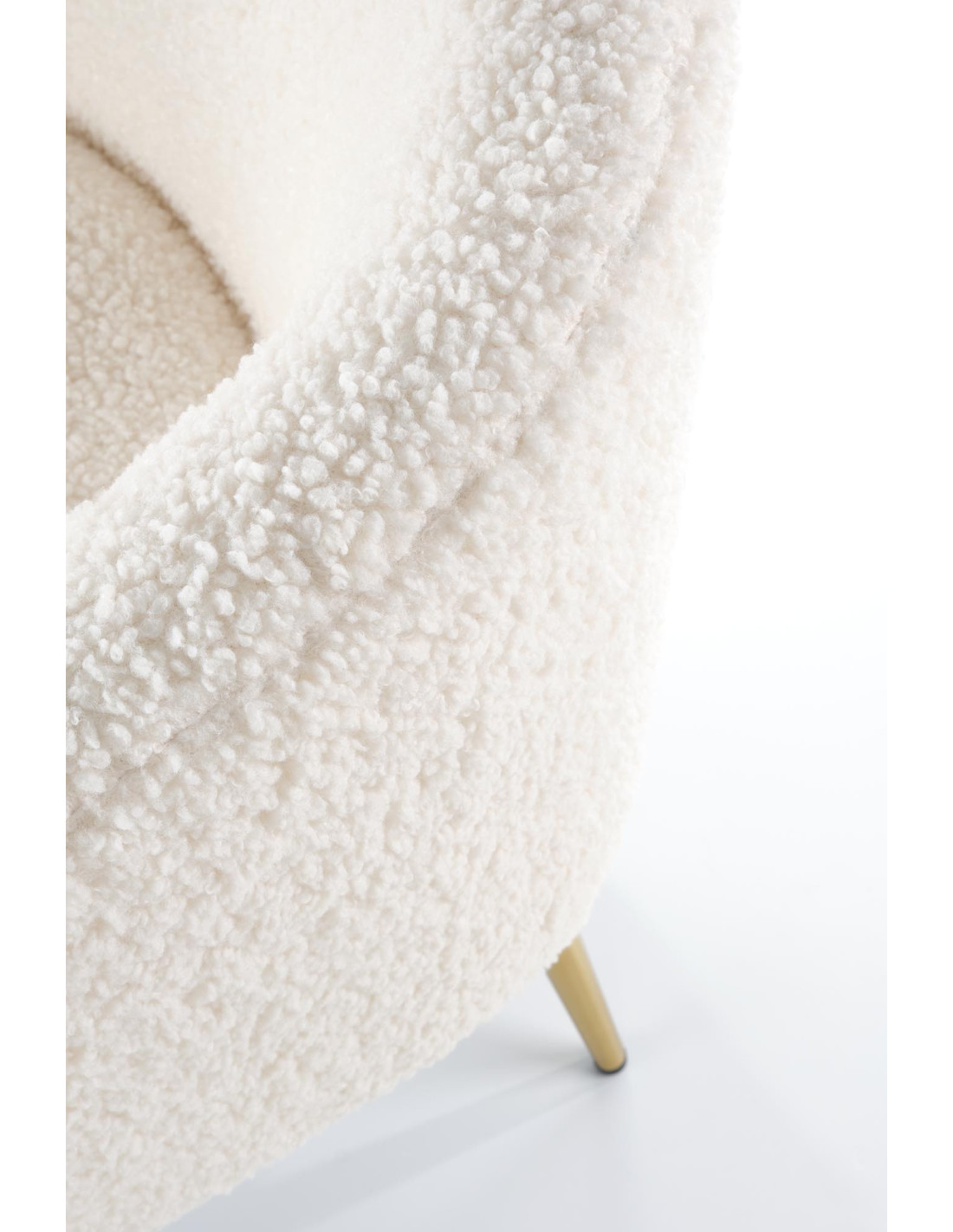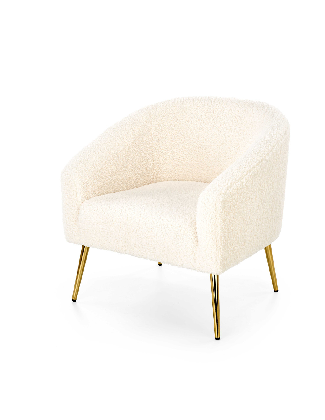 Fotel GRIFON wykonany jest z tkaniny bouclé oraz stalowych nóg w kolorze złotym.