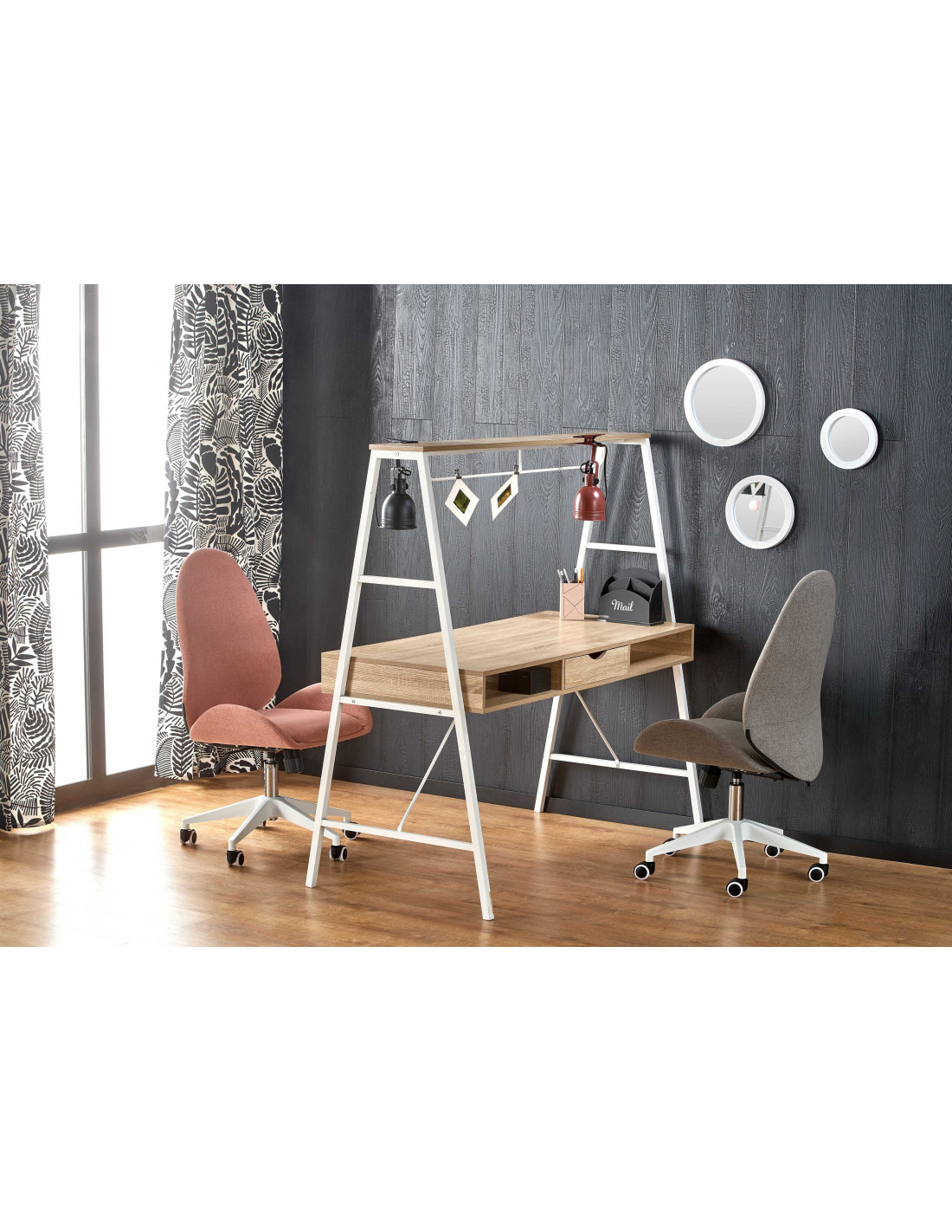 Biurko wykonane jest z płyty meblowej okleinowanej - melamina oraz stali malowanej proszkowo.