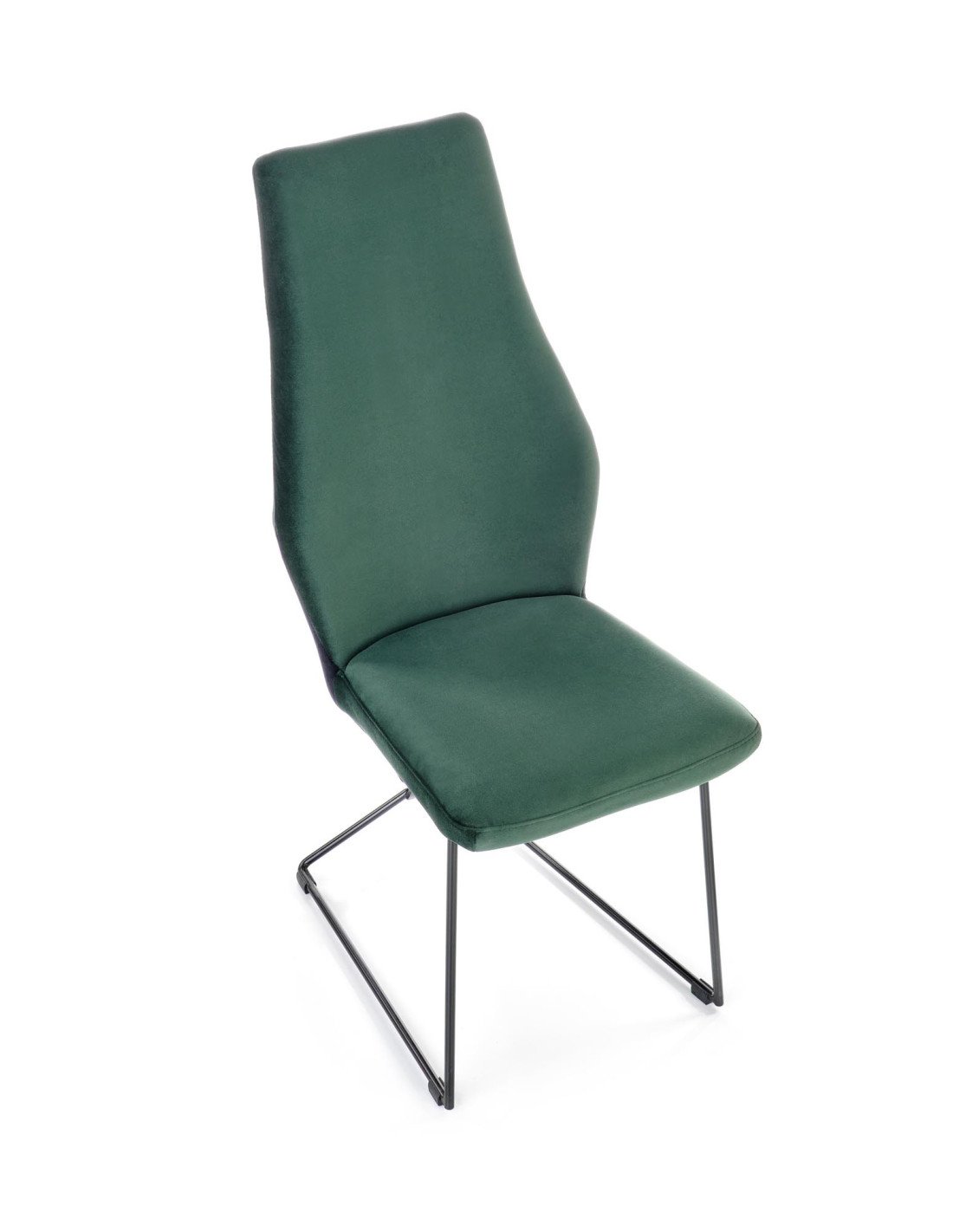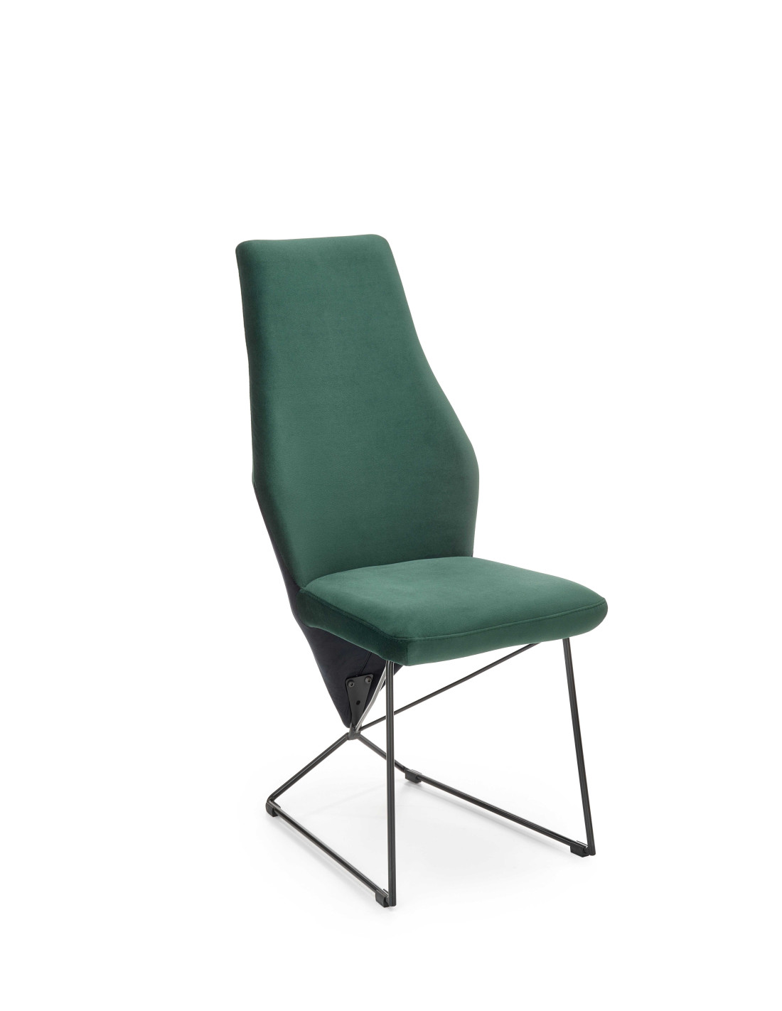 Zainspiruj się krzesłem K485, które łączy w sobie nowoczesność i elegancję. To wyjątkowe krzesło tapicerowane ciemnozielonym welurem wyróżnia się wysokim, zaokrąglonym tyłem, który płynnie przechodzi w ergonomiczne siedzisko. Dzięki smukłym, metalowym nogom w kolorze czarnym, krzesło przyciąga wzrok i nadaje każdemu wnętrzu niepowtarzalny charakter.