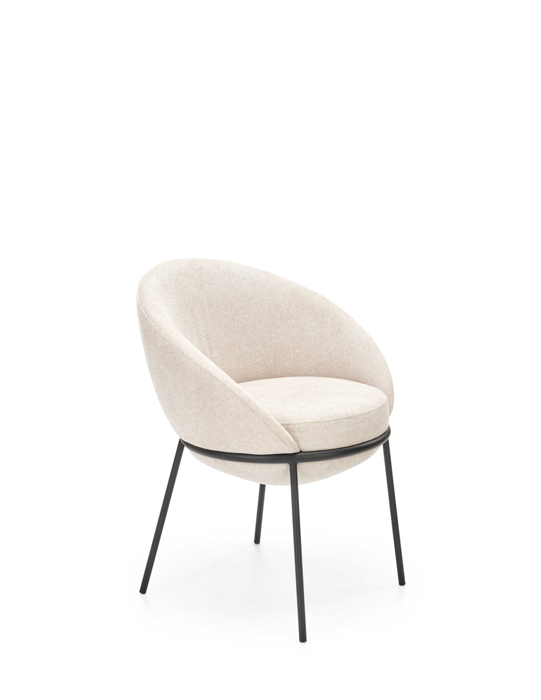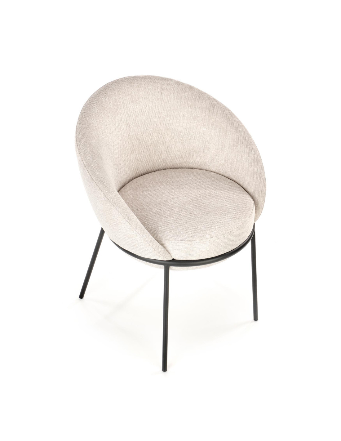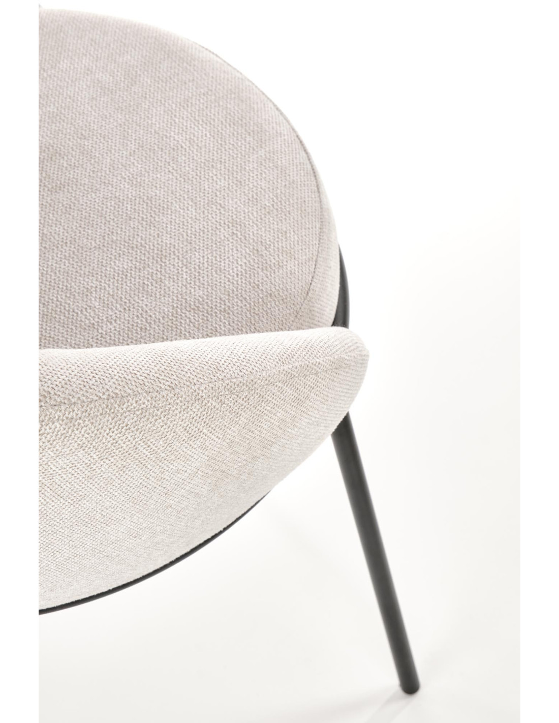 Krzesło wyróżnia się okrągłym siedziskiem, miękkim obiciem oraz nowoczesnym designem z czarnymi metalowymi nogami.