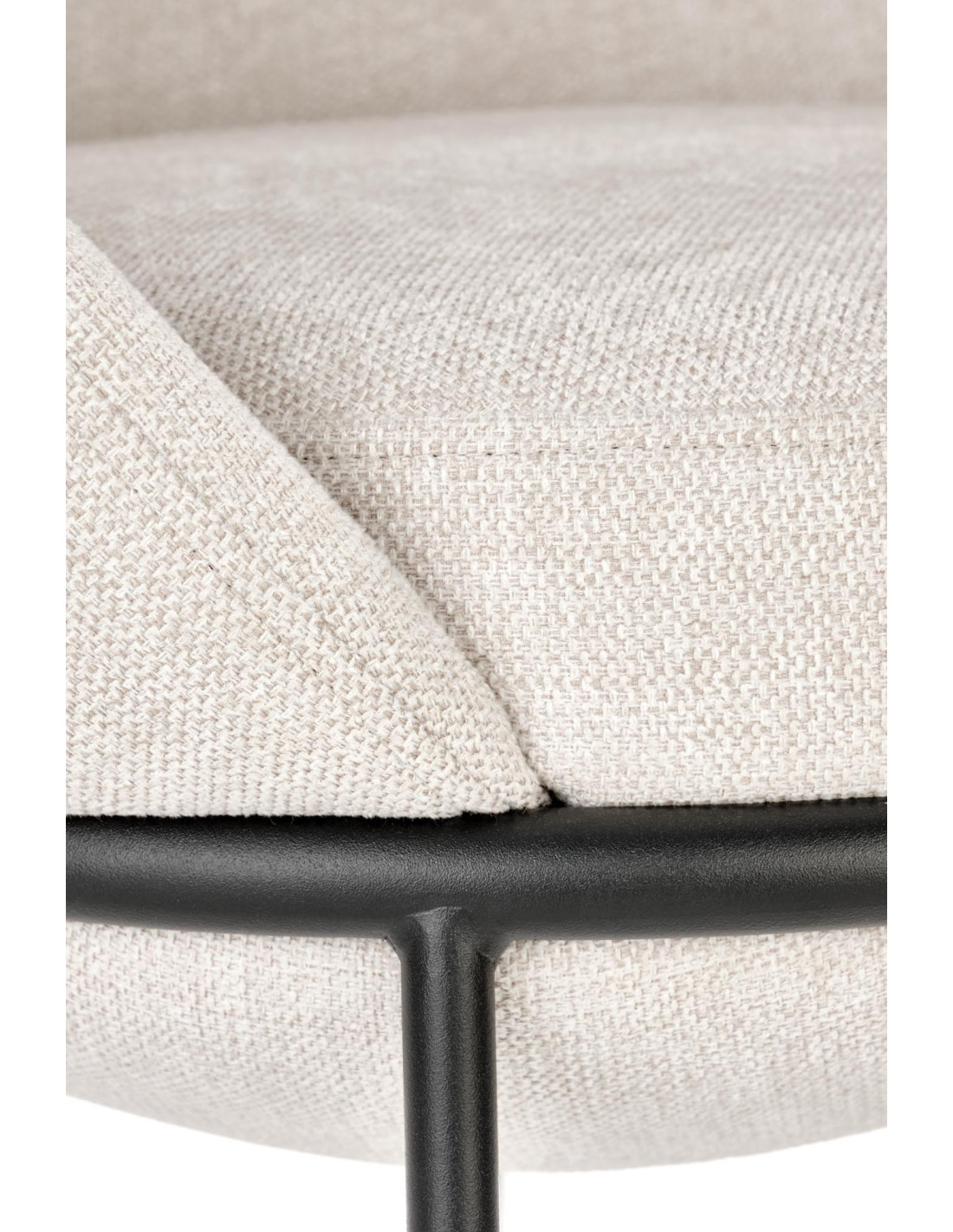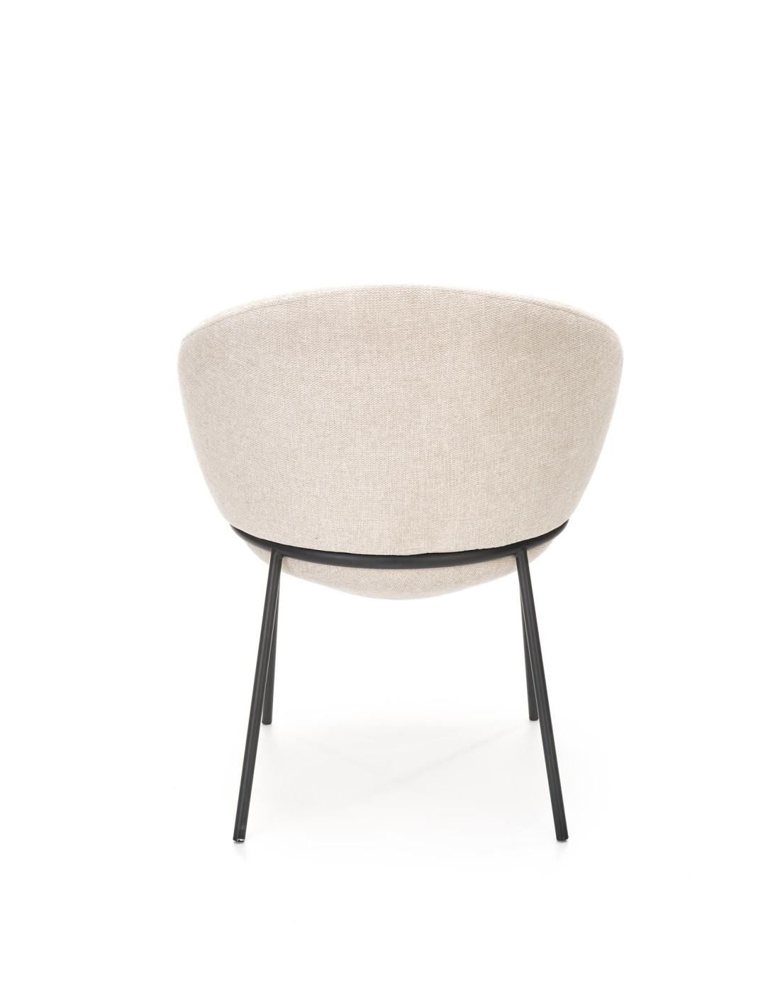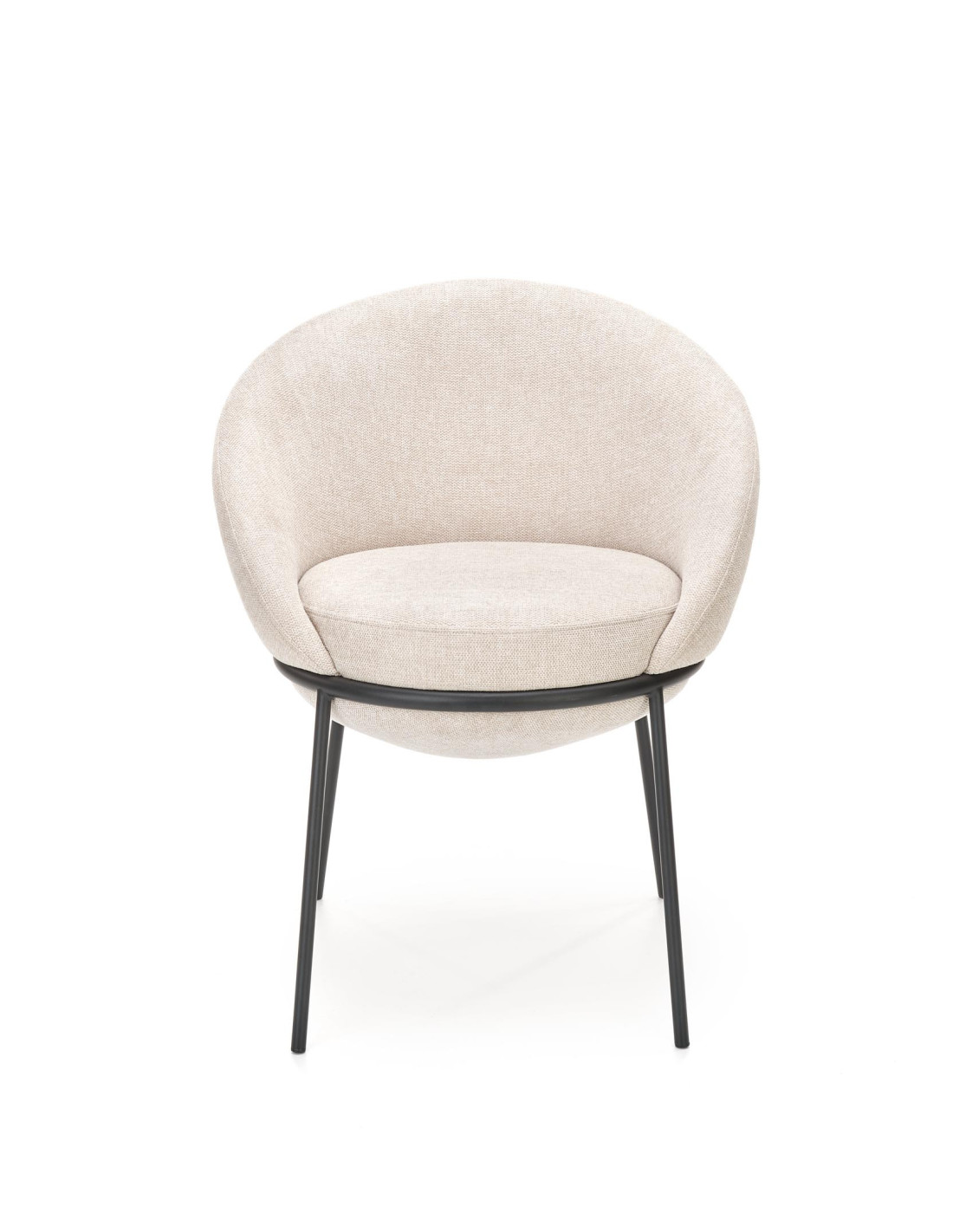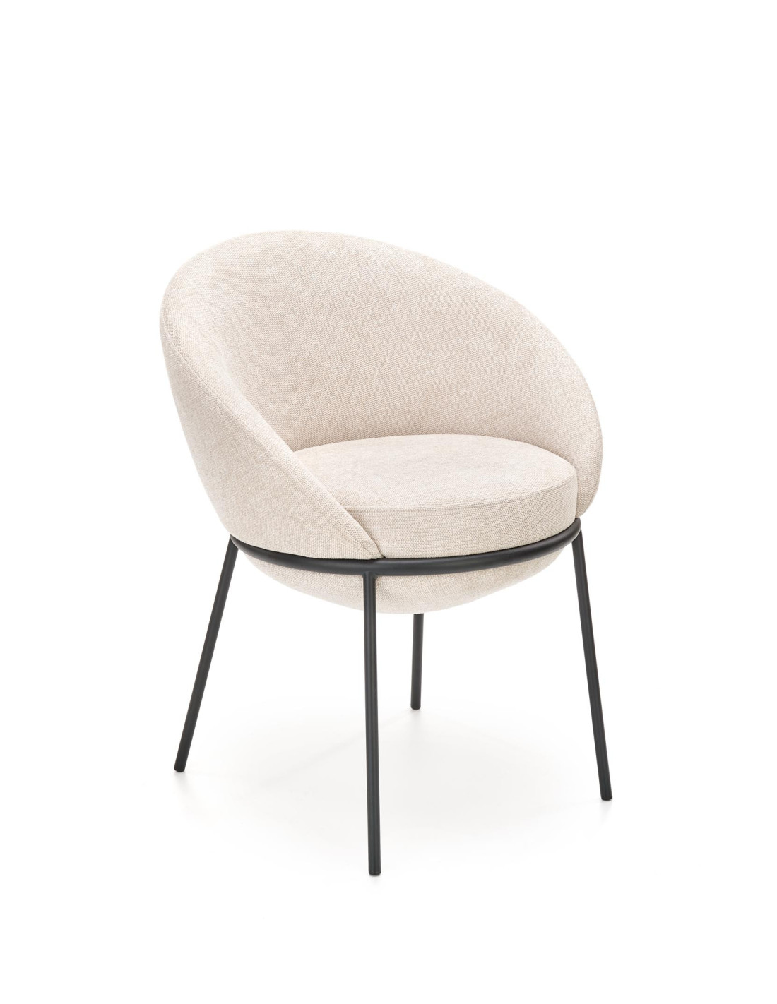 Krzesło wyróżnia się okrągłym siedziskiem, miękkim obiciem oraz nowoczesnym designem z czarnymi metalowymi nogami.