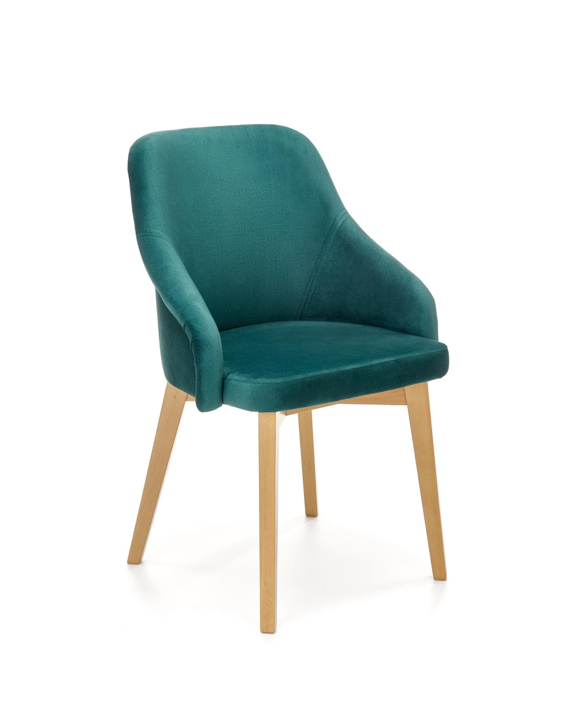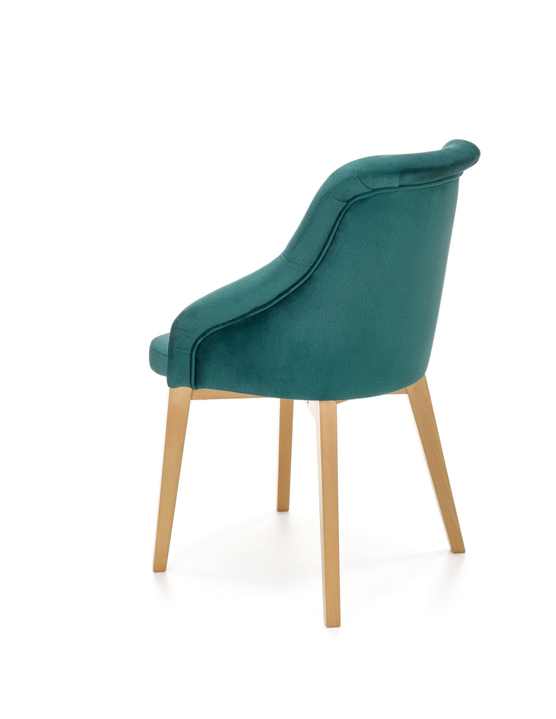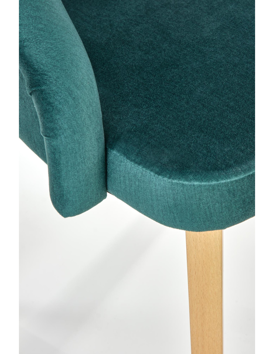 Krzesło charakteryzuje się ciemnozielonym obiciem, zaokrąglonym siedziskiem oraz nogami z drewna miodowego dębu.