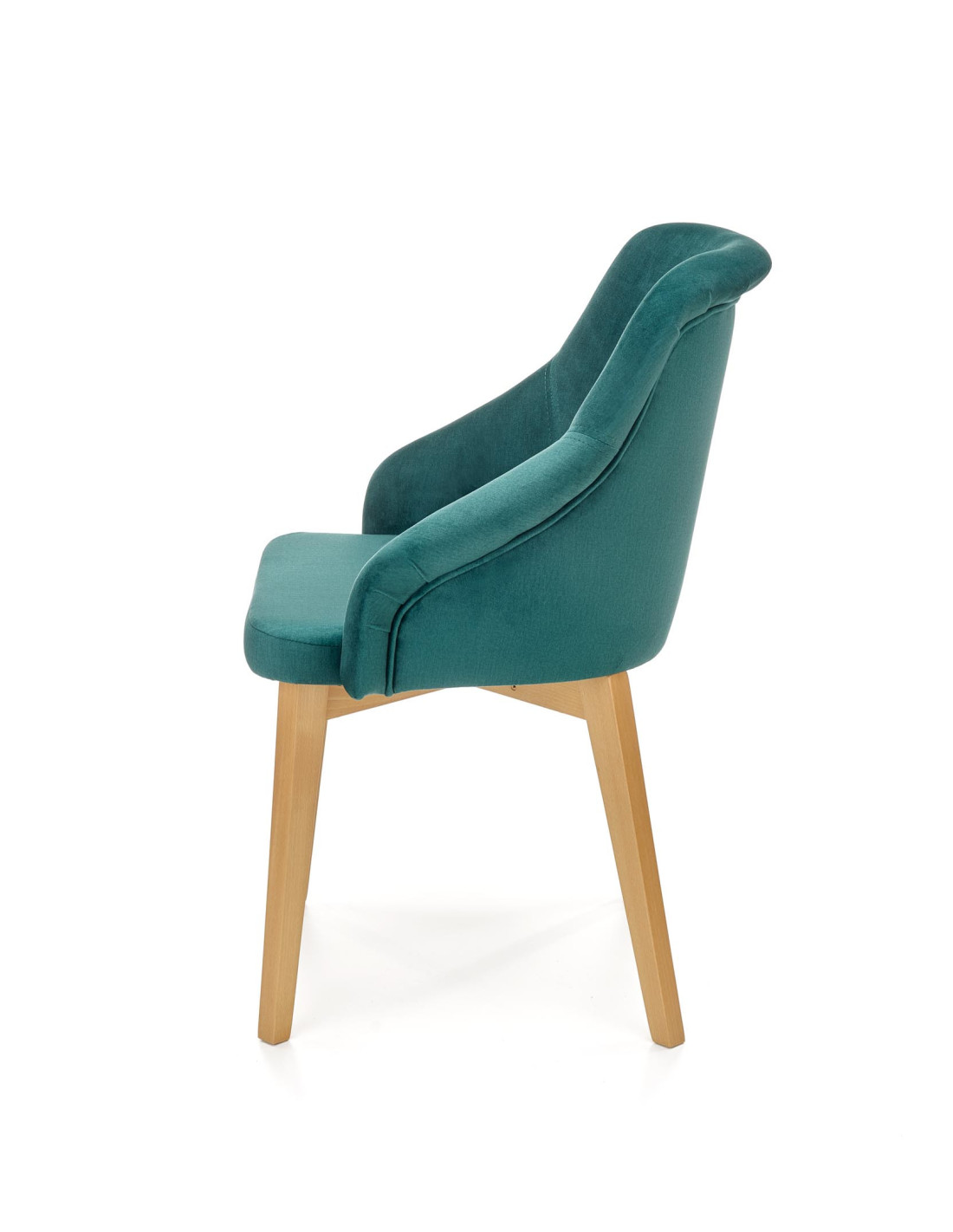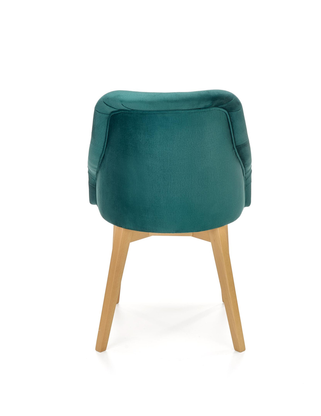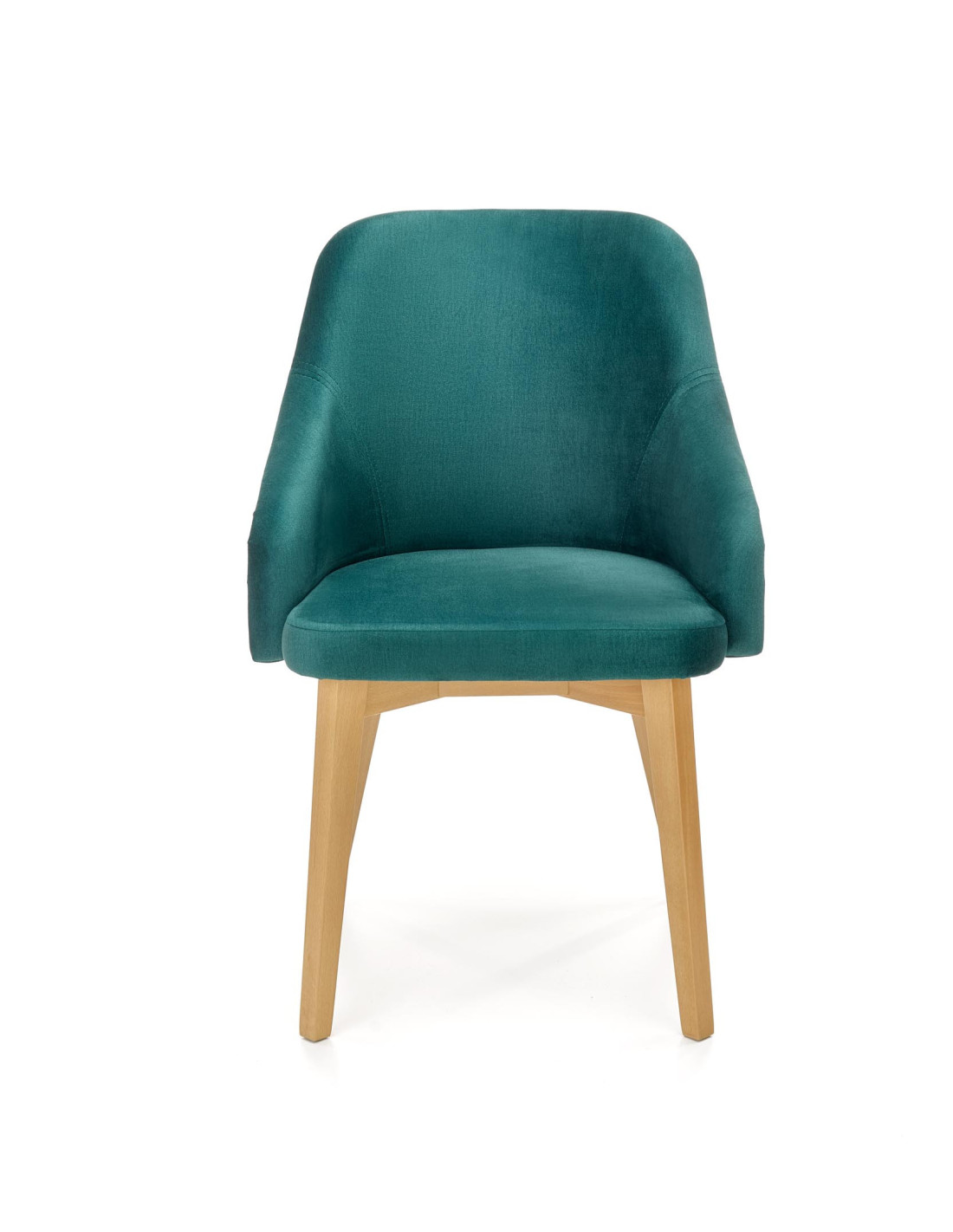 Krzesło charakteryzuje się ciemnozielonym obiciem, zaokrąglonym siedziskiem oraz nogami z drewna miodowego dębu.