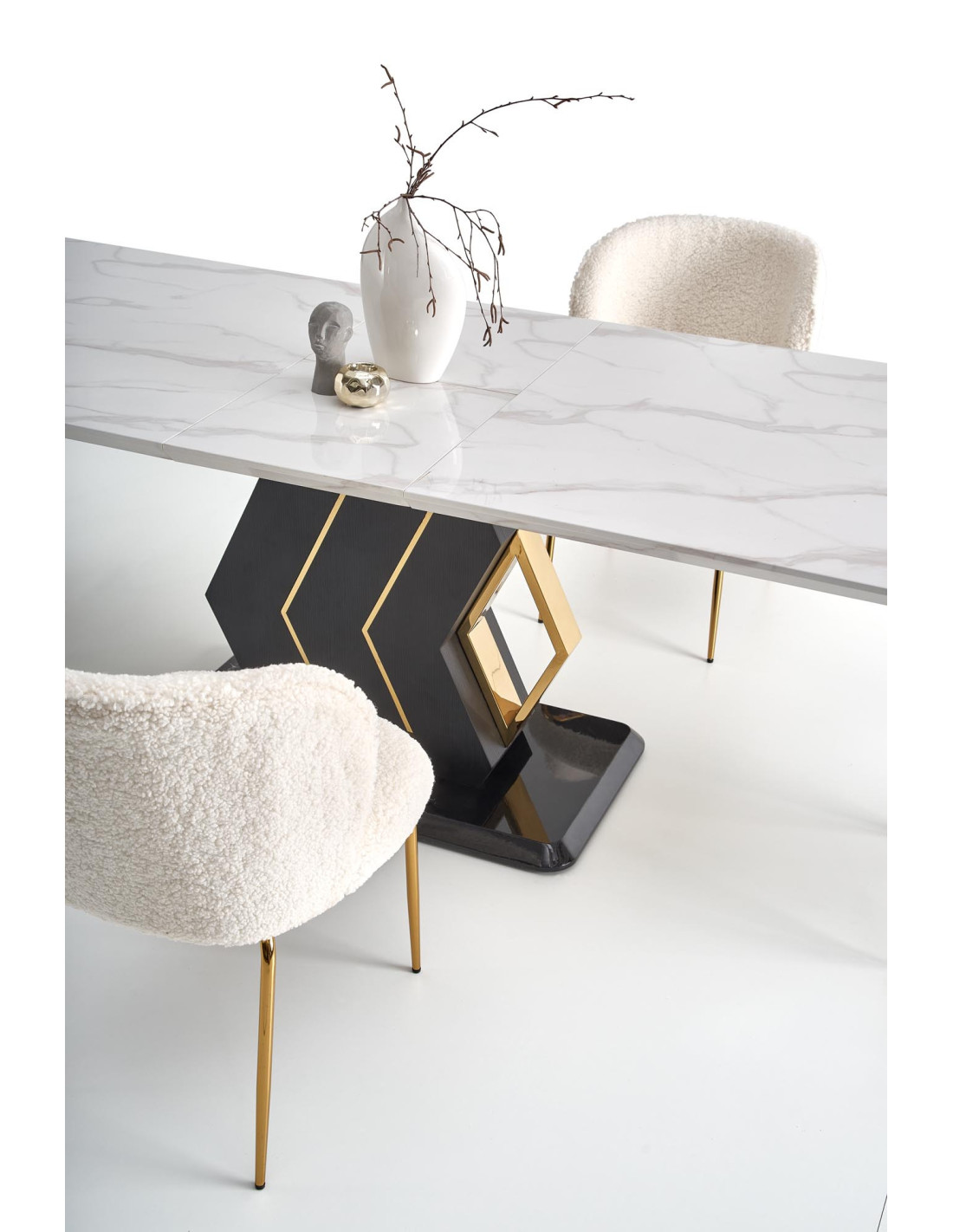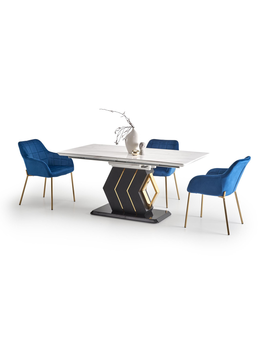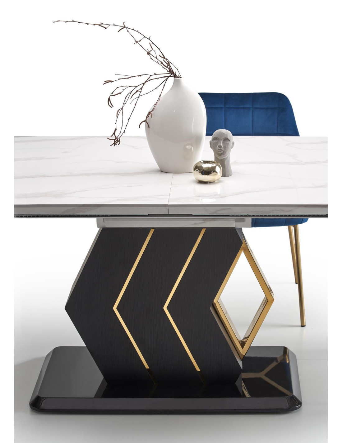 Wzbogać swoje wnętrze rozszerzanym stołem VINCENZO, który doskonale łączy elegancję z funkcjonalnością! Blat w kolorze białego marmuru oraz solidna czarna podstawa z geometrycznymi złotymi akcentami tworzą harmonijną całość, która z pewnością przyciągnie wzrok w Twoim domu. Starannie wykonany, stół VINCENZO to idealny wybór do wnętrz w stylu glamour oraz nowoczesnym.