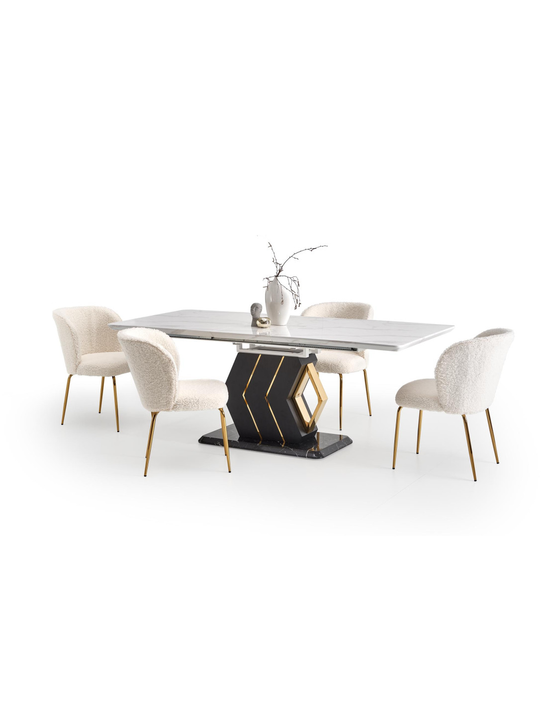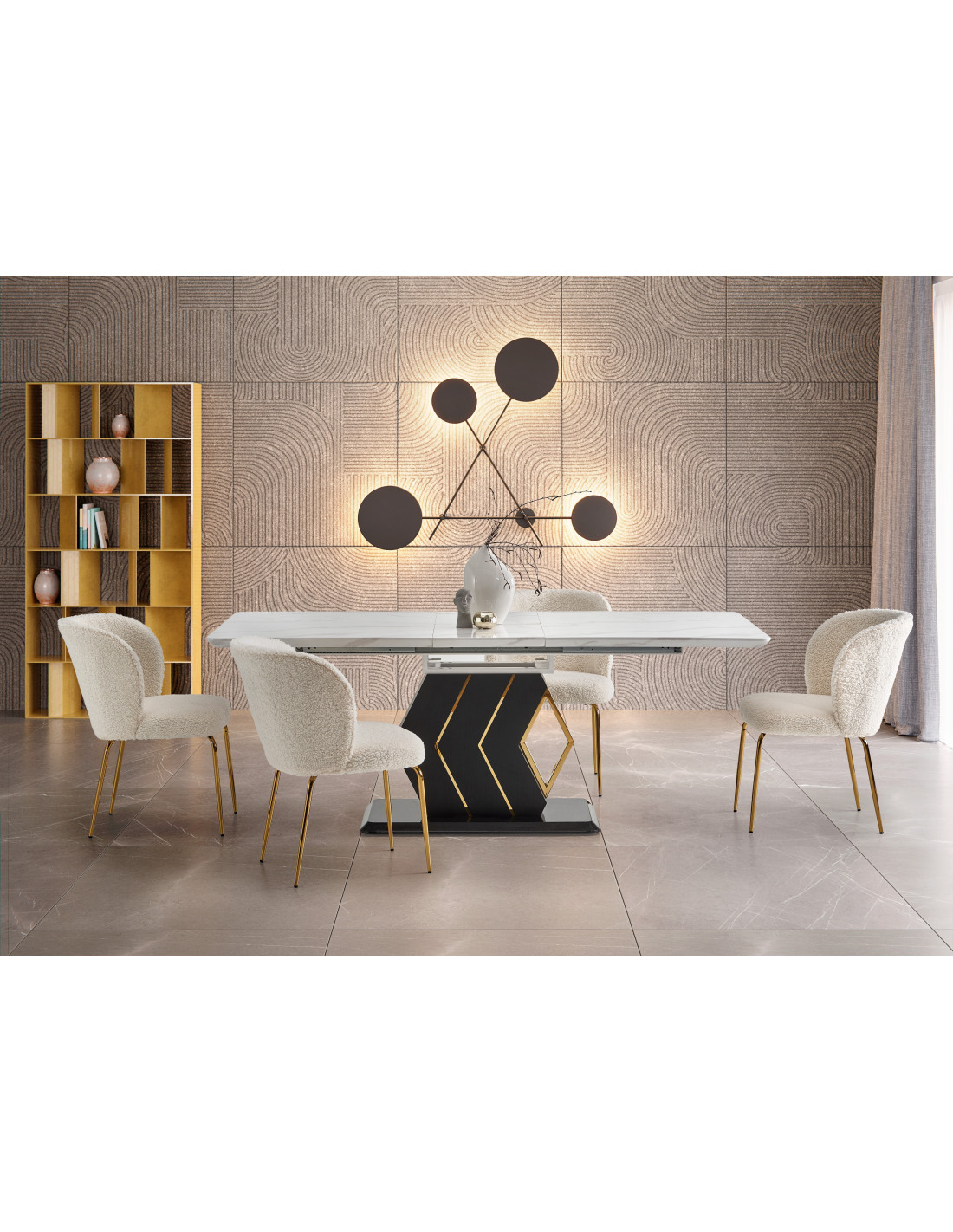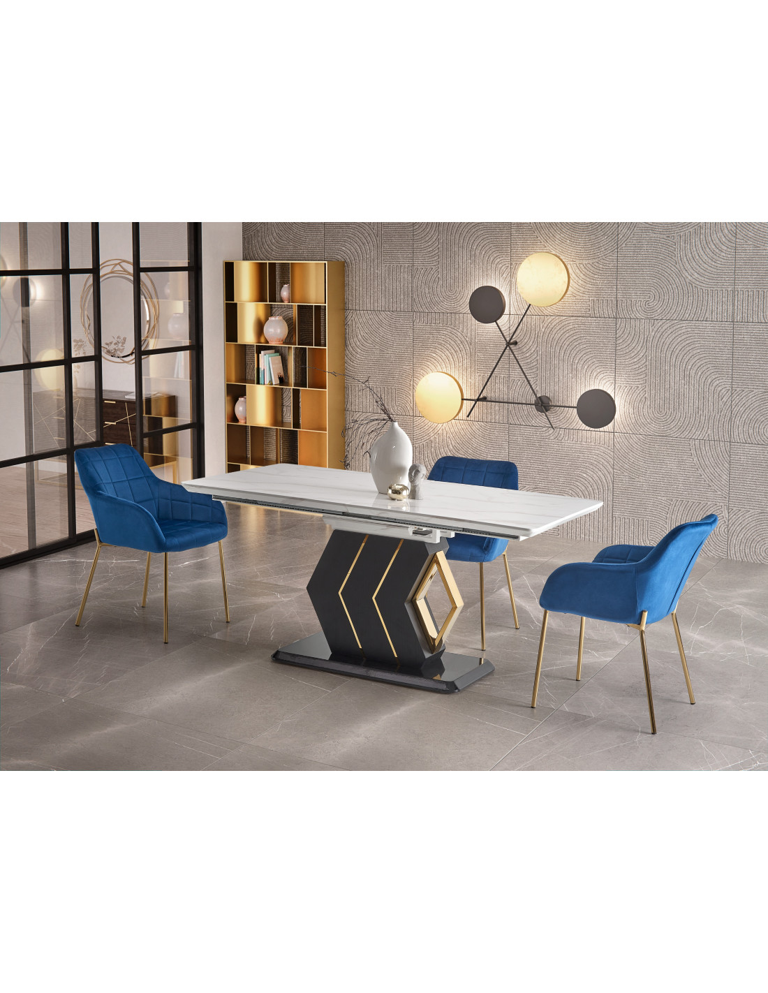 Wzbogać swoje wnętrze rozszerzanym stołem VINCENZO, który doskonale łączy elegancję z funkcjonalnością! Blat w kolorze białego marmuru oraz solidna czarna podstawa z geometrycznymi złotymi akcentami tworzą harmonijną całość, która z pewnością przyciągnie wzrok w Twoim domu. Starannie wykonany, stół VINCENZO to idealny wybór do wnętrz w stylu glamour oraz nowoczesnym.