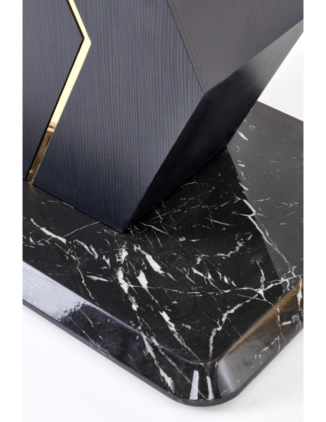 Stół VINCENZO dostępny jest w białym marmurze na blacie oraz czarnej podstawie z elementami złota, co czyni go wyjątkowym meblem.