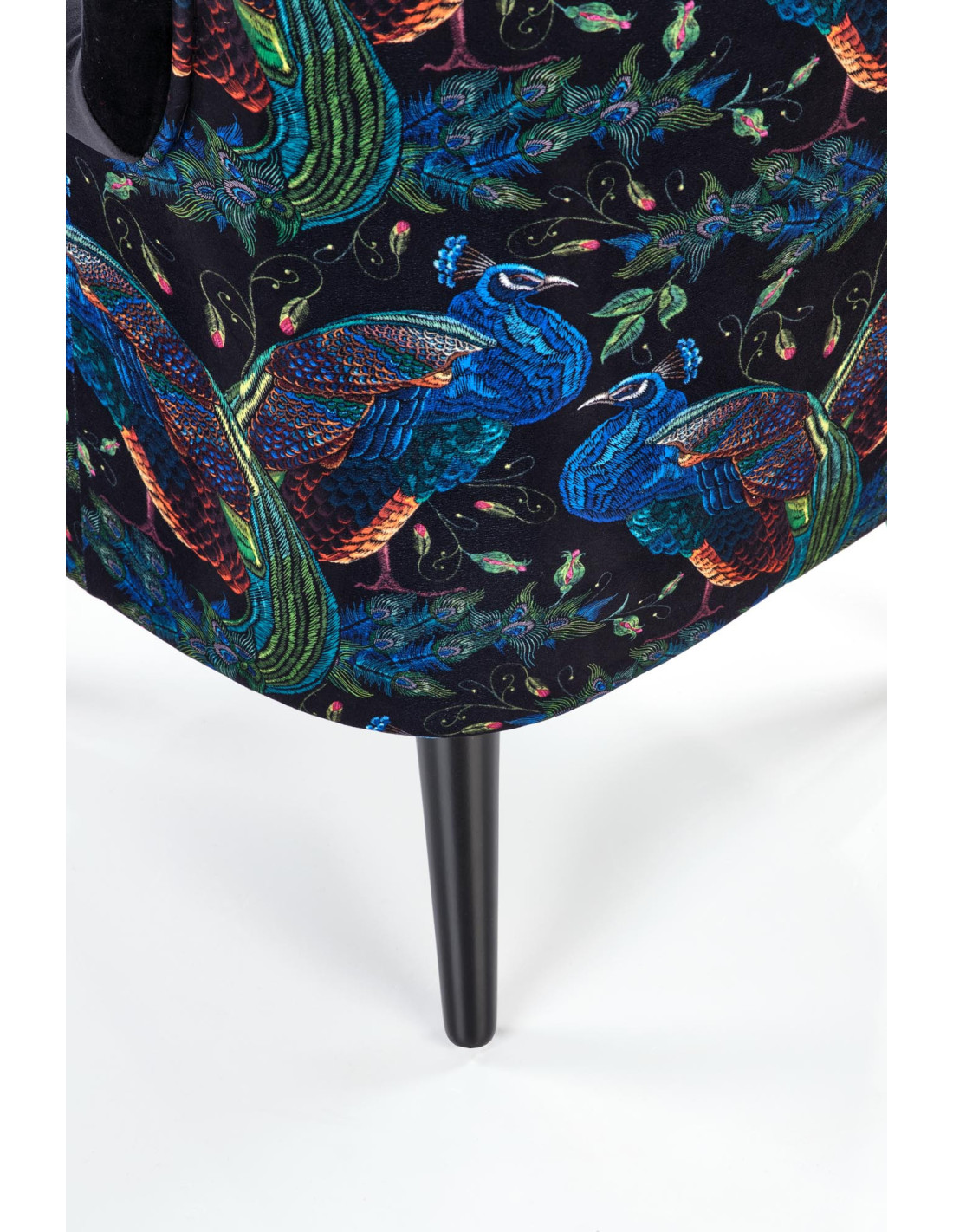 Fotel wyróżnia się kolorowym wzorem z motywem ptaków na bocznych częściach podłokietników, co sprawia, że stanie się on centralnym punktem każdego pomieszczenia. Idealnie nadaje się do salonu, biura czy domowego gabinetu, gdzie styl spotyka się z wygodą.