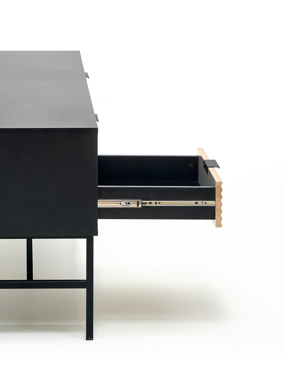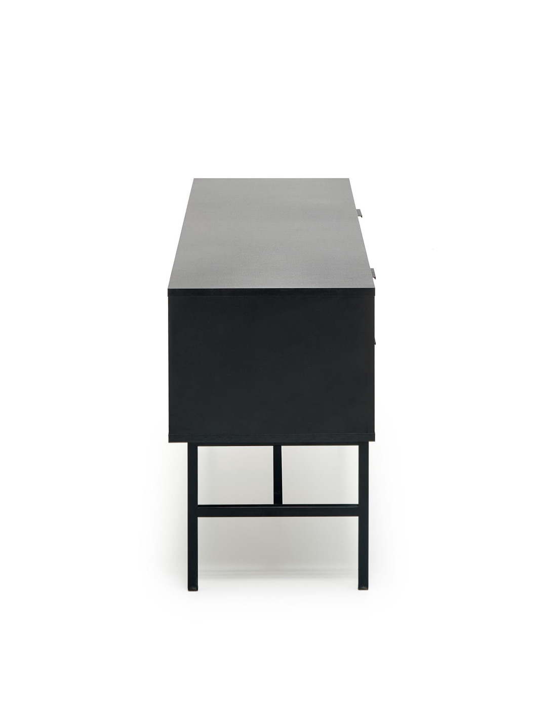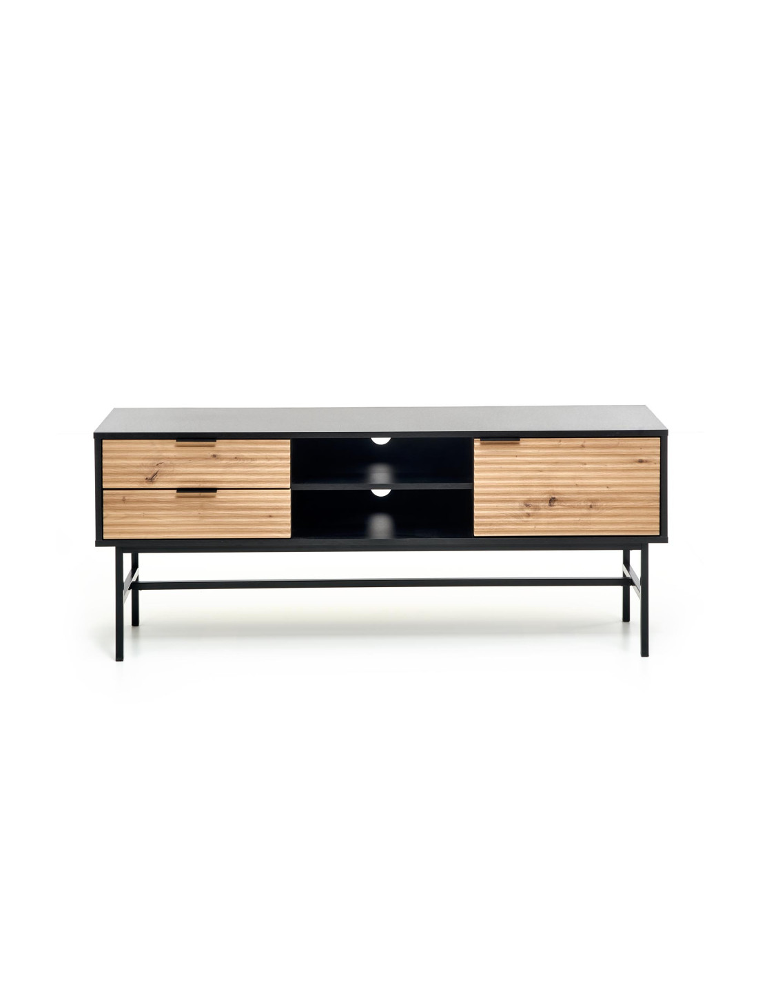 Stolik RTV MURANO został zaprojektowany z myślą o wygodzie użytkowania. Oferuje dwie pojemne szuflady po lewej stronie, dwie otwarte półki na środku, idealne na media, oraz drzwi po prawej stronie, które pomogą schować drobiazgi. Niskie metalowe nogi dodają mu nie tylko elegancji, ale także stabilności, co sprawia, że jest to luksusowy wybór do każdego nowoczesnego wnętrza.