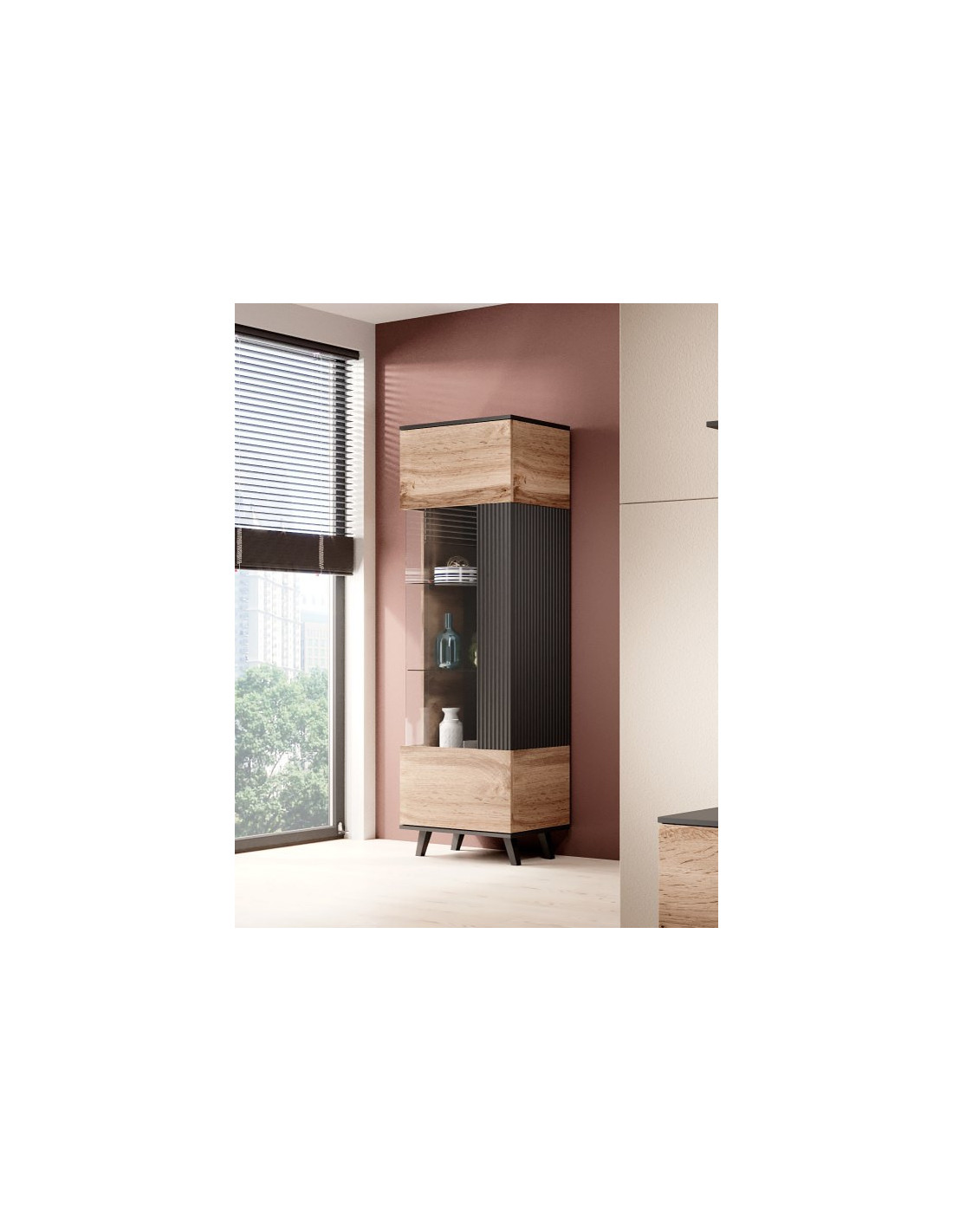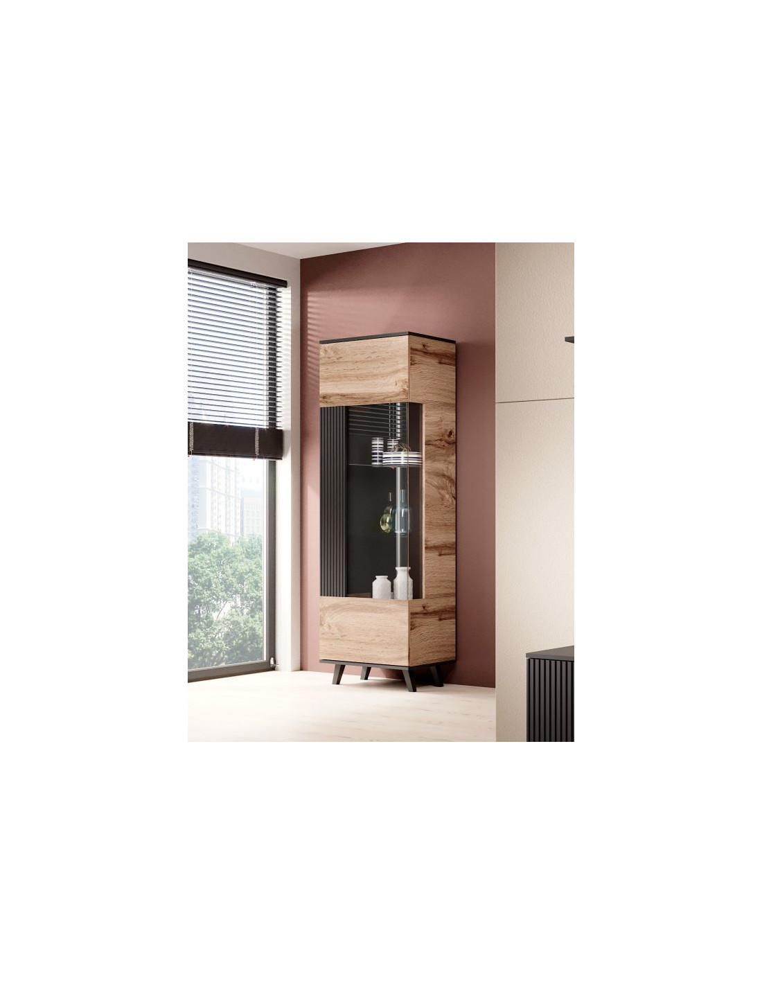Ciesz się nowym stylowym rozwiązaniem dla swojego wnętrza! Witryna RANDOM to połączenie nowoczesności z industrialnym akcentem. Jej prostokątny kształt oraz elegancki kolor dębu wotan harmonijnie współgrają z czarnymi elementami, tworząc centralny punkt w każdym pomieszczeniu. Cechą charakterystyczną są przeszklone drzwi, które nie tylko eksponują Twoje ulubione przedmioty, ale także dodają lekkości całej konstrukcji.