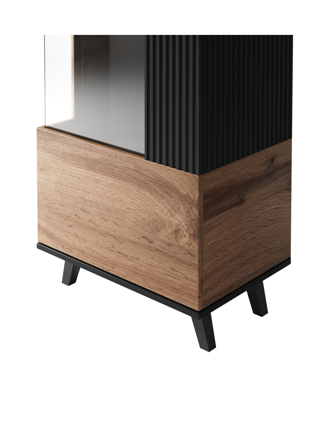 Witryna została zaprojektowana z myślą o funkcjonalności. Przeszklone drzwi z czarnymi, pionowymi żłobieniami po lewej stronie wprowadzają nowoczesny akcent, a solidna budowa na czterech krótkich nogach zapewnia stabilność. To perfekcyjne rozwiązanie do salonu, które łączy w sobie estetykę i praktyczność.