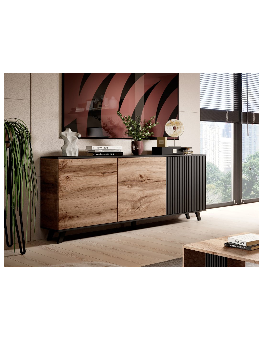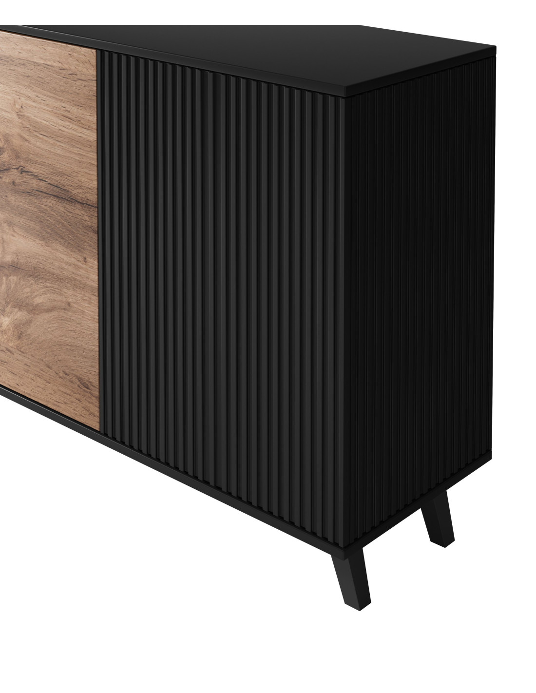 Dodaj odrobinę luksusu do swojego wnętrza! Komoda RANDOM KM-1 to perfekcyjne połączenie nowoczesnego designu z industrialnymi akcentami. Jej prostokątny kształt oraz wyjątkowe połączenie kolorów sprawiają, że staje się niezwykle stylowym elementem każdego pomieszczenia. Czarne fronty z pionowymi żłobieniami świetnie kontrastują z naturalnym wykończeniem dębu wotan, które eksponuje sęki i naturalny wzór drewna, tworząc harmonijną całość.