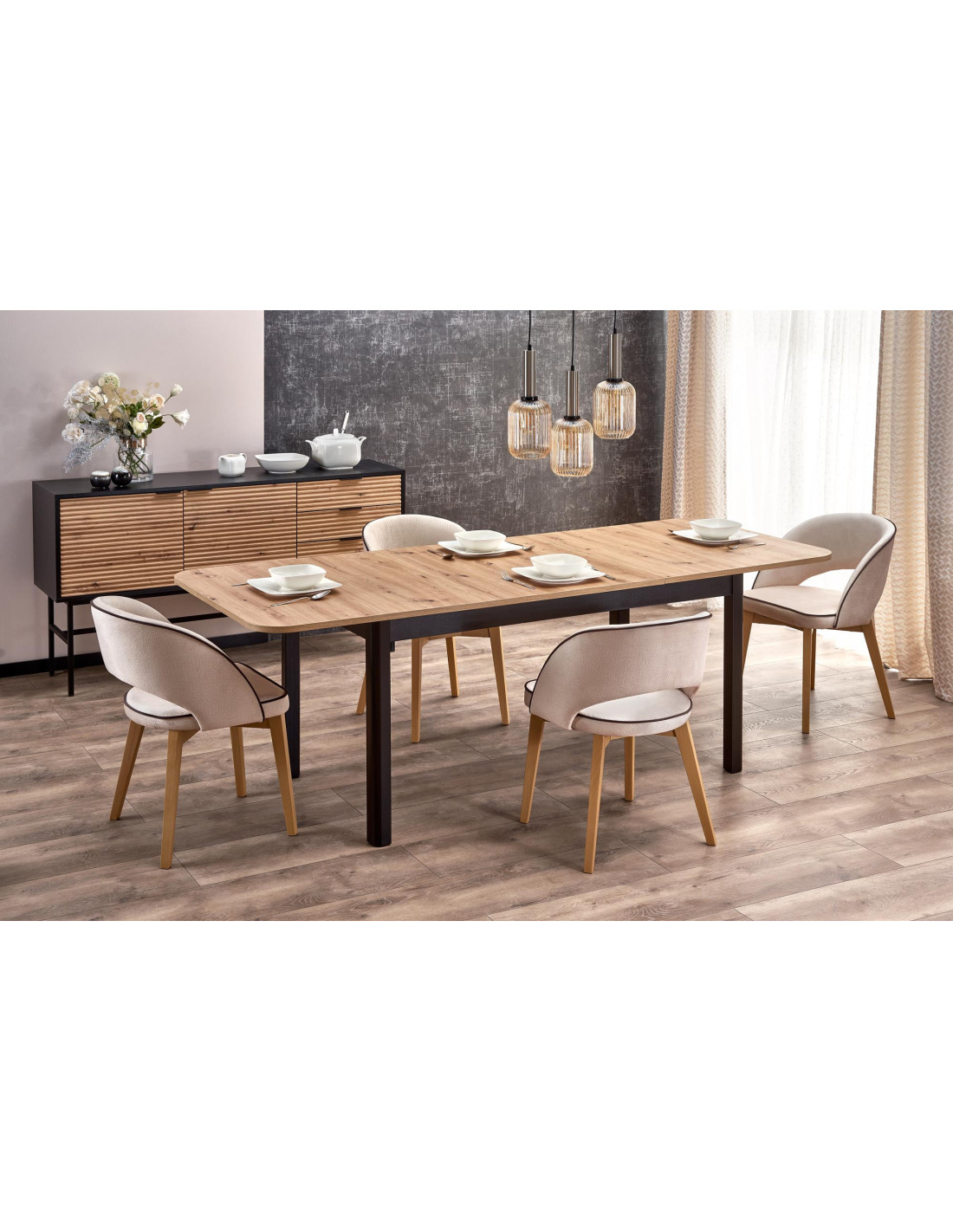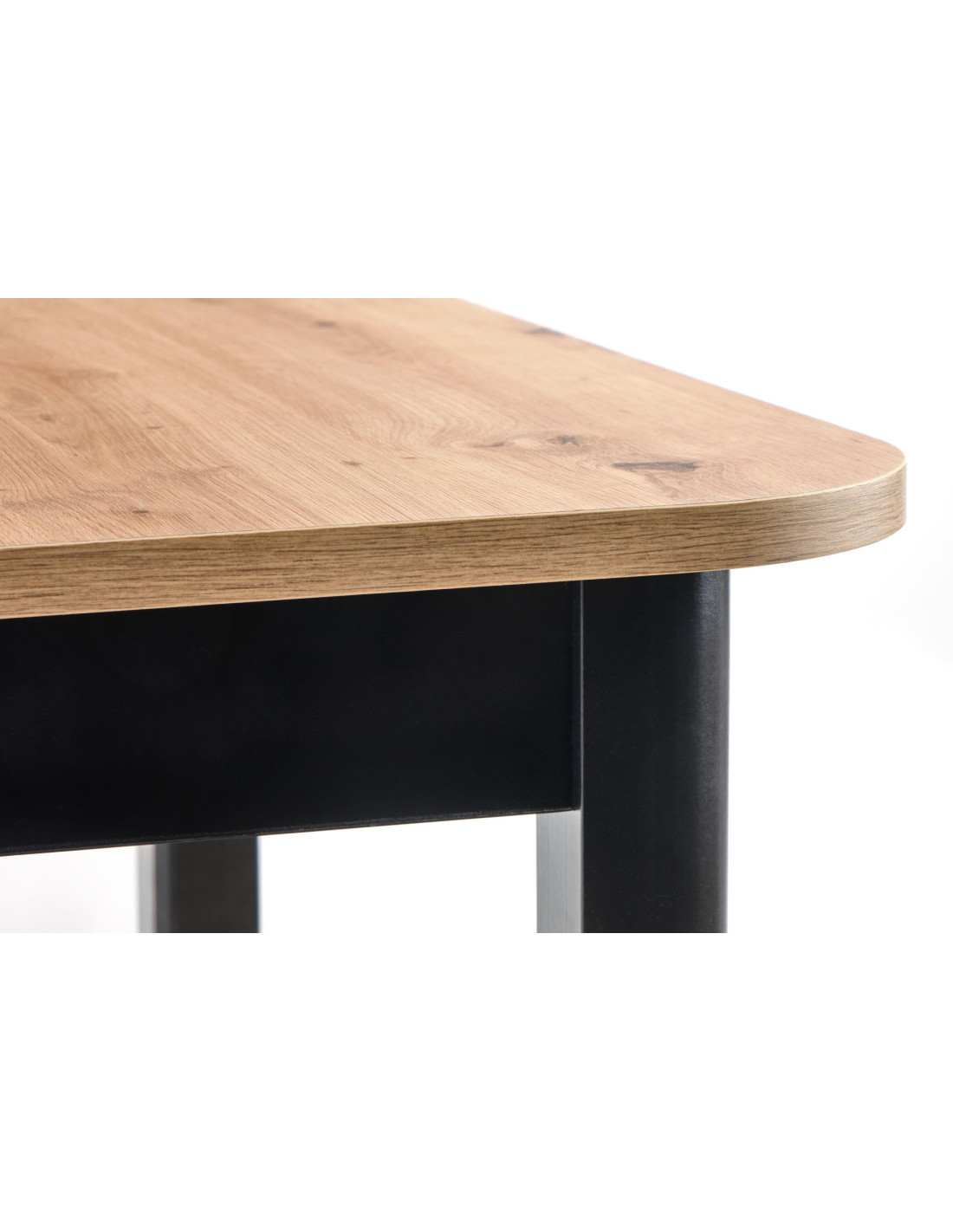 Wybierz rozszerzany stół FLORIAN, który łączy nowoczesny styl z funkcjonalnością! Jego dąb artisanowy blat w połączeniu z czarnymi nogami tworzy harmonijną całość, która idealnie wpasuje się w każde wnętrze. Dzięki przemyślanej konstrukcji i starannie dobranym materiałom, ten stół stanie się centralnym punktem Twojej jadalni lub salonu, zachęcając do wspólnych posiłków i spotkań.