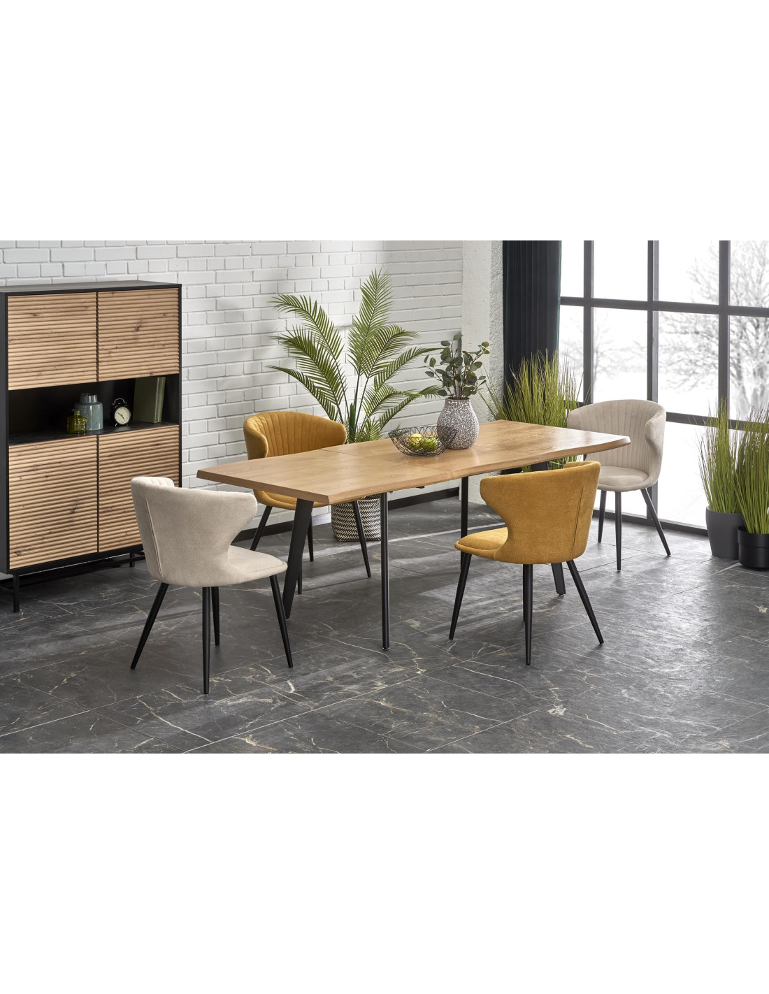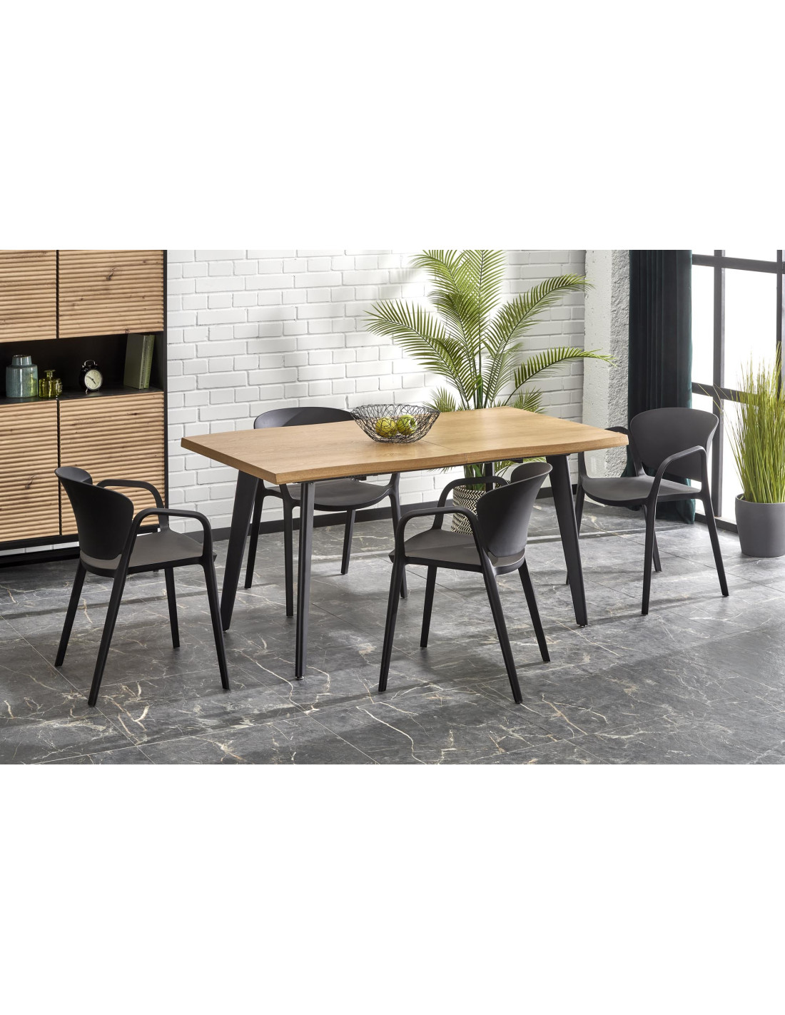 Stół VIOLANT2 wykonany jest z płyty MDF pokrytej okleiną naturalną w odcieniu dębu oraz stalowych nóg malowanych proszkowo na czarno.